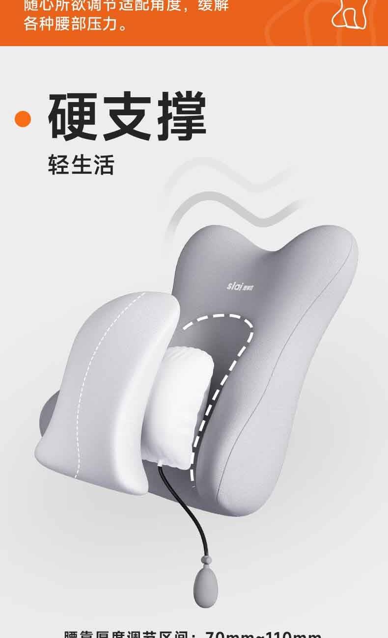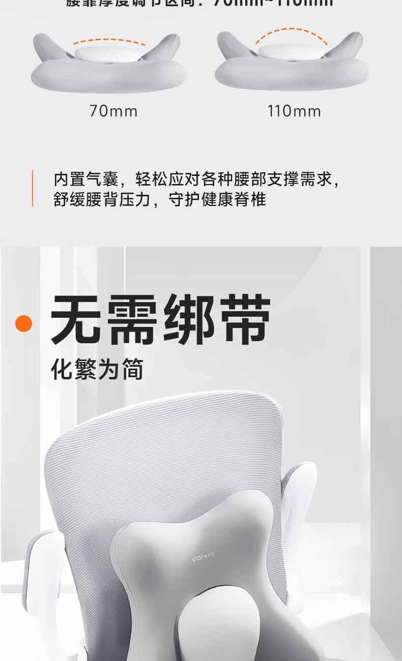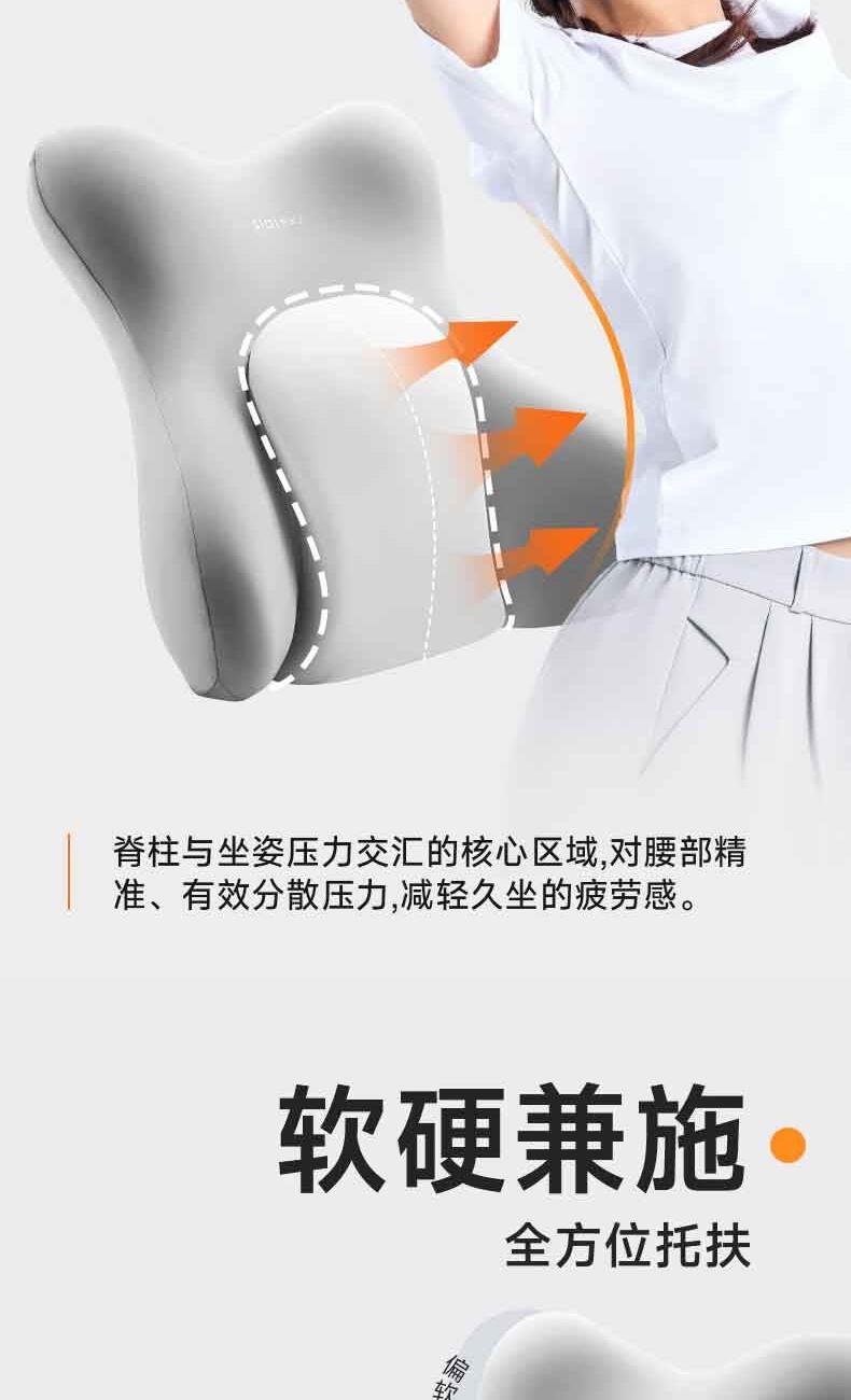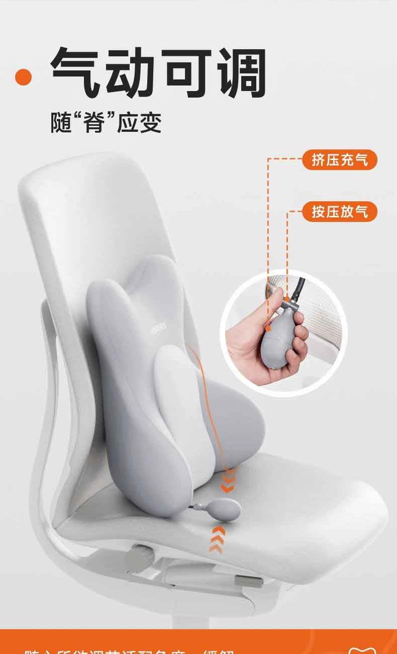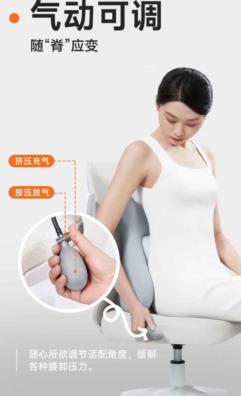 【气动调节】随心所欲调节适配角度。 【超级饱满支撑】凸起中心密度加强,顶住酸痛点。 【冰感丝材质布套】丝滑触感,久靠不闷热。 【加高设计】侧面加长,底部加宽,坐立也不会倒。 【造型独特设计】X形包裹环形托付后背。
