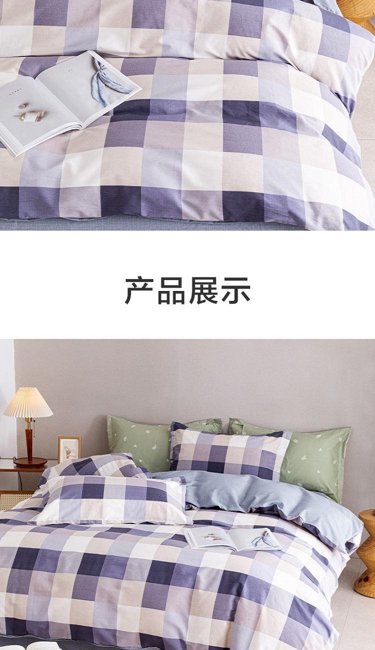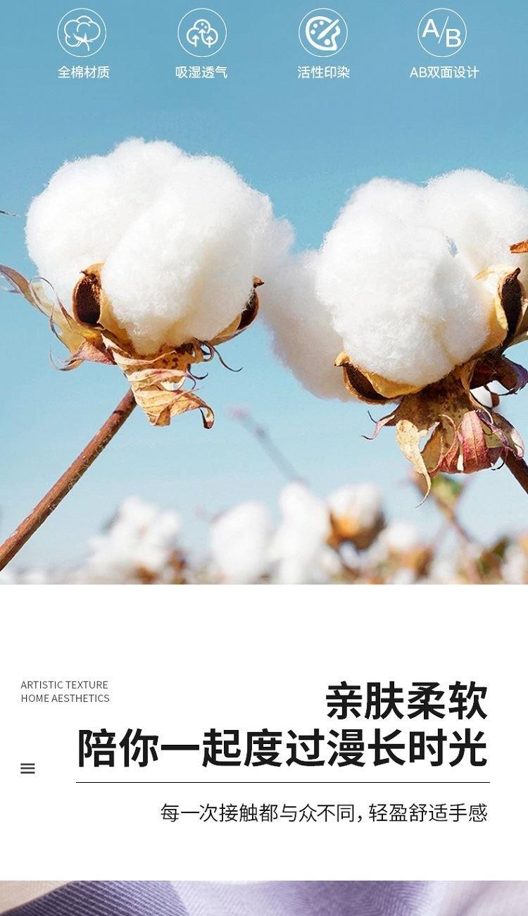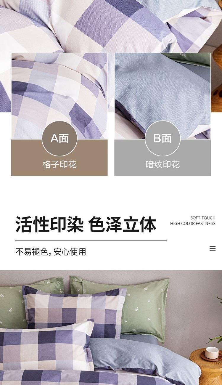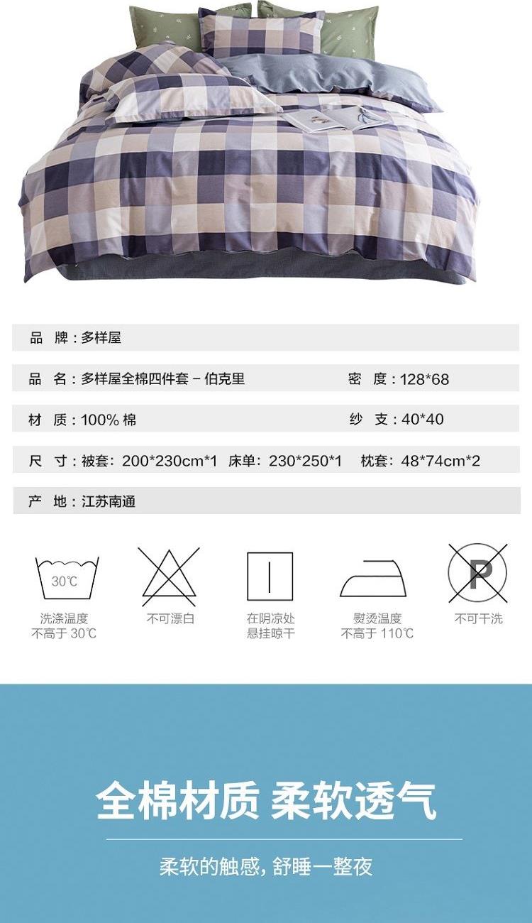 材质:棉 规格:被套*1:200*230cm,床单*1:230*250cm,枕套*2:48*74cm 纱支:40*40,适合1.5~1.8米标准床 包装:软pvc袋 (手提礼盒包装需另外支付礼盒费用) 特点:甄选阳光好棉,柔软透气,舒适耐用,私享高质量睡眠。 圆网印花,环保染料,安心贴肤;色彩靓丽,着色牢固不易褪色。 A/B双面,随心易搭配。