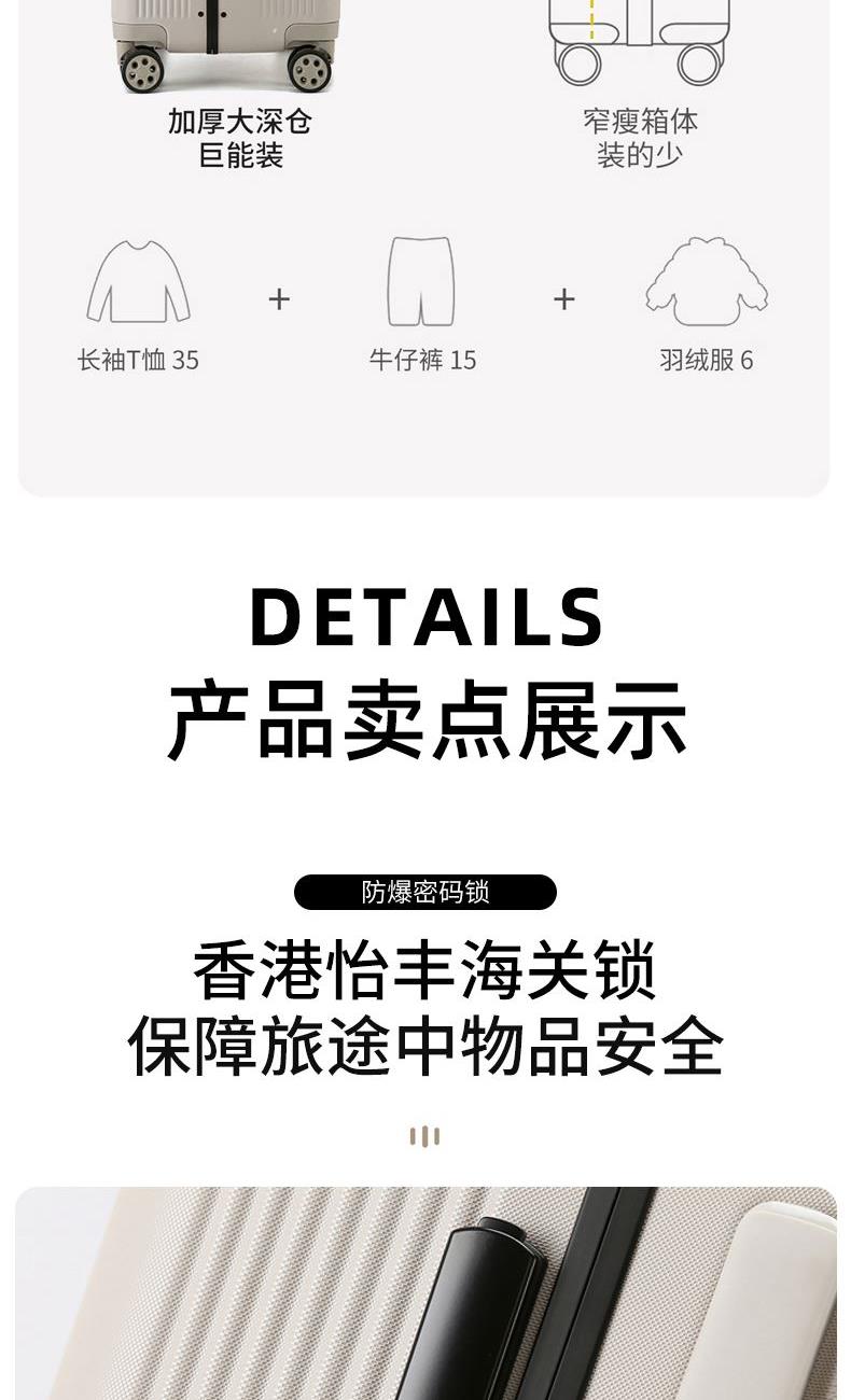 产品卖点:德国拜耳PC材质,质地轻盈,高耐热、抗冲击、阻燃、刚硬、柔韧(可踩、摔不变形),犹如护盾般保护着箱内物品;