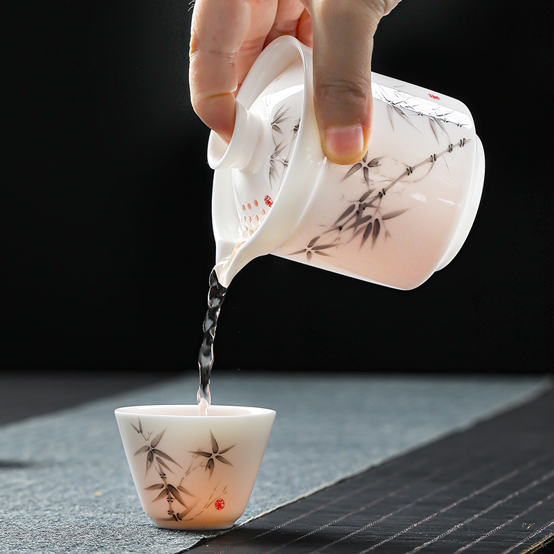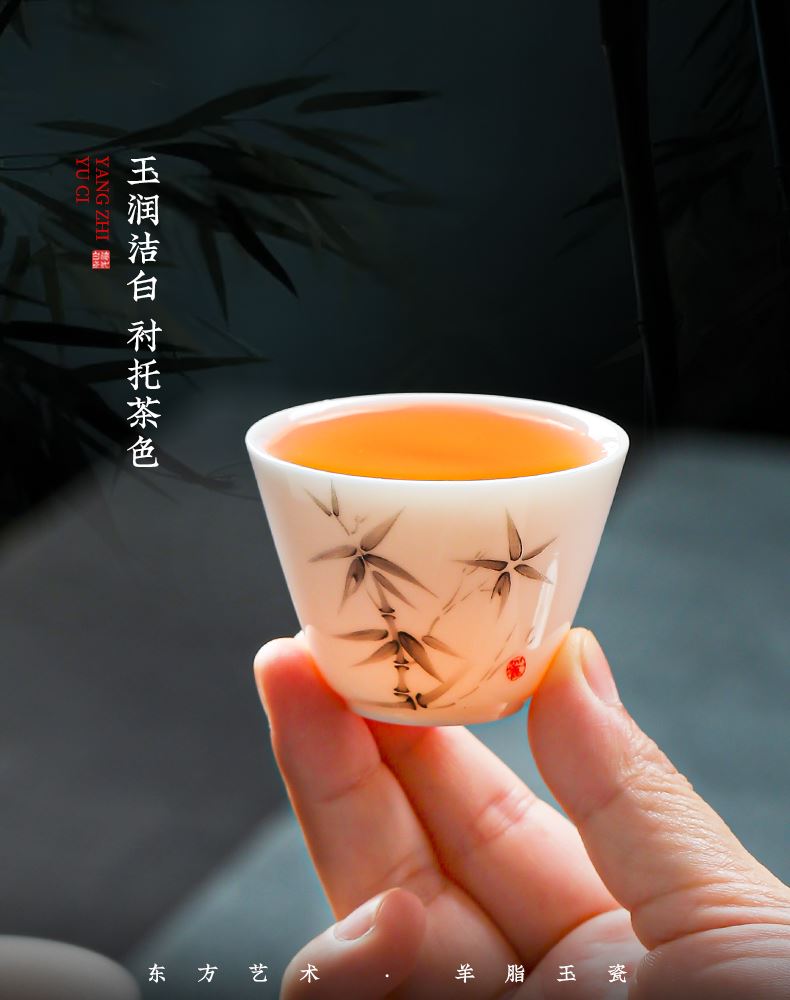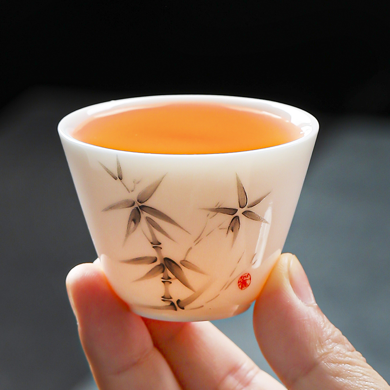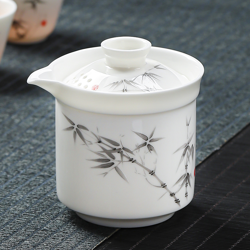 手抓壶1:9cm*9cm 180ml 茶杯3:5.6cm*4cm 39ml 旅行包1:11.5cm*11.5cm*11.5cm 优质羊脂玉瓷,高温烧制。瓷化强度高,不吸味,易清洗。 釉面光滑细腻,触感温润如玉。洁白如雪,细腻通透。 墨竹图案,简约大气,自带风骨。 一体收纳,携带方便,多场合可用。