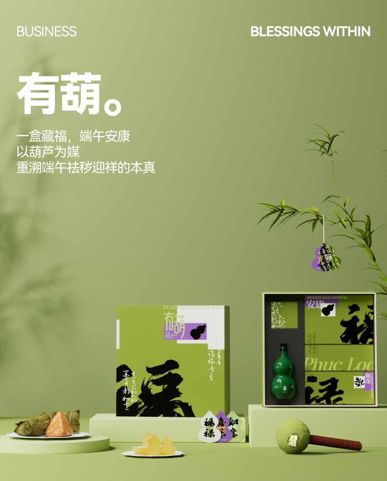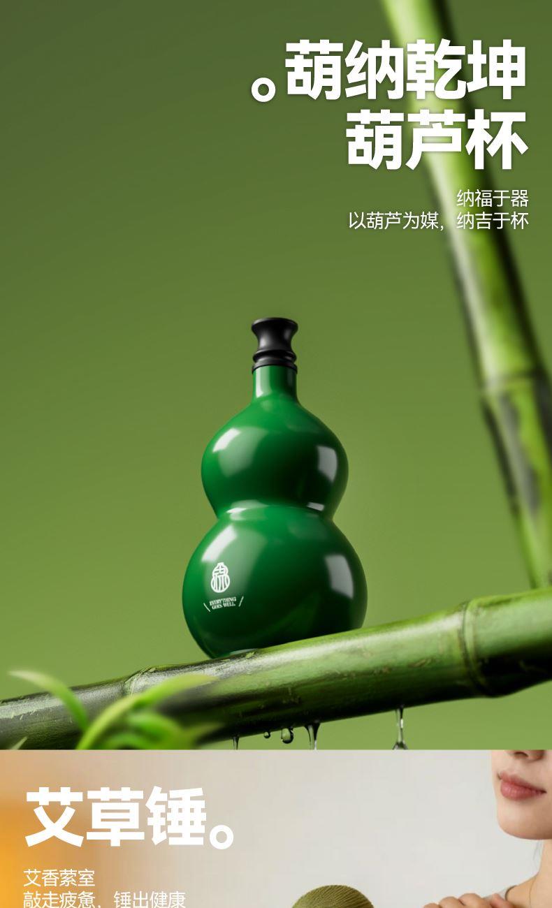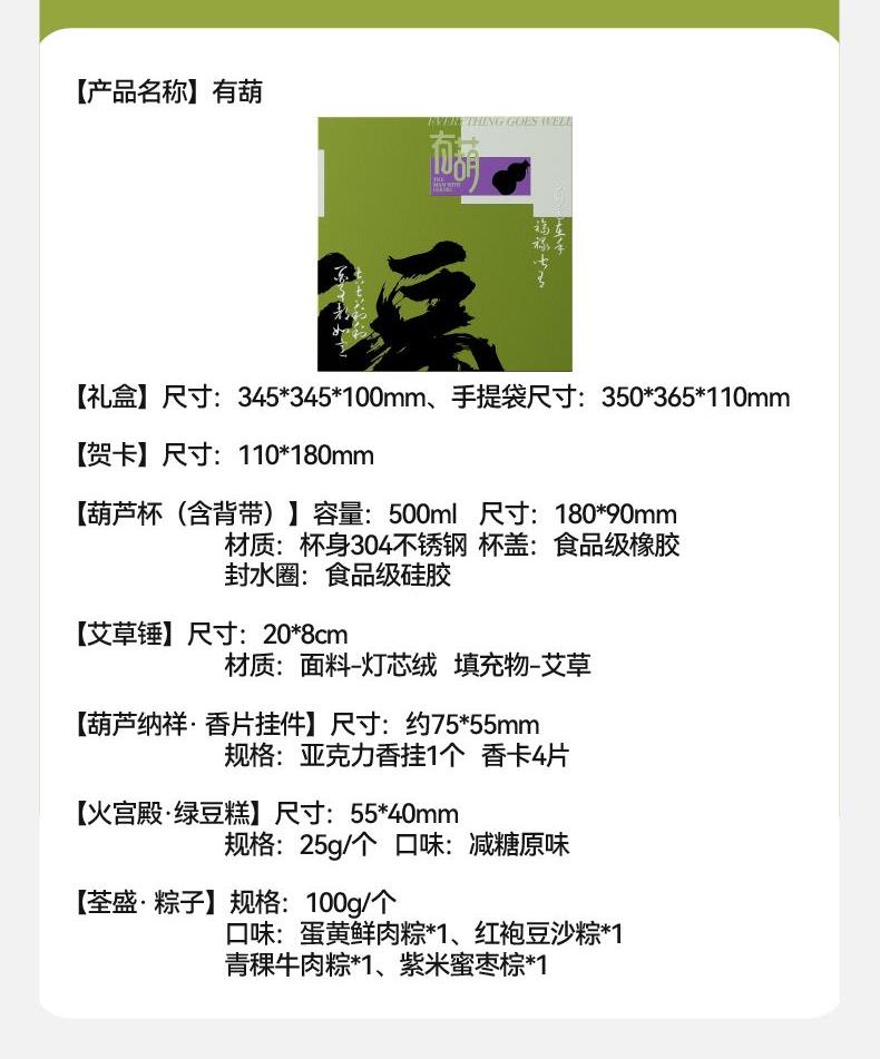葫芦自古为天地灵气所钟,其圆润双腹 既合阴阳调和之道,又纳五谷丰登之吉 端午逢仲夏,万物繁盛而邪气易生 葫芦因"藤蔓绵延、籽粒丰盈" 遂成驱疫纳福之载体,承载先民对安康岁稔的恒久祈愿 以葫芦为媒,融书法之古拙、器型之圆满,重溯端午祛秽迎祥的本真 葫芦纳吉,岁岁长安康,艾香萦室,事事皆顺遂 内配: 配置一:礼盒&手袋x1 配置二:荃盛·粽子x4 配置三:【葫纳乾坤】葫芦杯(含背带)X1 配置四:艾草锤X1 配置五:时尚葫芦香片挂件X1 香片x4 配置六:火宫殿·绿豆冰糕x6 配置七:贺卡x1