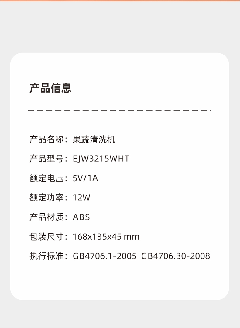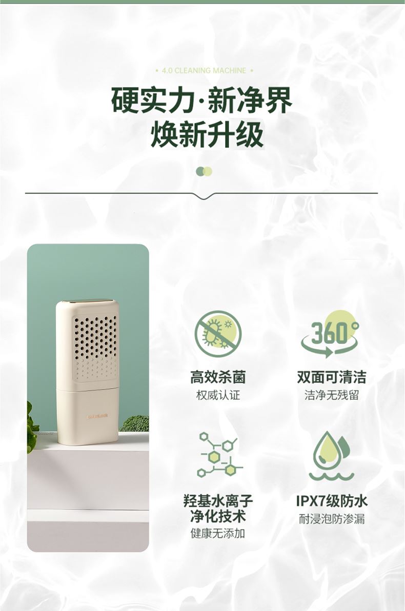 功率:12W 电压:5V/1A 材质:ABS 毛重:0.5Kg 材质:外壳ABS 彩盒包装尺寸:168x135x45mm 外箱包装尺寸:600*560*190mm 推荐理由: 1、磁吸充电方式,用USB充电,携带方便 2、使用先进的羟基消毒技术,除 菌率达99.9%,除农残率达94.5% 3、适用自来水,过滤水等不同水质 4、机身可拆卸清洗,持续续航,安全不漏电