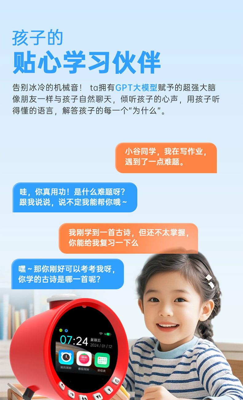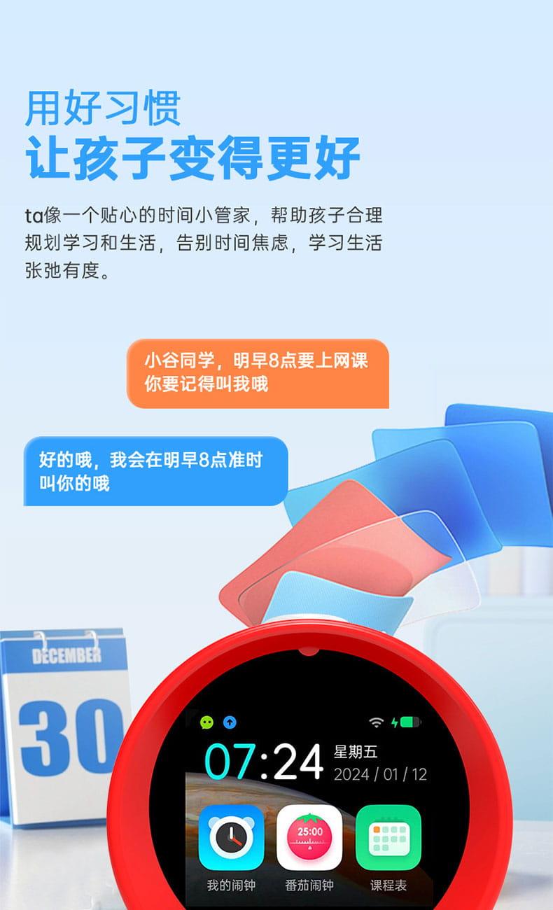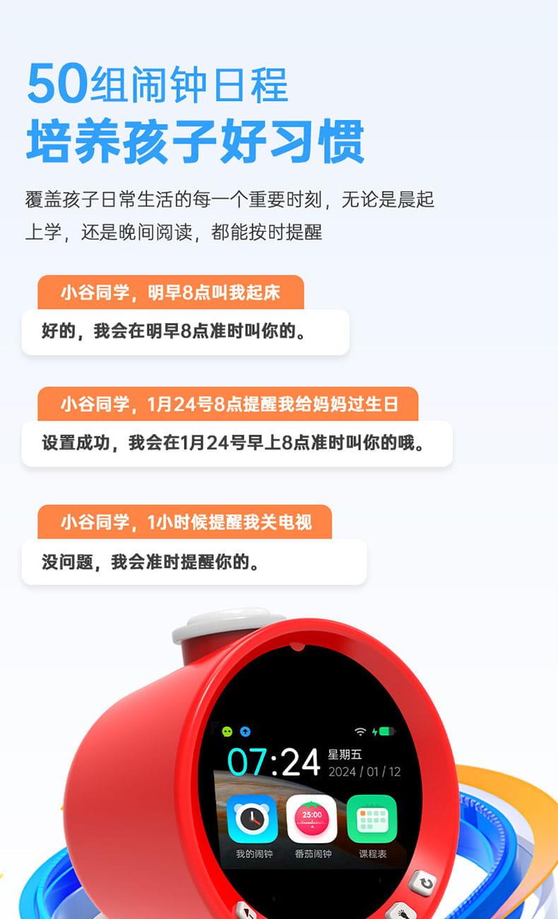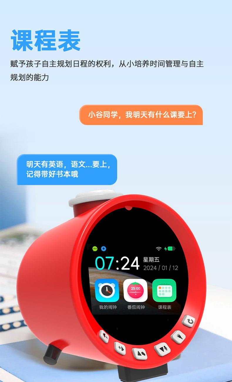 产品尺寸:150*150*100mm 电池容量:2000mAh 操作方式:单点触摸 连接方式:蓝牙、WIFI 产品颜色:红色 整套毛重:350g 整箱数量:60 智能语音交互,语音唤醒,智能问答,语音查词 番茄时间管理法,可设置50组闹钟 内置喜马拉雅少儿 K12全科教材在线同步学习