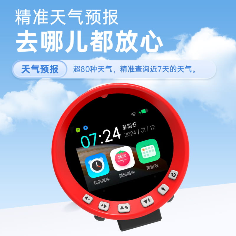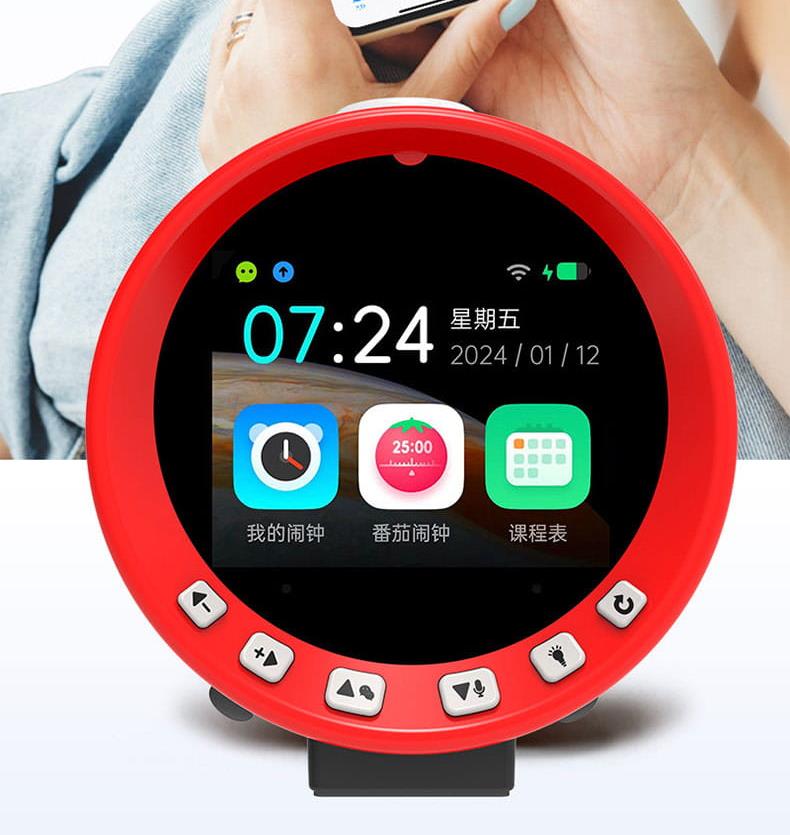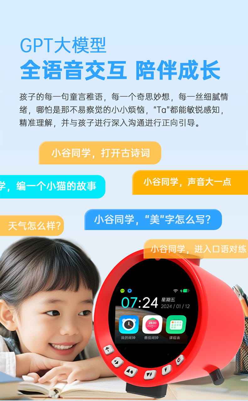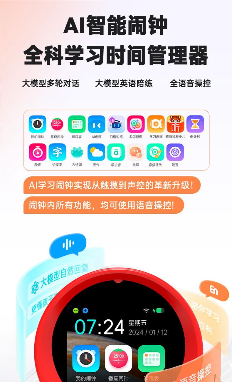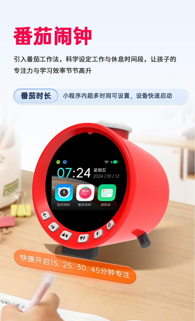 产品尺寸:150*150*100mm 电池容量:2000mAh 操作方式:单点触摸 连接方式:蓝牙、WIFI 产品颜色:红色 整套毛重:350g 整箱数量:60 智能语音交互,语音唤醒,智能问答,语音查词 番茄时间管理法,可设置50组闹钟 内置喜马拉雅少儿 K12全科教材在线同步学习