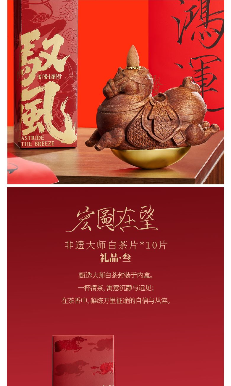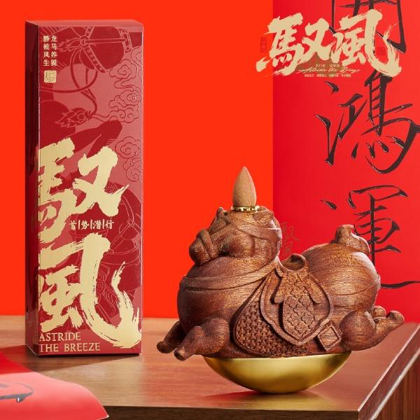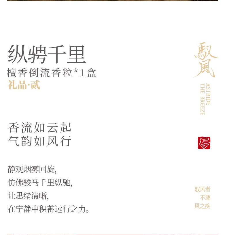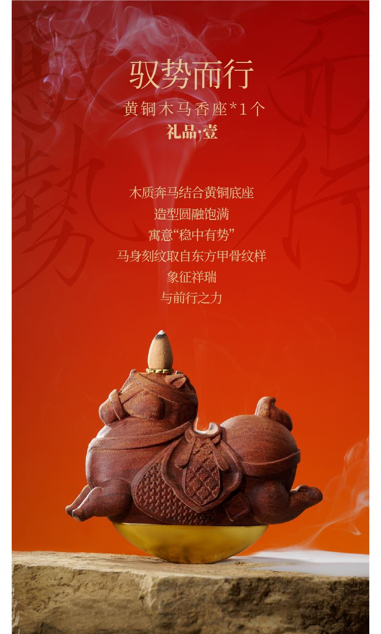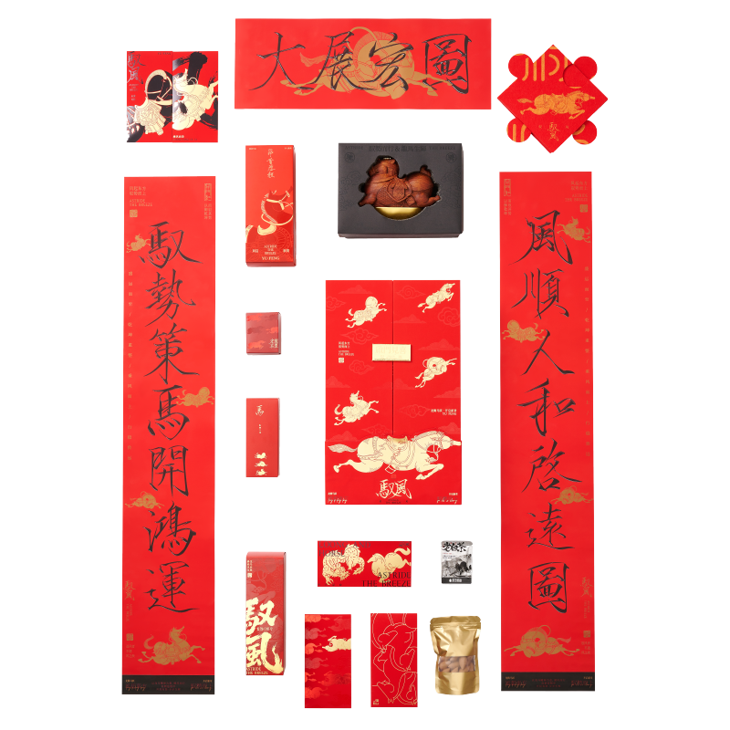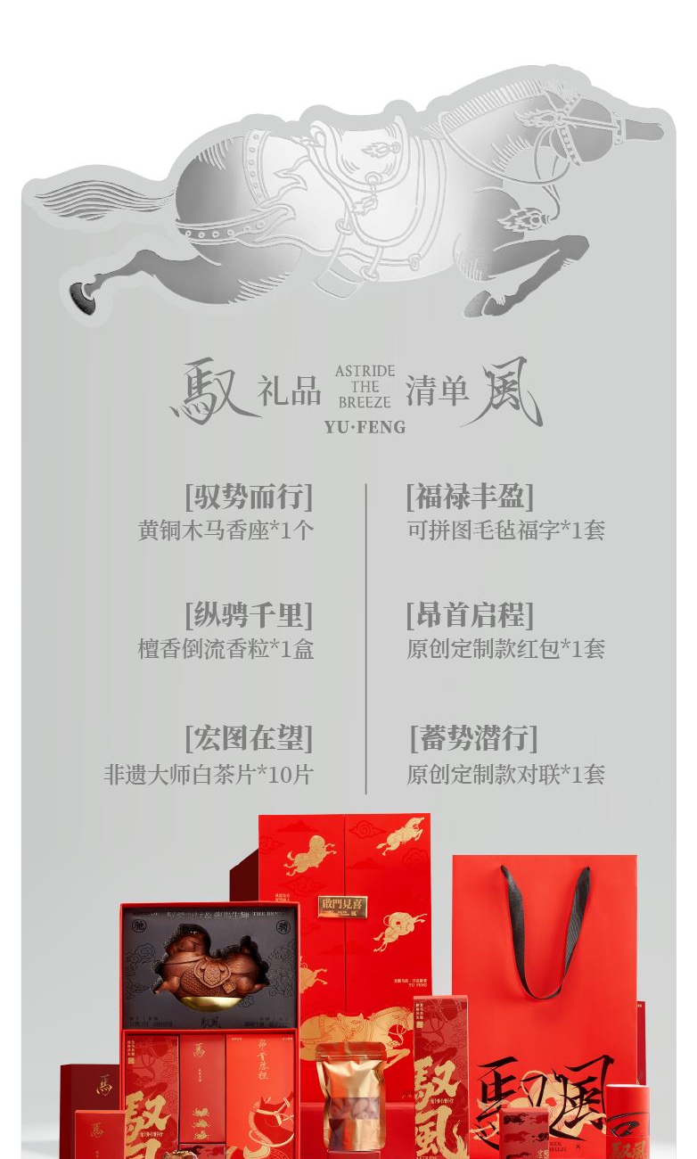 【驭风主题纸盒】 1、 [驭势而行]原创木马香座*1个 2、 [奔腾万里]檀香倒流香粒*1盒 3、 [宏图在望]非遗大师白茶片*10片 4、 [福禄丰盈]可拼图毛毡福字*1套 5、 [乘风而发]原创主题红包*1套 6、 [大展宏图]原创主题对联*1套