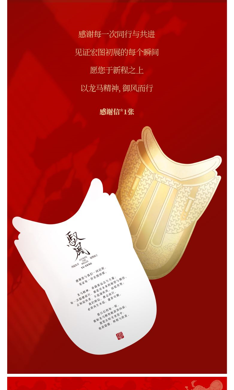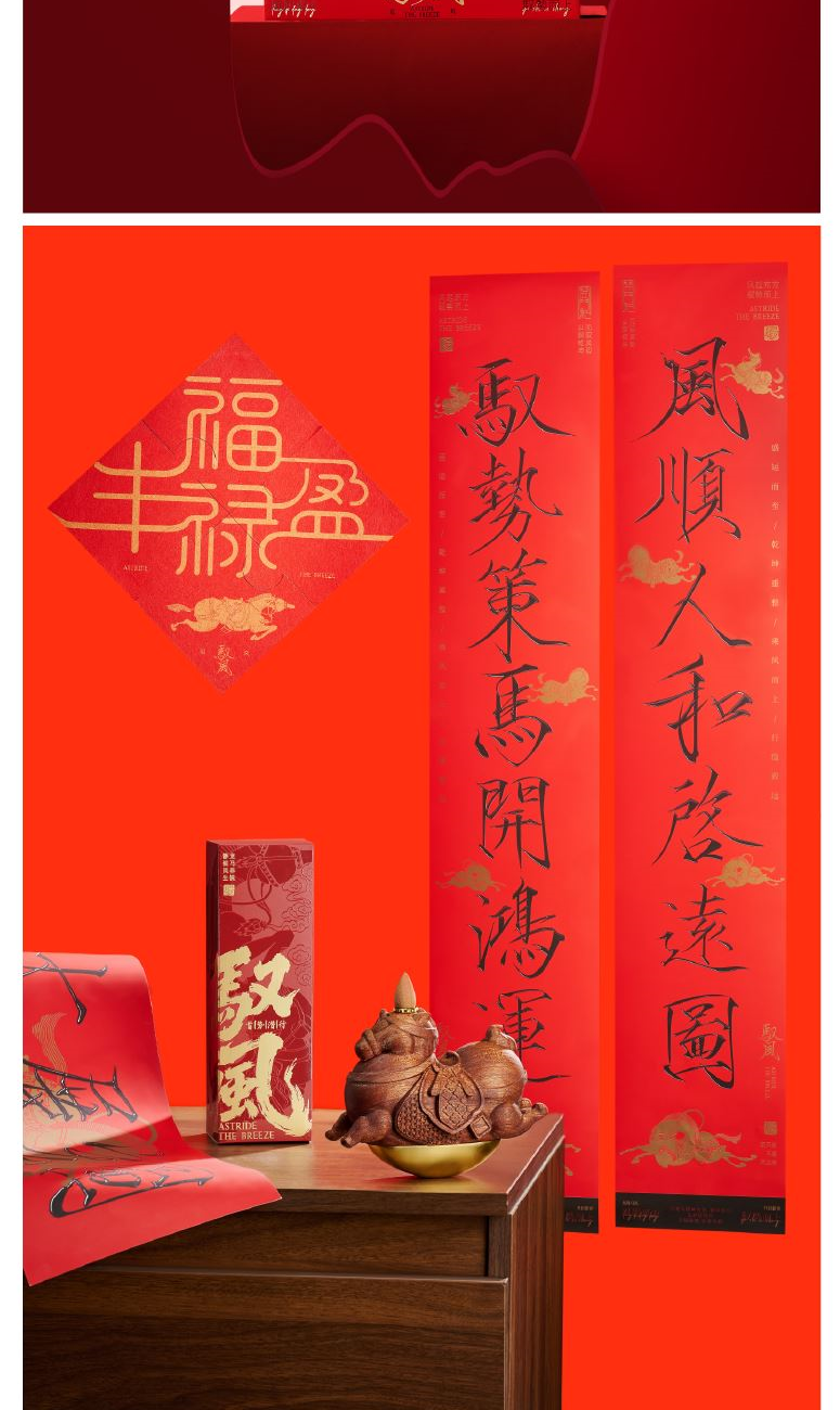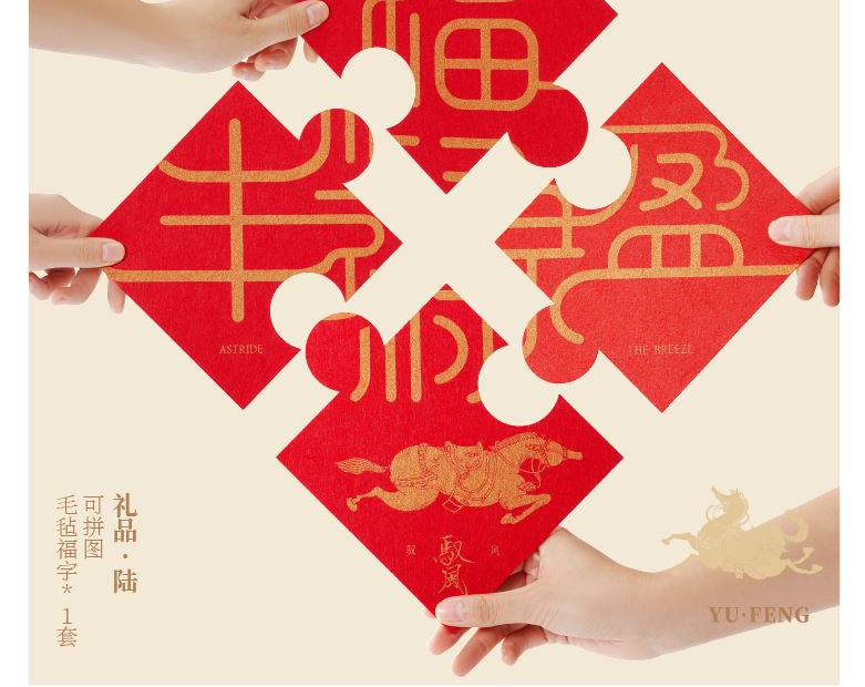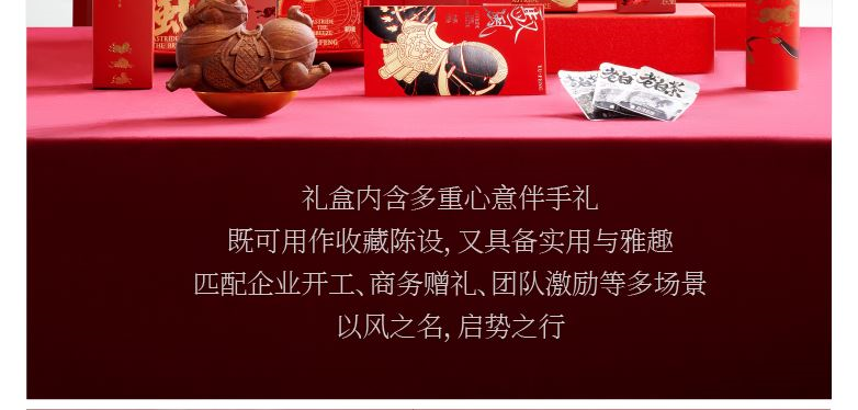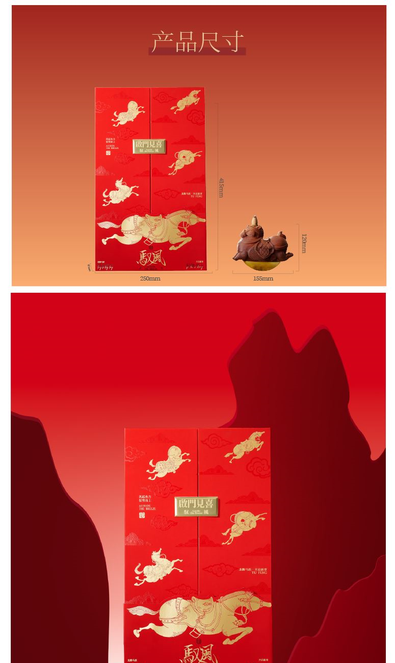 【驭风主题纸盒】 1、 [驭势而行]原创木马香座*1个 2、 [奔腾万里]檀香倒流香粒*1盒 3、 [宏图在望]非遗大师白茶片*10片 4、 [福禄丰盈]可拼图毛毡福字*1套 5、 [乘风而发]原创主题红包*1套 6、 [大展宏图]原创主题对联*1套