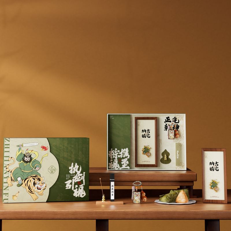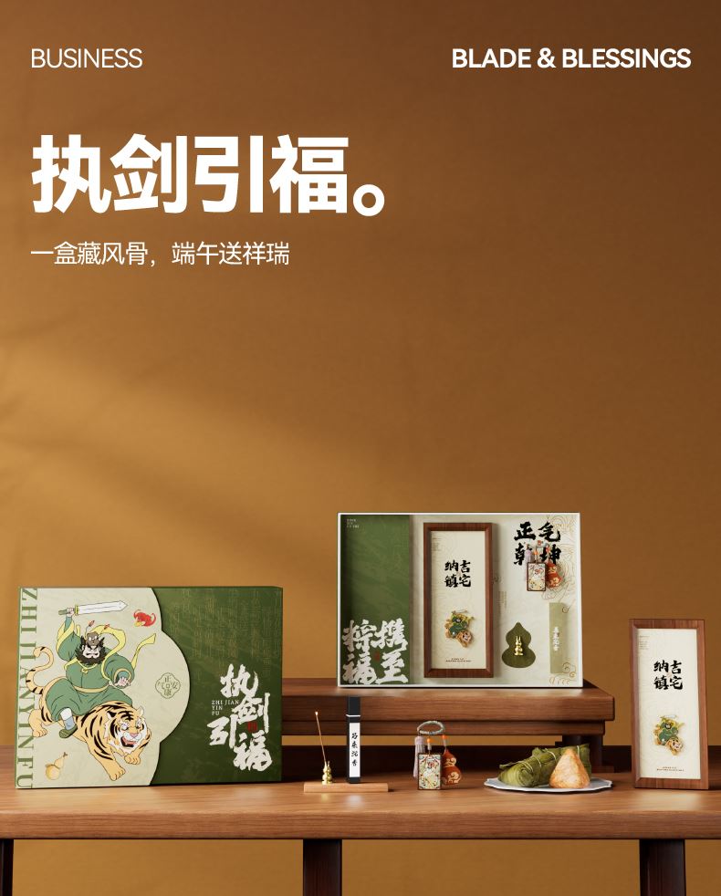 钟馗镇宅,正气凝于盒上;福牌纳吉,瑞意藏于器中 一枚咸蛋映端午之俗,一尊摆件立浩然之风 角黍寄情,糯香传意 一盒风骨,半是民俗祥瑞,半是君子气节 赠者有心,愿君岁岁端阳,安康顺遂,福运长随 内配: 配置一:礼盒&手袋x1 配置二:荃盛·粽子x4 配置三:镇宅纳吉·徽章木框摆件x1 配置四:正气乾坤·钟馗福牌x1 配置五:黄铜葫芦香插x1 配置六:马来沉香x1 配置七:贺卡x1