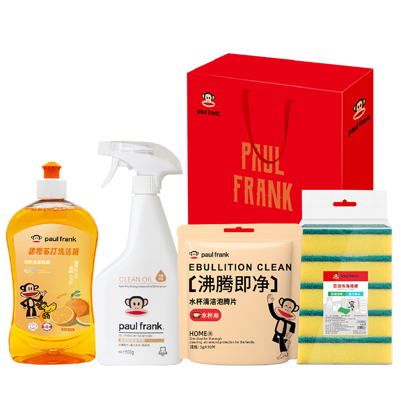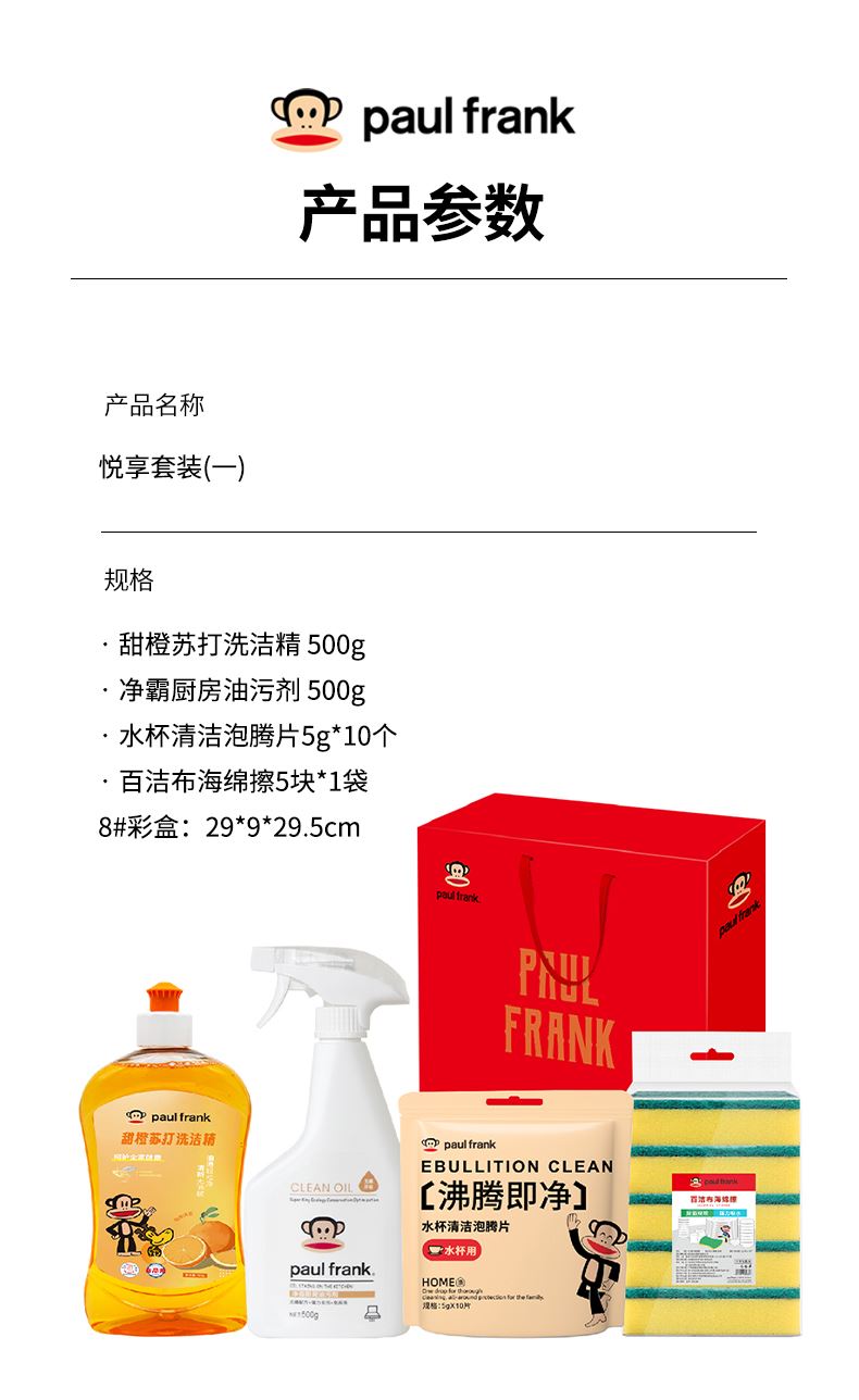 甜橙苏打洗洁精 500g 净霸厨房油污剂 500g 水杯清洁泡腾片5g*10个 百洁布海绵擦5块*1袋 8#彩盒:29*9*29.5cm