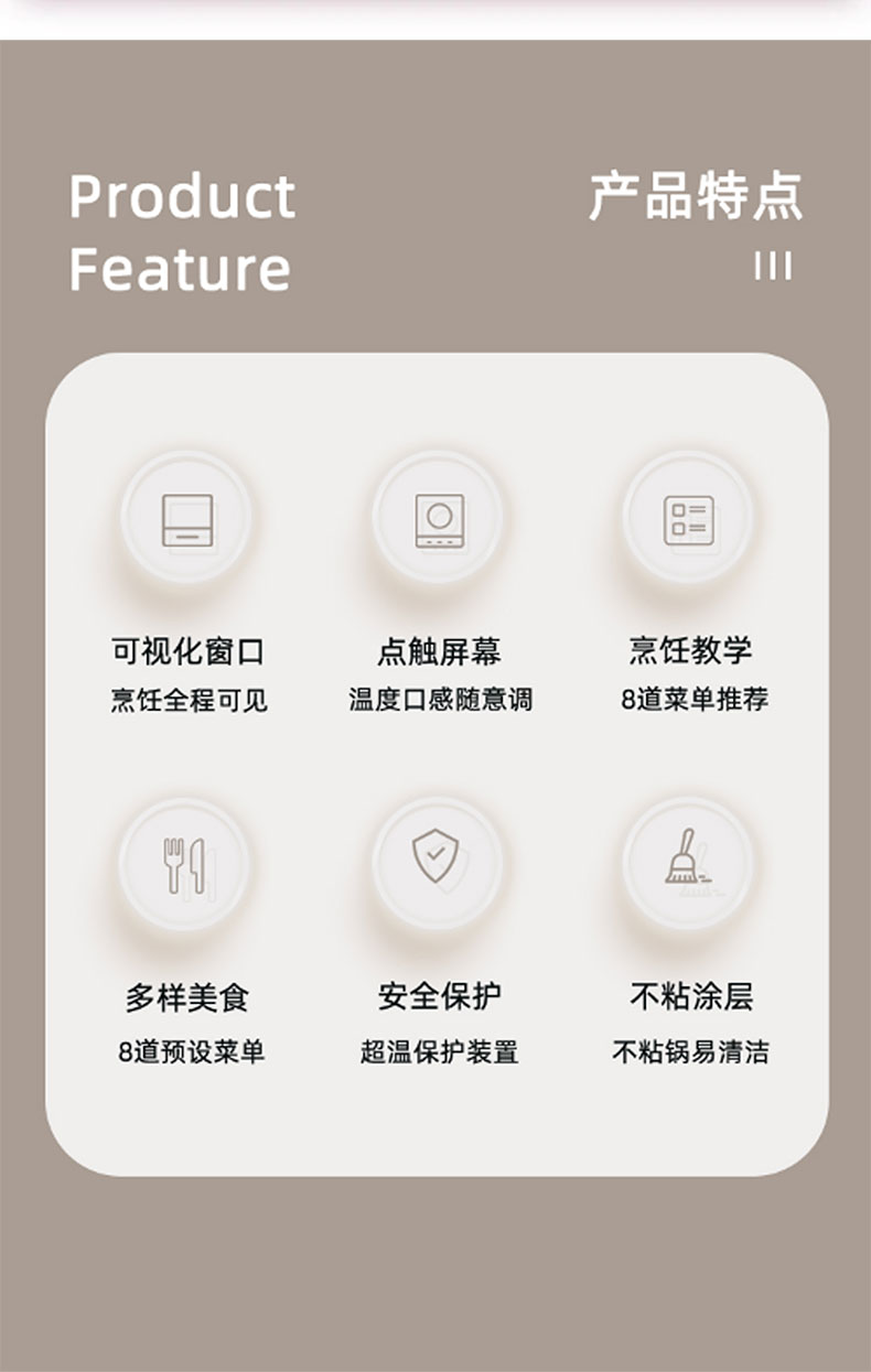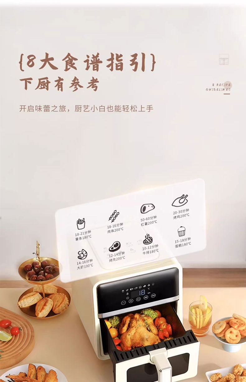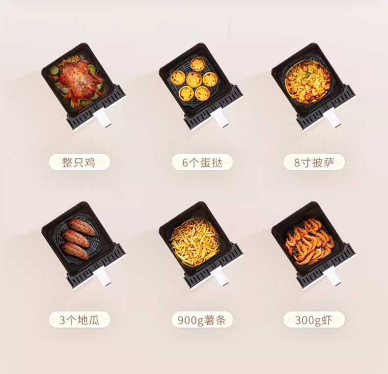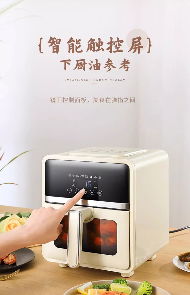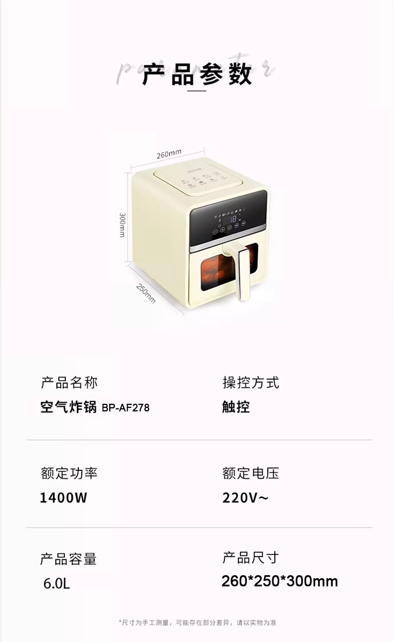 大容量不粘炸篮,健康环保 6L大容量,满足日常所需 1400W无油空炸,更健康 360度循环热风烘烤,外酥里嫩 多功能灵敏触屏控制,数码显示屏 炸篮可视窗口设计,烹饪过程一目了然 产品材质:PP+ABS炸篮容量:6L 额定功率:1400W 额定电压/频率:220V~/50Hz 产品重量:4kg 产品尺寸:260*250*300mm 包装尺寸:393*325*345mm 外箱尺寸:680*410*710mm