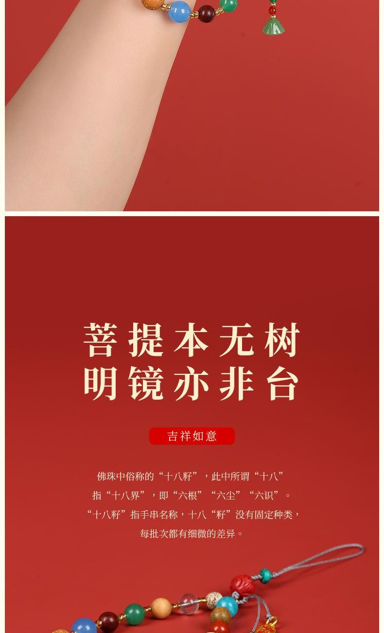 辟邪护身,诸事吉祥: 作为在寺庙中经佛法加持的圣物,十八籽被认为具有强大的护身辟邪功效,寓意能保佑佩戴者平安健康,远离灾祸,所求皆如愿。 静心定志,烦恼消散: 多宝十八籽有助于安抚焦虑情绪,让内心回归平静,专注当下,戒除焦躁。寓意着约束六根、远离六尘、清净六识,从而达到身心清净、解脱烦恼的境界。它提醒修行者要看清世界的本质,不执着于表象。