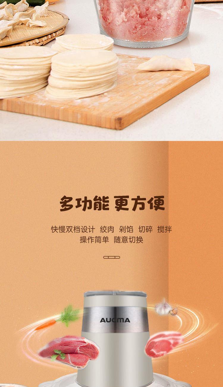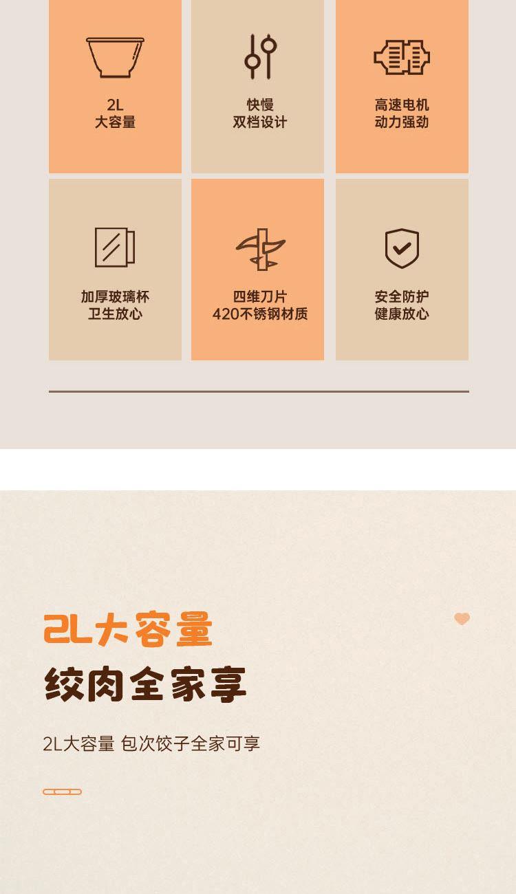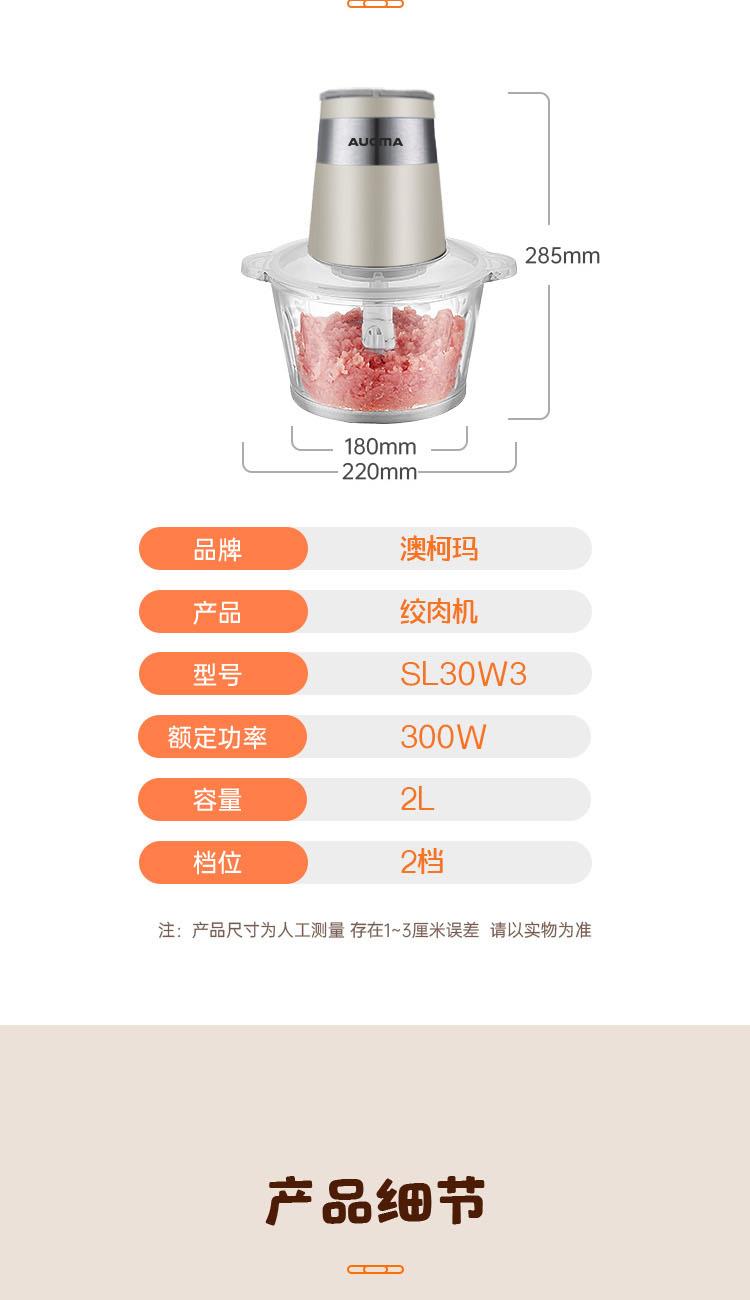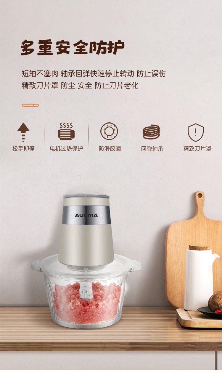 额定功率:300W 容 量:2L 杯体材质:玻璃 机头材质:不锈钢201 电机转速:8000r/min 包装尺寸:320*215*162mm 毛 重:1.95kg 装 箱 数:1台 2L大容量加厚玻璃杯,一次绞肉全家享 快慢双档设计,绞肉、剁陷、切碎、搅拌操作简单,随意切换 加厚高硼硅玻璃杯体,健康卫生,清洗更方便 产品拥有松手即停、电机过热等保护,使用更安全。