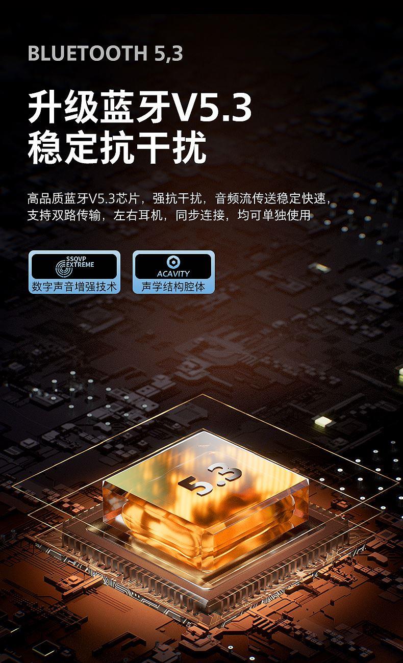 6、蓝牙5.3芯片 ,取出耳机秒连,连接快、准、稳, 功耗低 不卡顿;