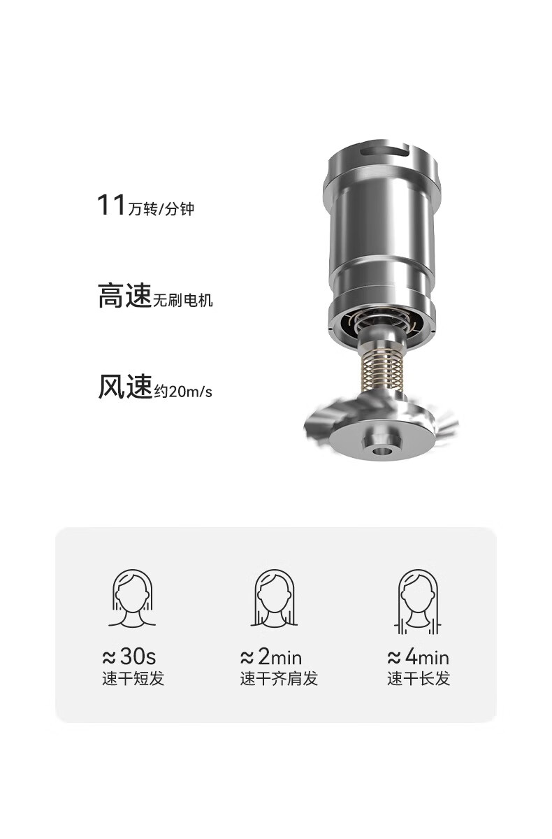 颜色:陶白 重量:0.4kg 额定功率:1300W 产品尺寸:245x73x96mm 包装尺寸:360*150*89mm 条码 : 6977735713199 1. 无刷电机,110000转高速马达,强劲风力30秒速干; 2. 中空短涵道设计,出风更强更稳; 3. 36亿高浓度等离子养护,比负离子除静电更有效,秀发不毛躁,自然柔顺; 4. NTC恒温呵护,自动控温,避免热损伤。