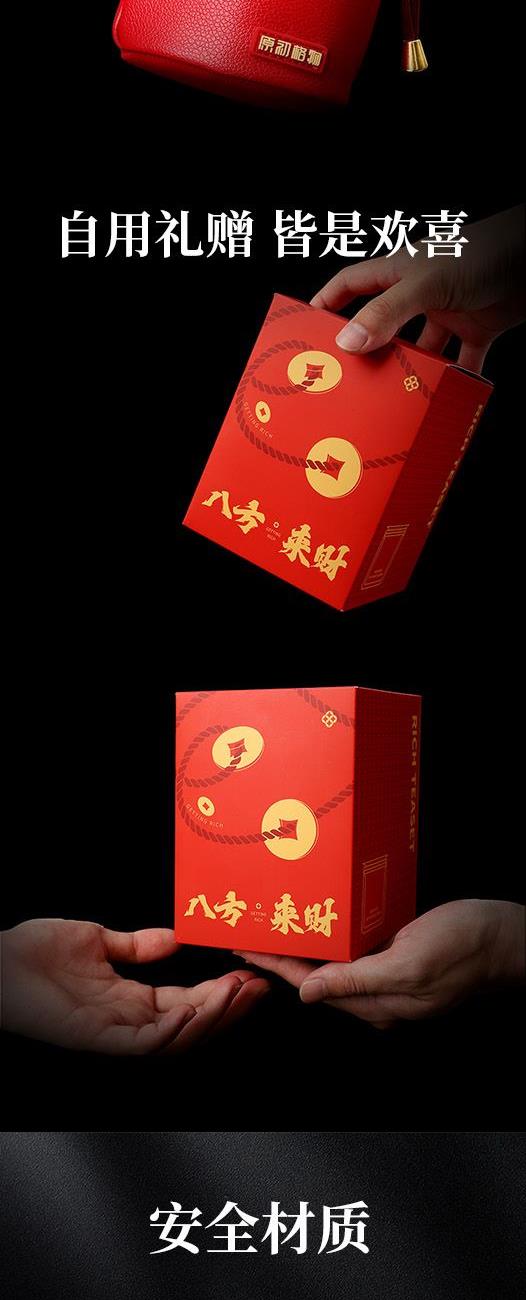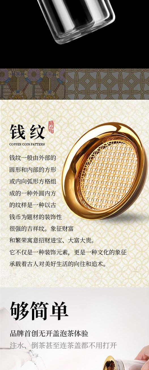 茶具以中国古铜钱为灵感,将传统金融符号转化为功能美学,外圆内方的铜钱滤网精密排布,兼具过滤与视觉美感,304不锈钢镜面抛光后镀钛处理,更有古铜钱质感,中国文化以水为财,注水加水不用开盖,寓意财富流通更加快捷顺畅,搭配形似钱袋的旅行装,有着八方来财的美好寓意,无论是自用还是送人都是非常好的选择。
