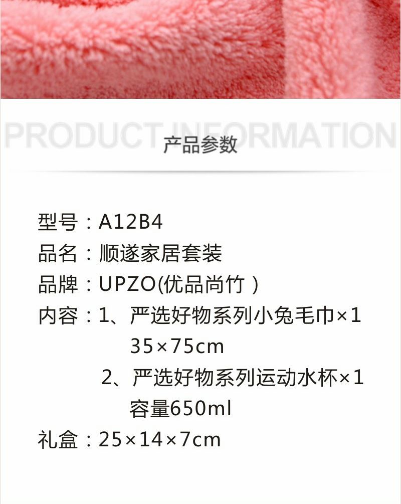 型号: A12B4 产品内容 1、严选好物系列小兔毛巾×1 35*75CM 平方克重300克 精致包边工艺 2、严选好物系列运动水杯×1 新款加大容量650ML 直径:7CM 外盒: 25×14×7cm 时尚外观 优良品质 伴手礼好选择 产品实用性强