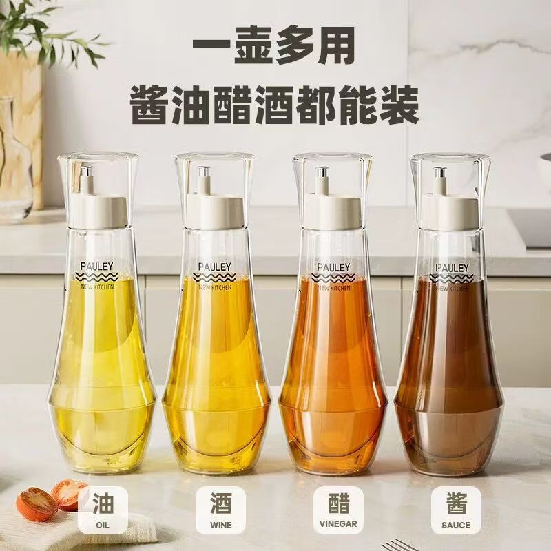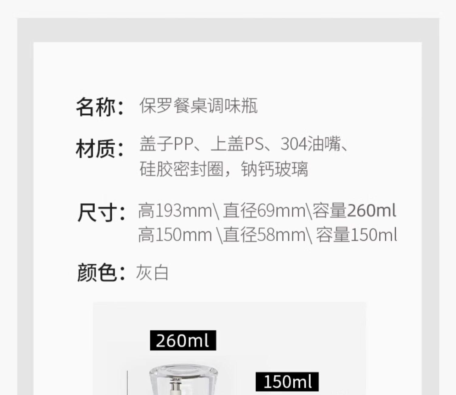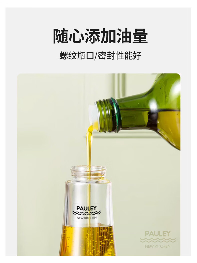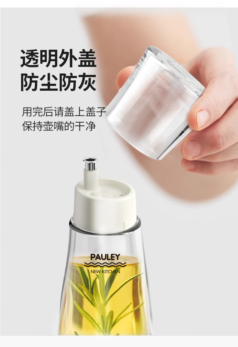 保罗餐桌调味瓶 透明外盖防尘防灰,安全玻璃材质 翻边304不锈钢油嘴 防止滴挂,自动回吸,断油利落 安全无异味 可视调味, 无铅玻璃/安全耐用 随心添加油量,螺纹瓶口/密封性能好 硅胶圈安全密封,不易洒漏/随心放置/调味储存更放心 加厚底部 稳固耐用,一体成型/小巧精致/平稳放置不易倒