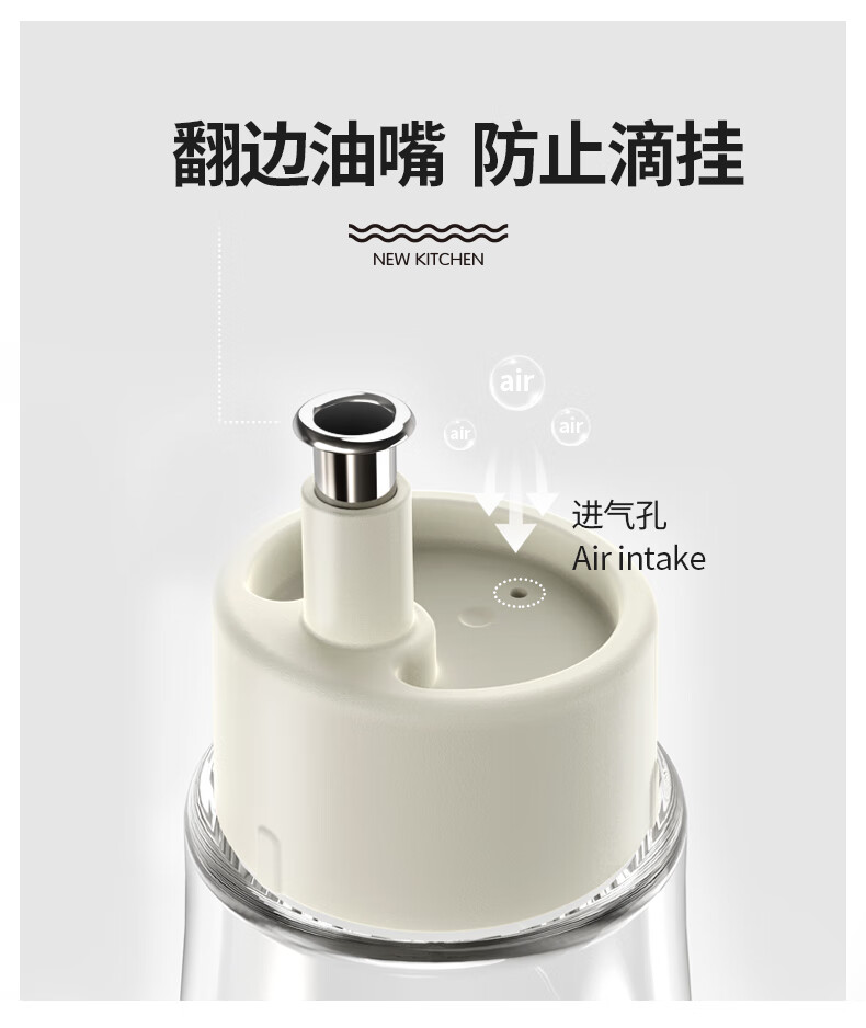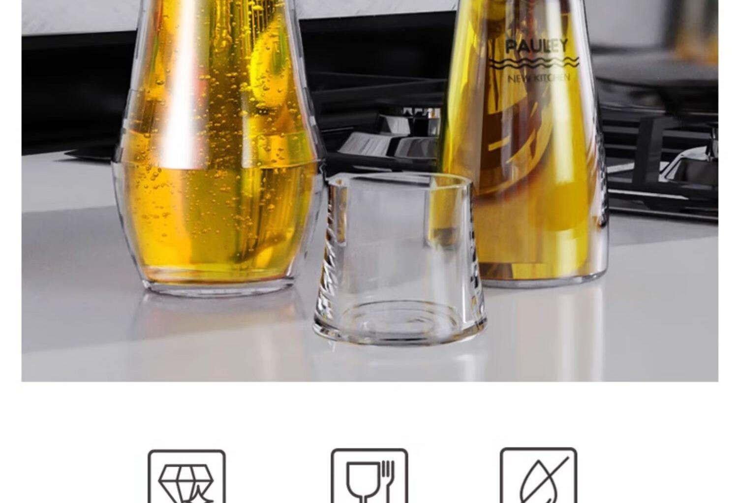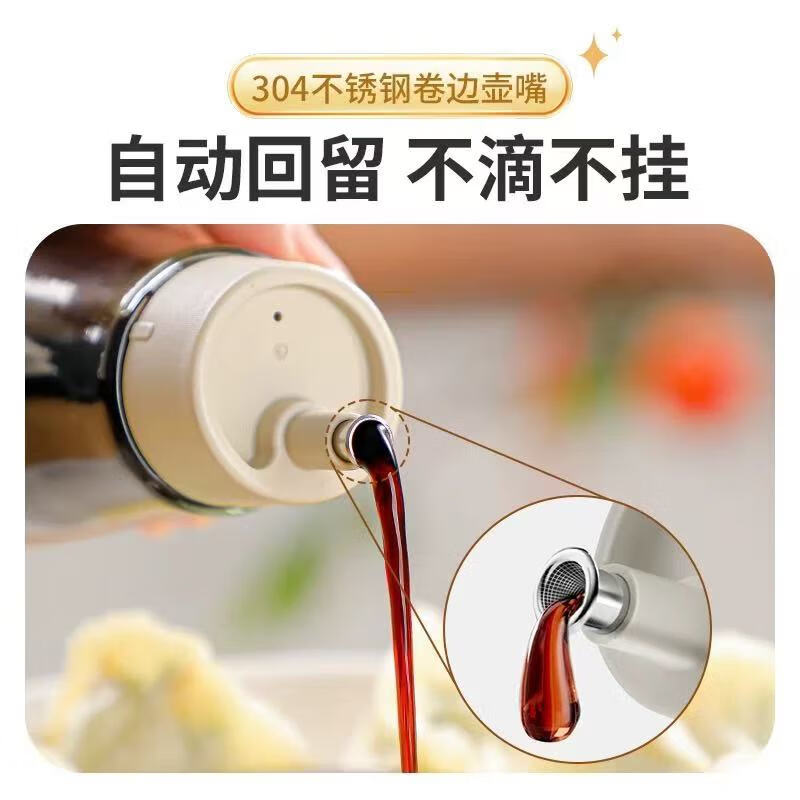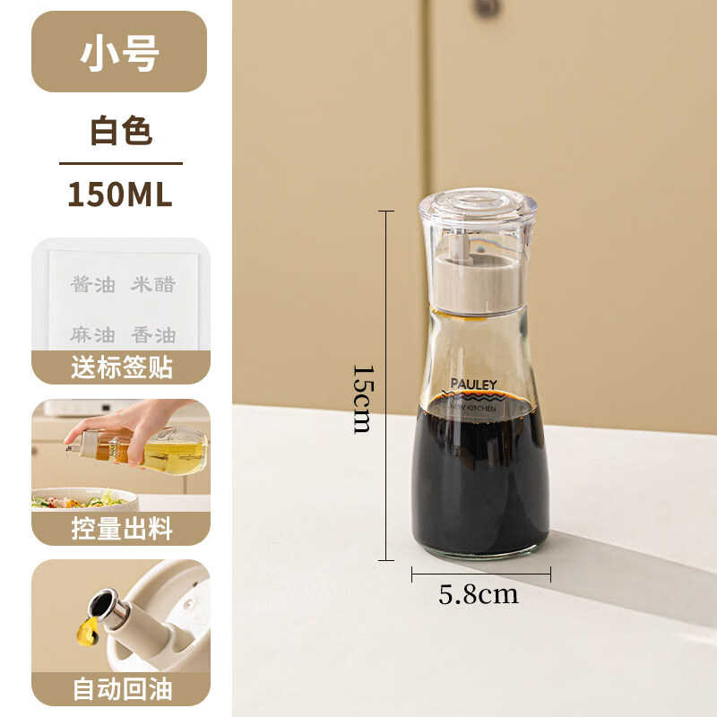 保罗餐桌调味瓶 透明外盖防尘防灰,安全玻璃材质 翻边304不锈钢油嘴 防止滴挂,自动回吸,断油利落 安全无异味 可视调味, 无铅玻璃/安全耐用 随心添加油量,螺纹瓶口/密封性能好 硅胶圈安全密封,不易洒漏/随心放置/调味储存更放心 加厚底部 稳固耐用,一体成型/小巧精致/平稳放置不易倒