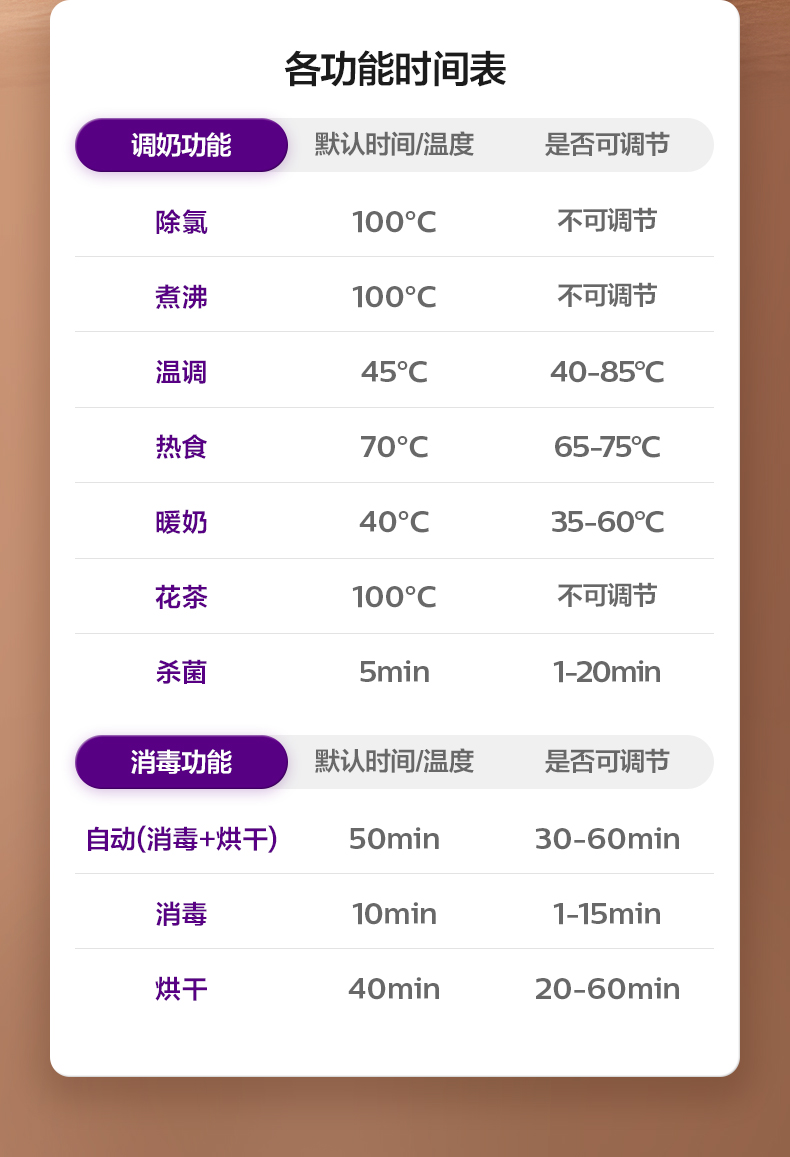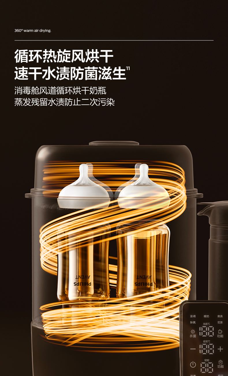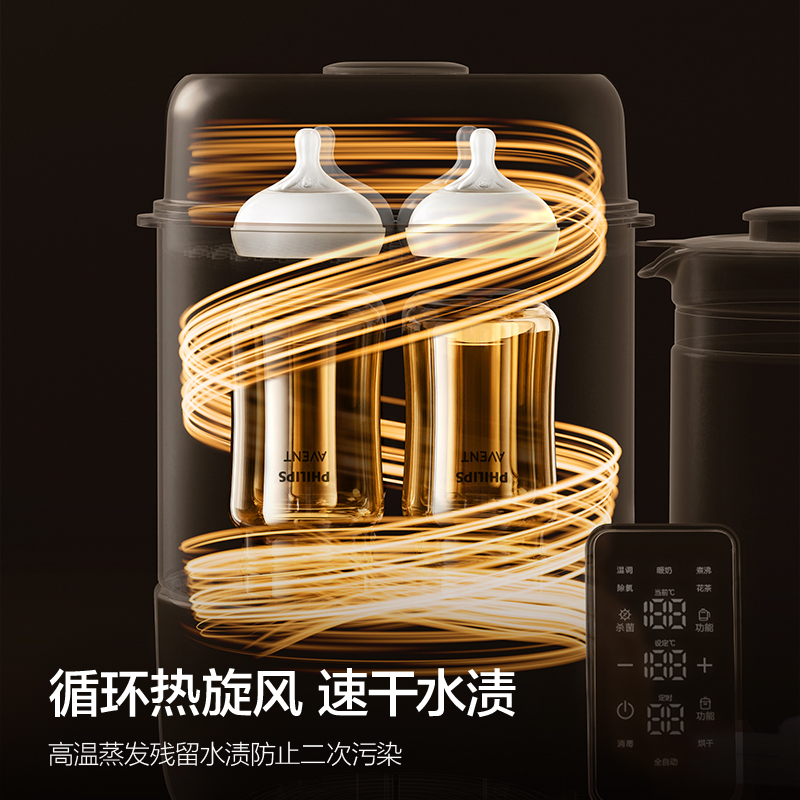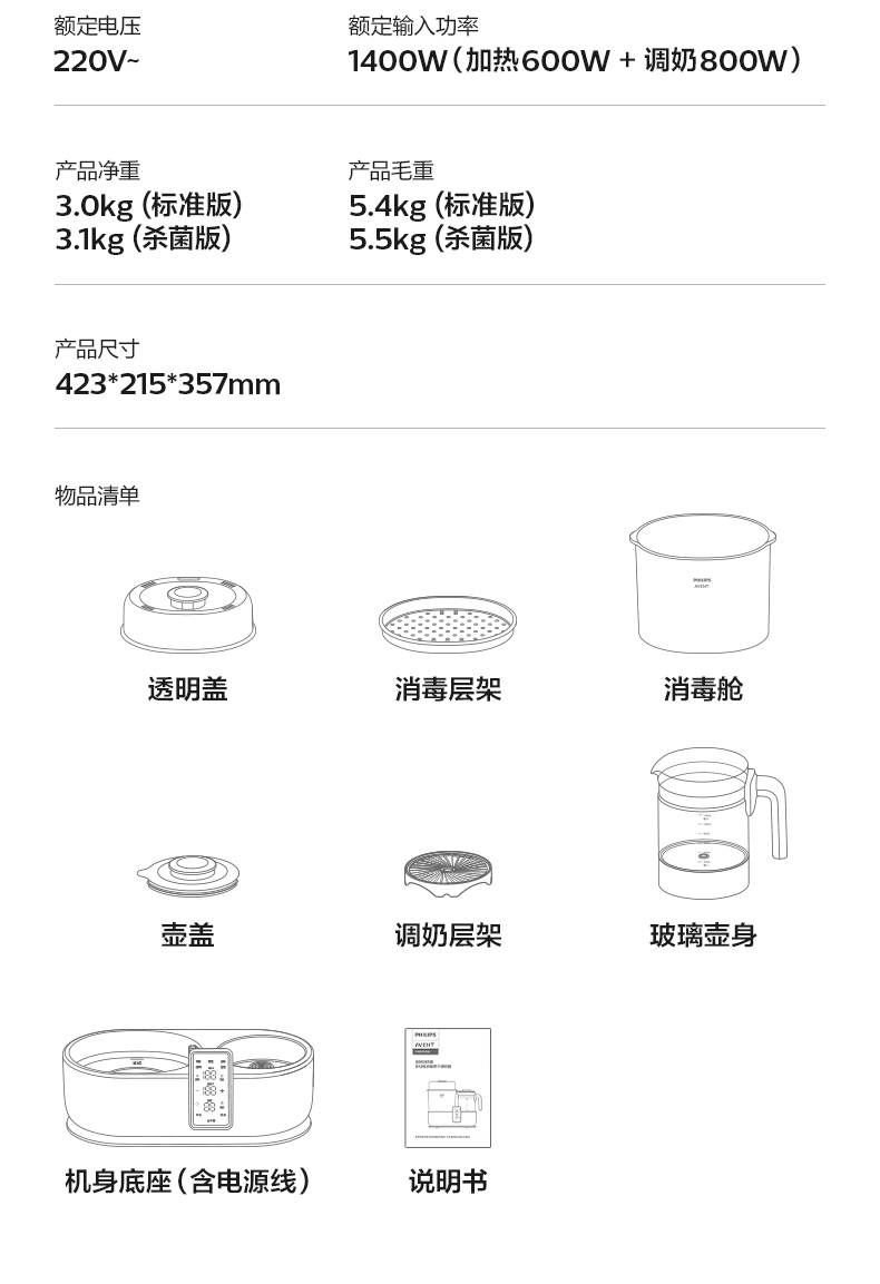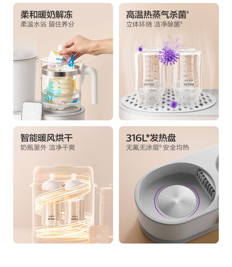 主要材质:PP+316L不锈钢 颜色:北极白 额定电压:220V~/50Hz 额定功率:1400W(加热600W调奶800W) 调奶消毒烘干,一机三用 调奶/消毒双独立,多能分区同启 真100℃热流消杀,316L不锈钢发热盘 严选食品级PP材质,人工力学视角大屏,轻触启亮不弯腰