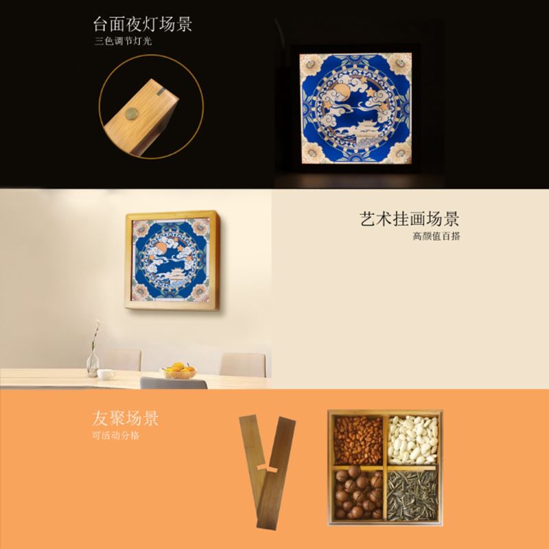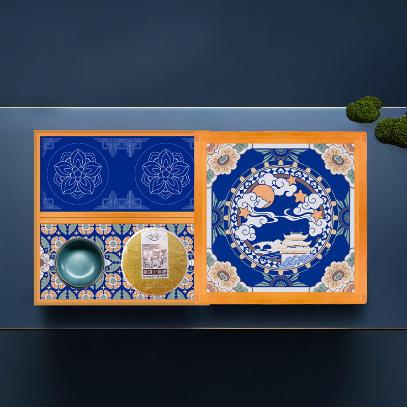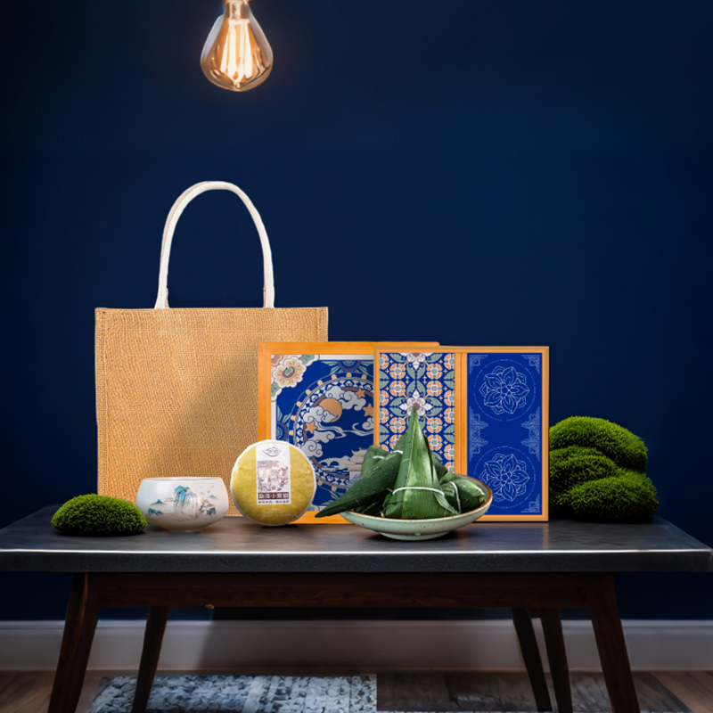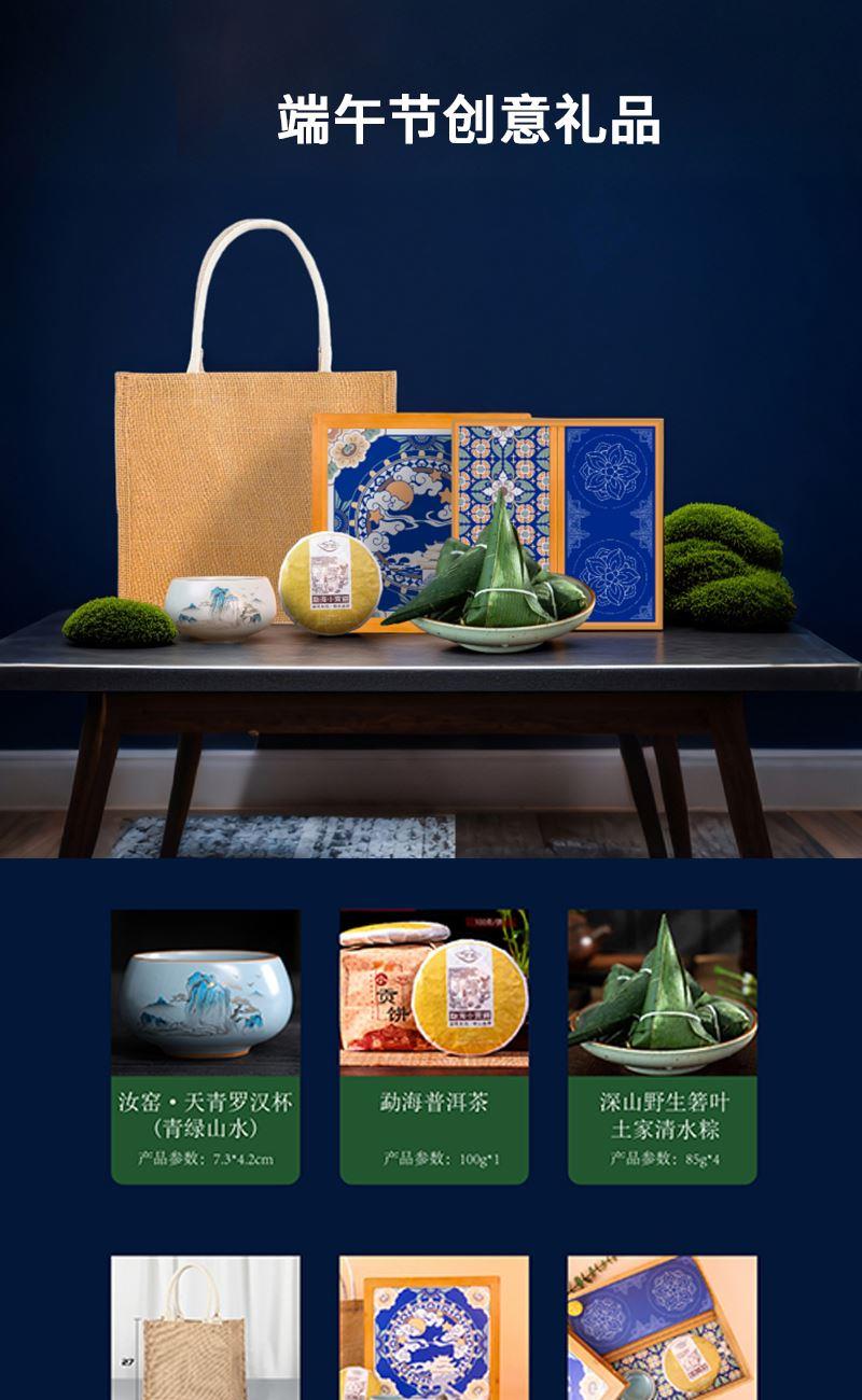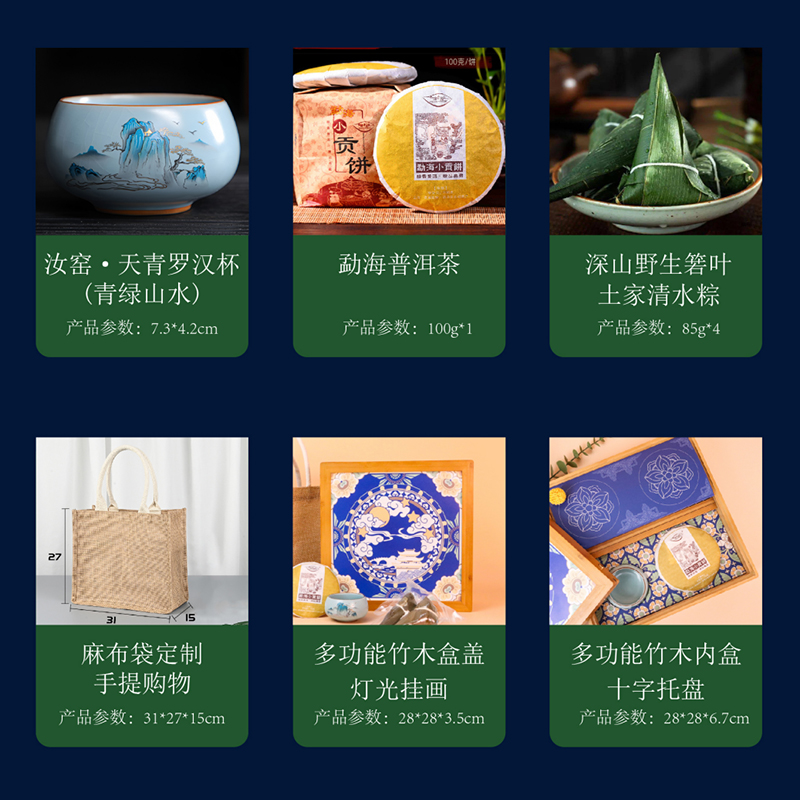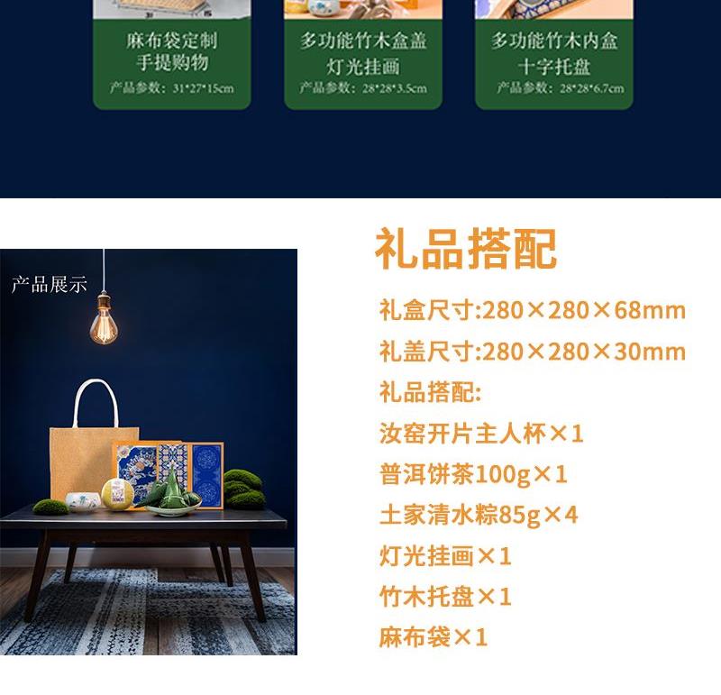 端午节礼品定制 汝窑开片主人杯x1 普洱饼茶100gx1 土家清水粽85gx4 灯光挂画x1 竹木托盘x1 麻布袋x1 礼盒尺寸:280X280 X68mm 盒盖尺寸:280X280 X30mm