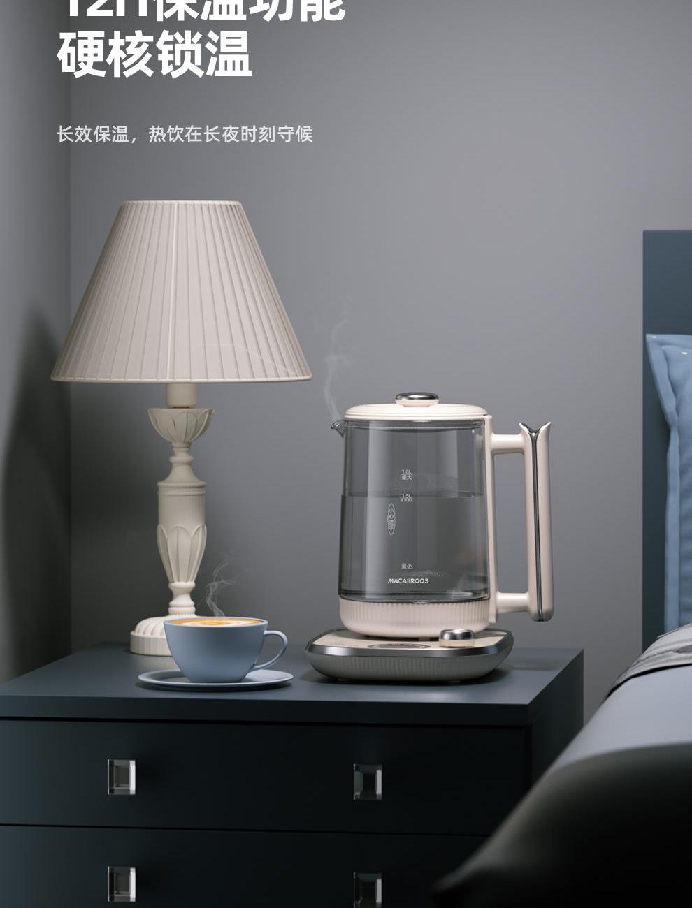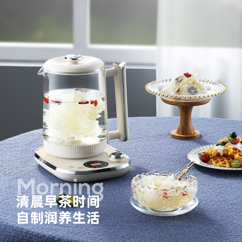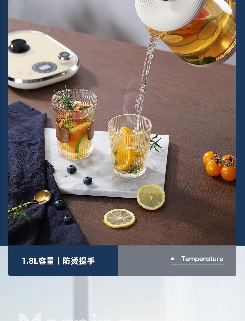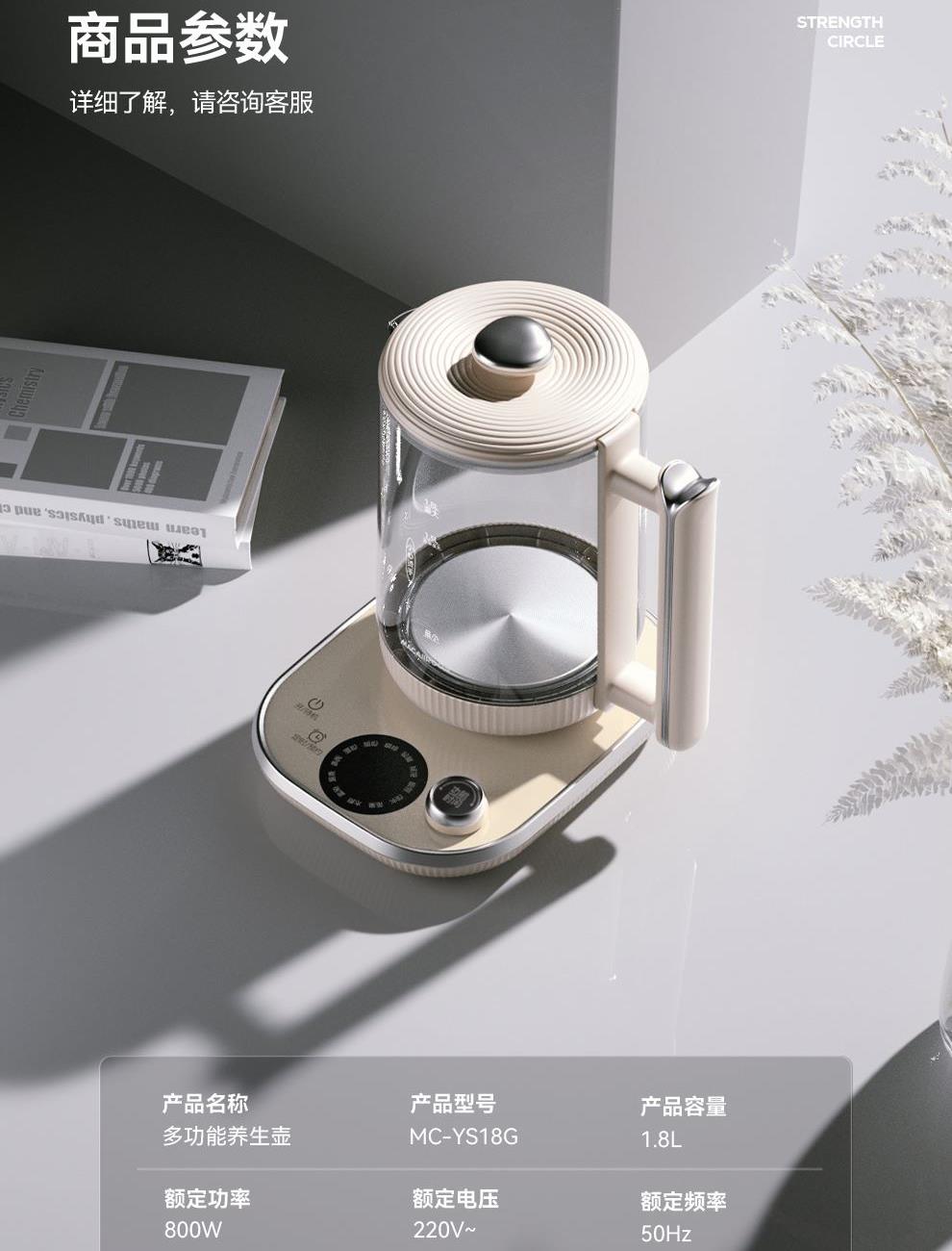 额定功率:800W 额定容量:1.8L 额定电压:220V~ 额定频率:50Hz 产品净重:1.3kg 产品毛重:1.5kg 整箱重量:13.2kg 一机多能12大菜单烧水、养生汤、调奶、温奶、消毒等,12h预约12h保温; 1.8L大容量满足一家人养生需求,无需频繁接水烧煮; 高硼硅玻璃壶身材质安全无异味,骤冷骤热不破裂,易清洗; 触控+旋钮操控玻璃触控面板触摸、旋钮操控,数码显示。