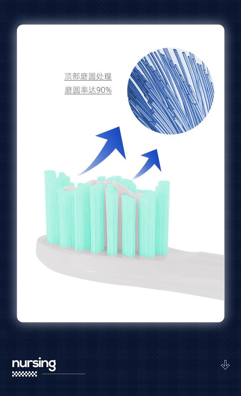 电池容量:800mAh 商品条码 : 6972831860389 产品尺寸:29X27X243mm 包装尺寸:208X105X45mm 防水等级:IPX7 包装清单:主机x1、牙刷头x2、充电线x1、说明书x1 核心卖点: 1、强劲动力,高频振动频率达到40000次/每分钟 2、40天续航时长,不用为电量焦虑 3、Type-C快速充电,携带方便,旅行的贴心伴侣 4、进口杜邦软刷毛,柔软细毛,贴心呵护 5、IPX7级全身防水,放心使用 6、一键切换3种护龈模式:清洁、美白、护龈