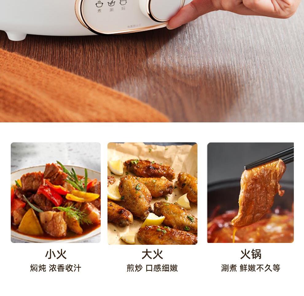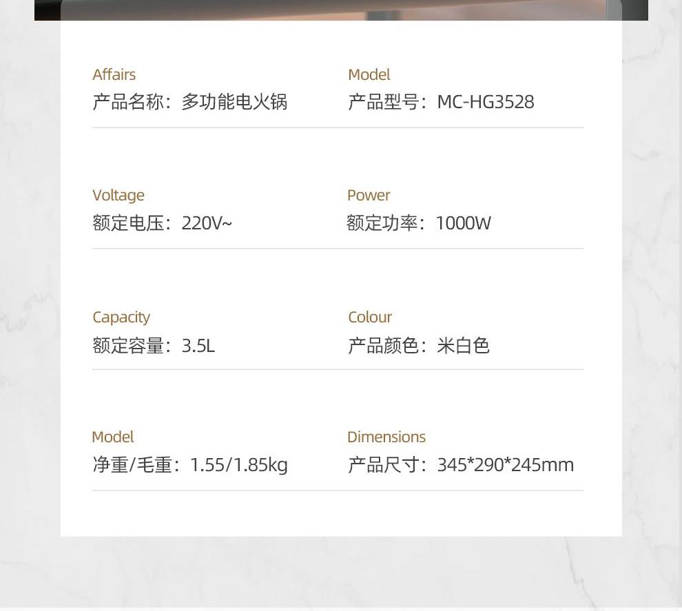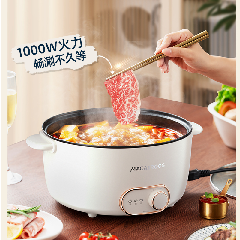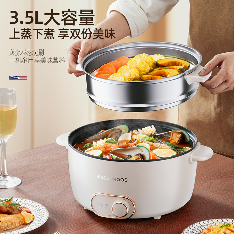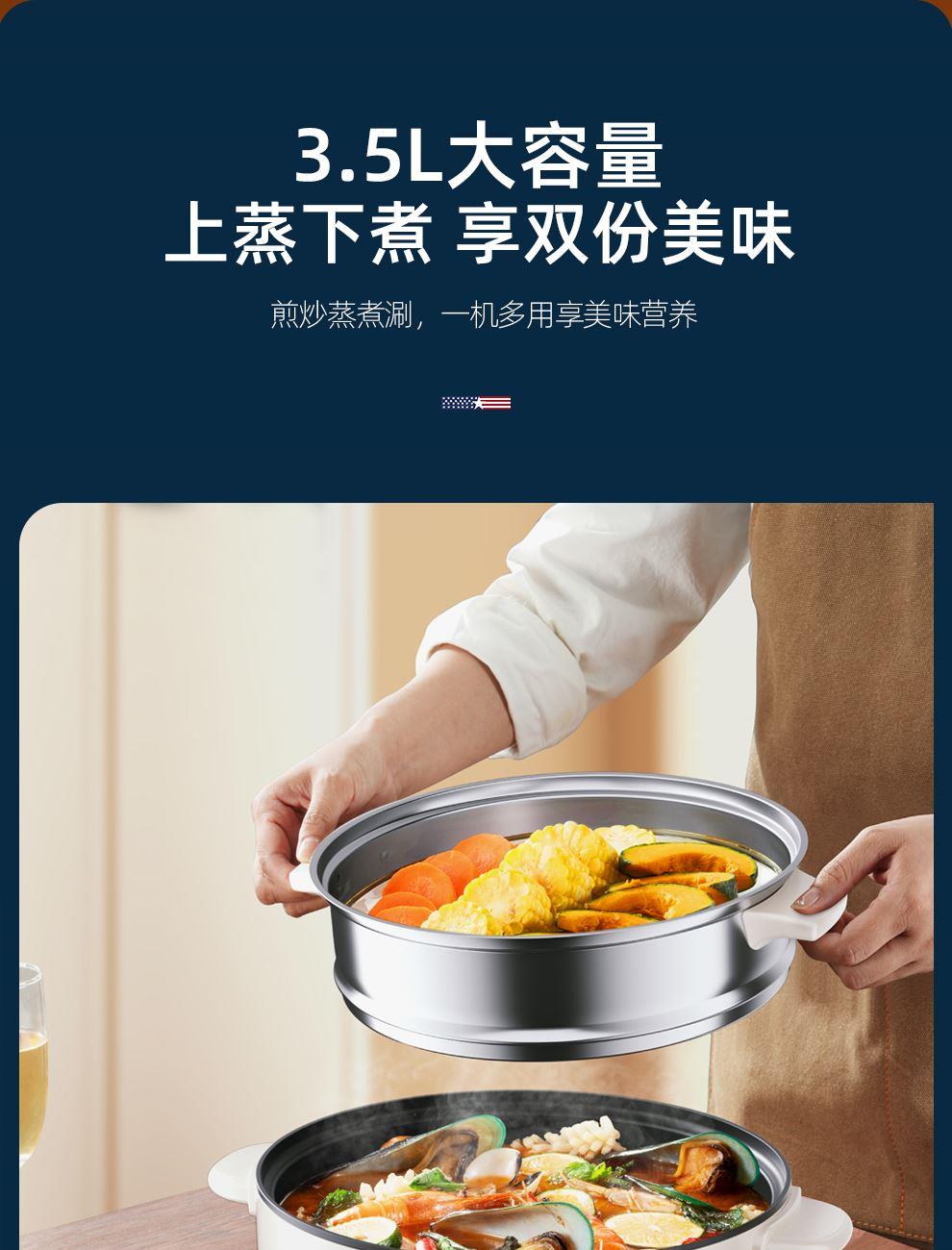 额定功率:1000W 额定容量:3.5L 额定电压:220V~ 额定频率:50Hz 产品净重:1.45kg 产品毛重:1.95kg 整箱重量:16.9kg 一锅多用&三档火力调节煎/煮/涮/焖/炖/蒸一锅多用,三档火力调节,满足不同烹饪需求; 3.5L恰好容量宿舍也能打火锅,1000W大功率且受热均匀,美味不久等; 上蒸下煮配不锈钢蒸笼上蒸下煮同时进行;可煎/可煮不粘锅,易清洗; 双层防烫&双层防烫材质,双边防烫提手方便移动清洗。