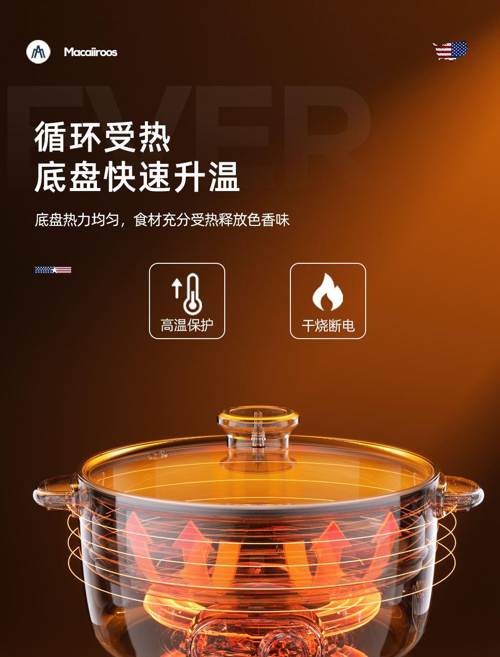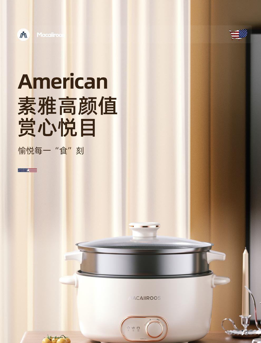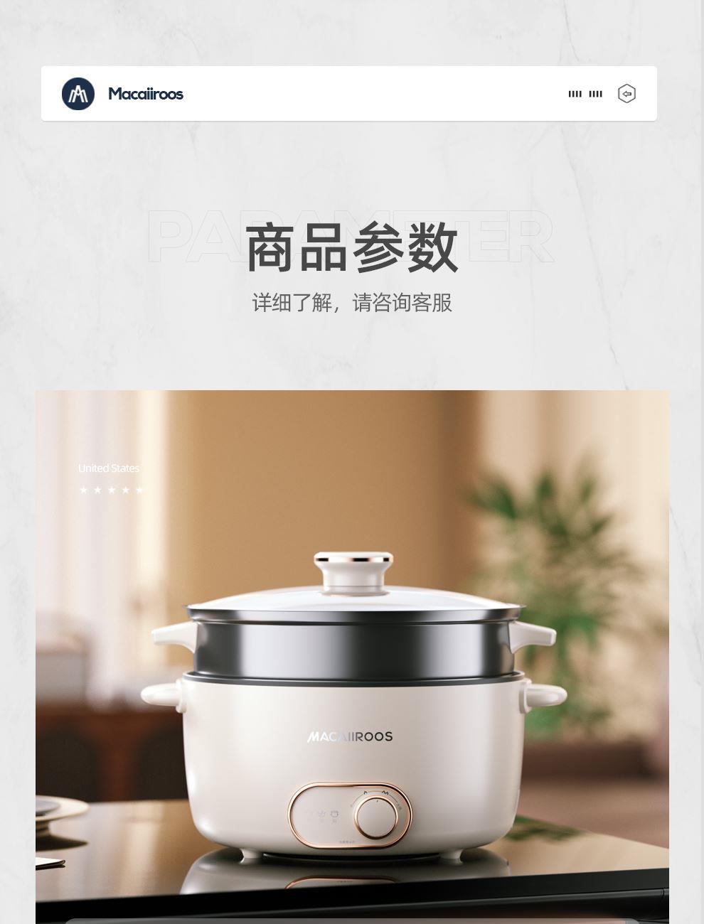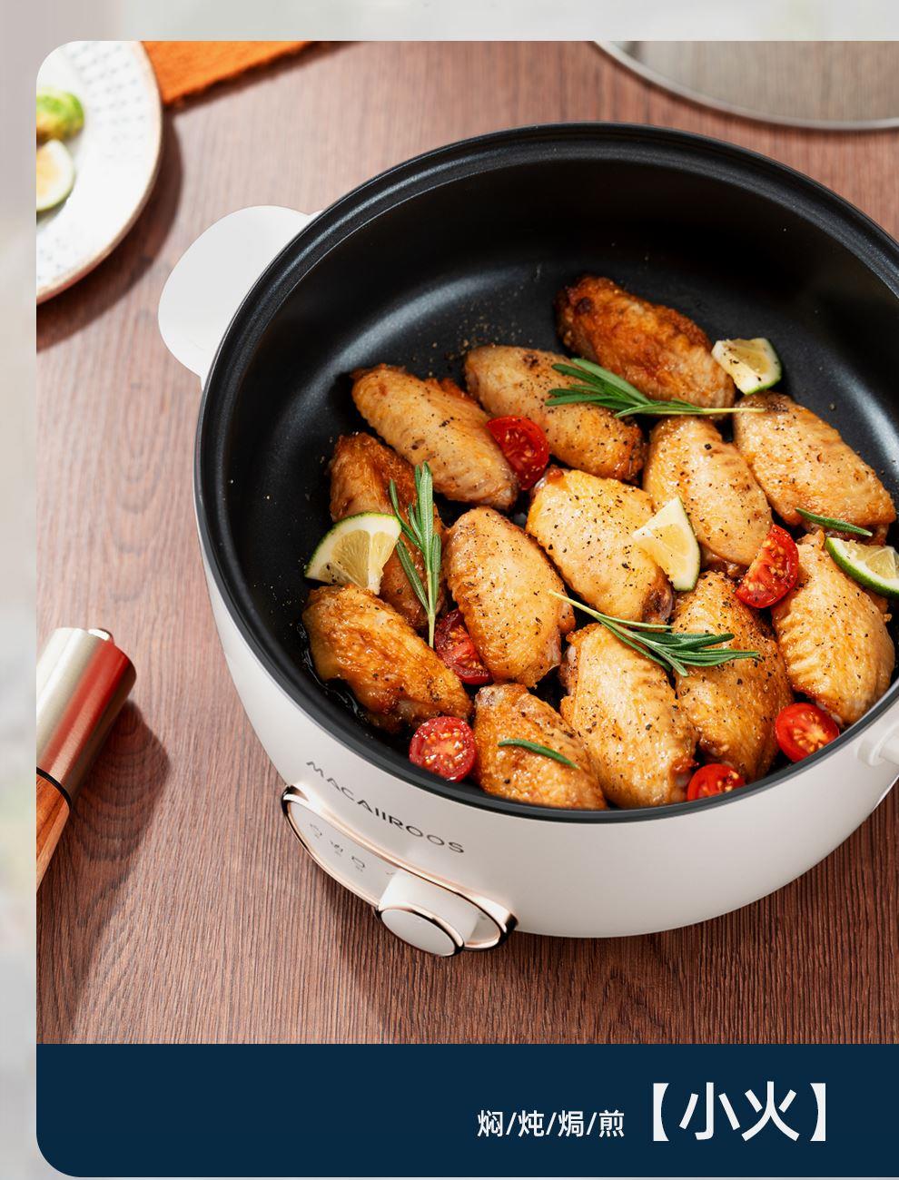 额定功率:1000W 额定容量:3.5L 额定电压:220V~ 额定频率:50Hz 产品净重:1.45kg 产品毛重:1.95kg 整箱重量:16.9kg 一锅多用&三档火力调节煎/煮/涮/焖/炖/蒸一锅多用,三档火力调节,满足不同烹饪需求; 3.5L恰好容量宿舍也能打火锅,1000W大功率且受热均匀,美味不久等; 上蒸下煮配不锈钢蒸笼上蒸下煮同时进行;可煎/可煮不粘锅,易清洗; 双层防烫&双层防烫材质,双边防烫提手方便移动清洗。