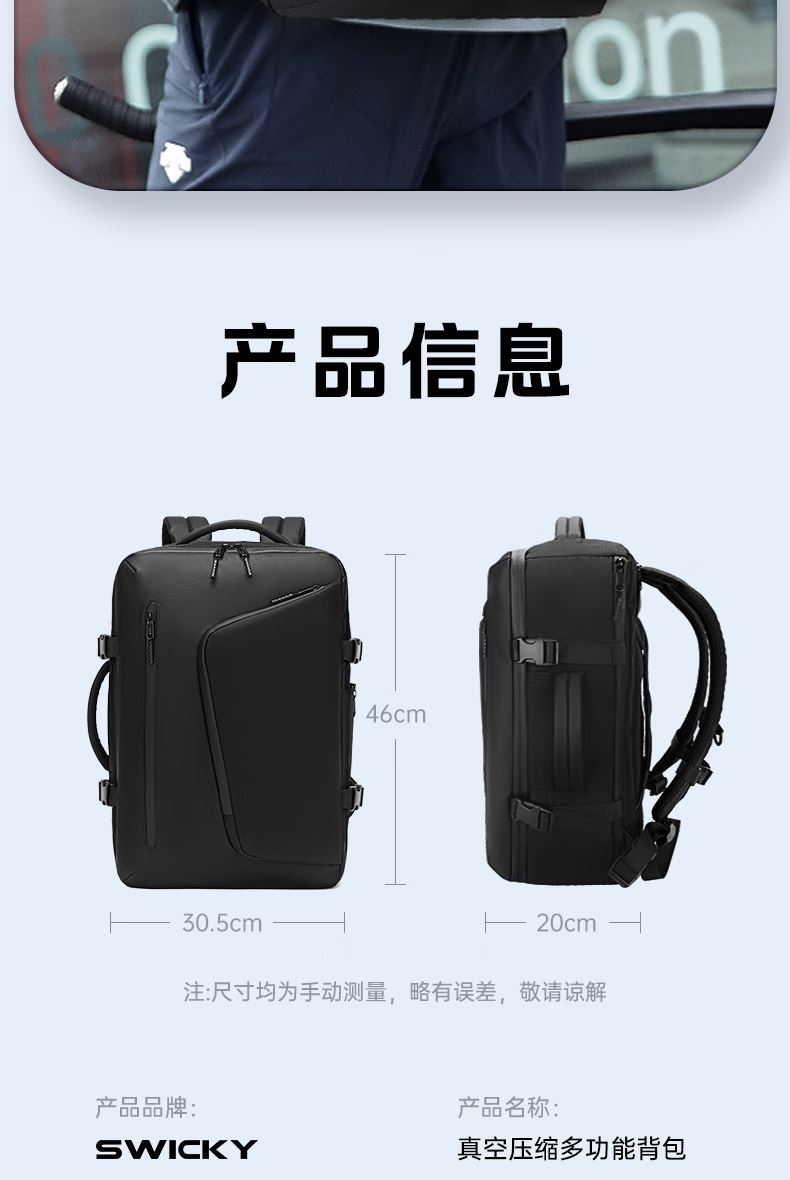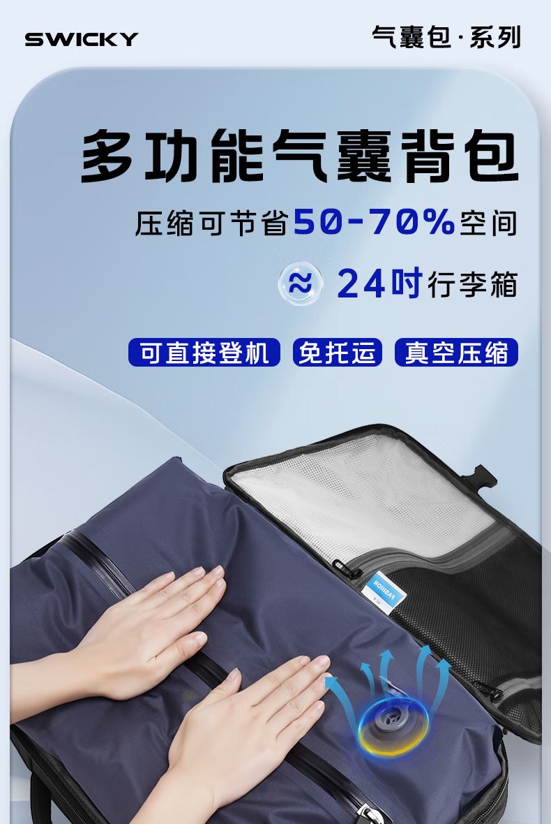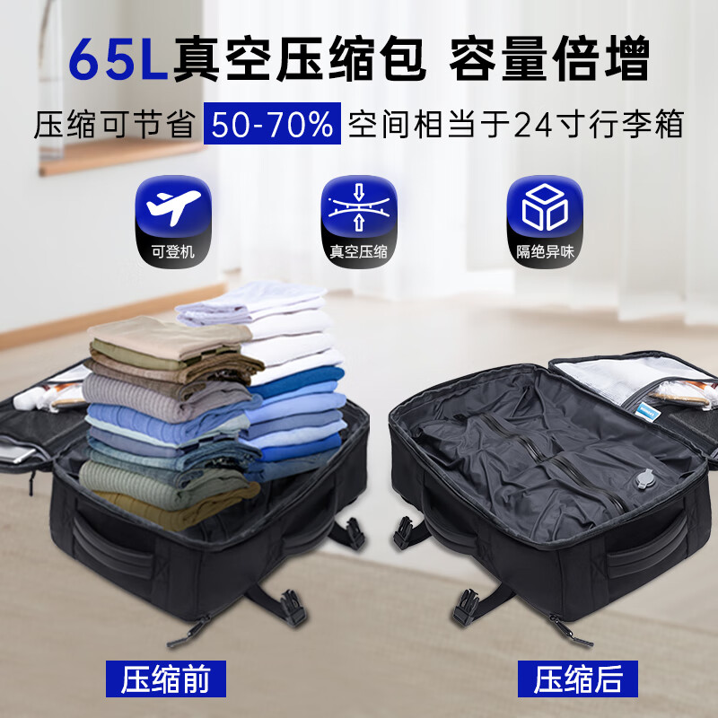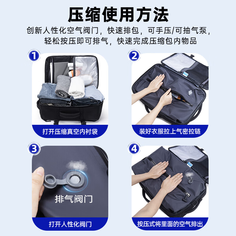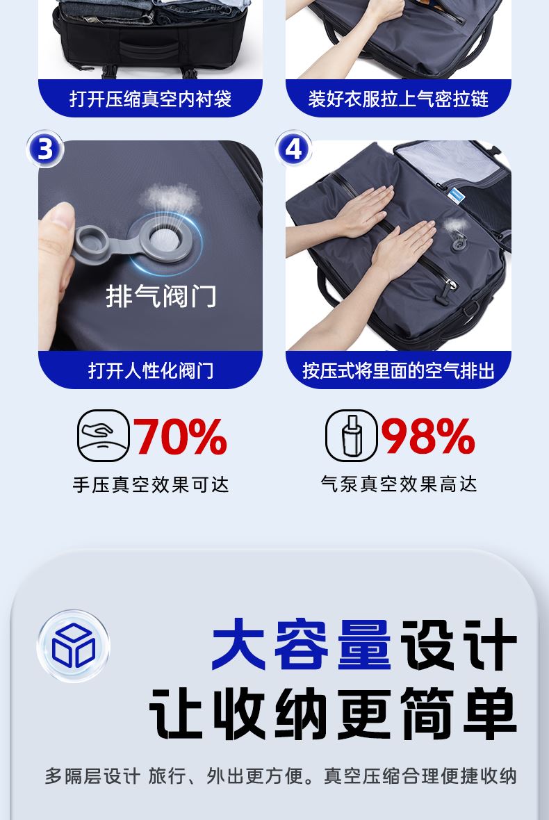 1.主仓真空压缩功能,轻松收纳行李