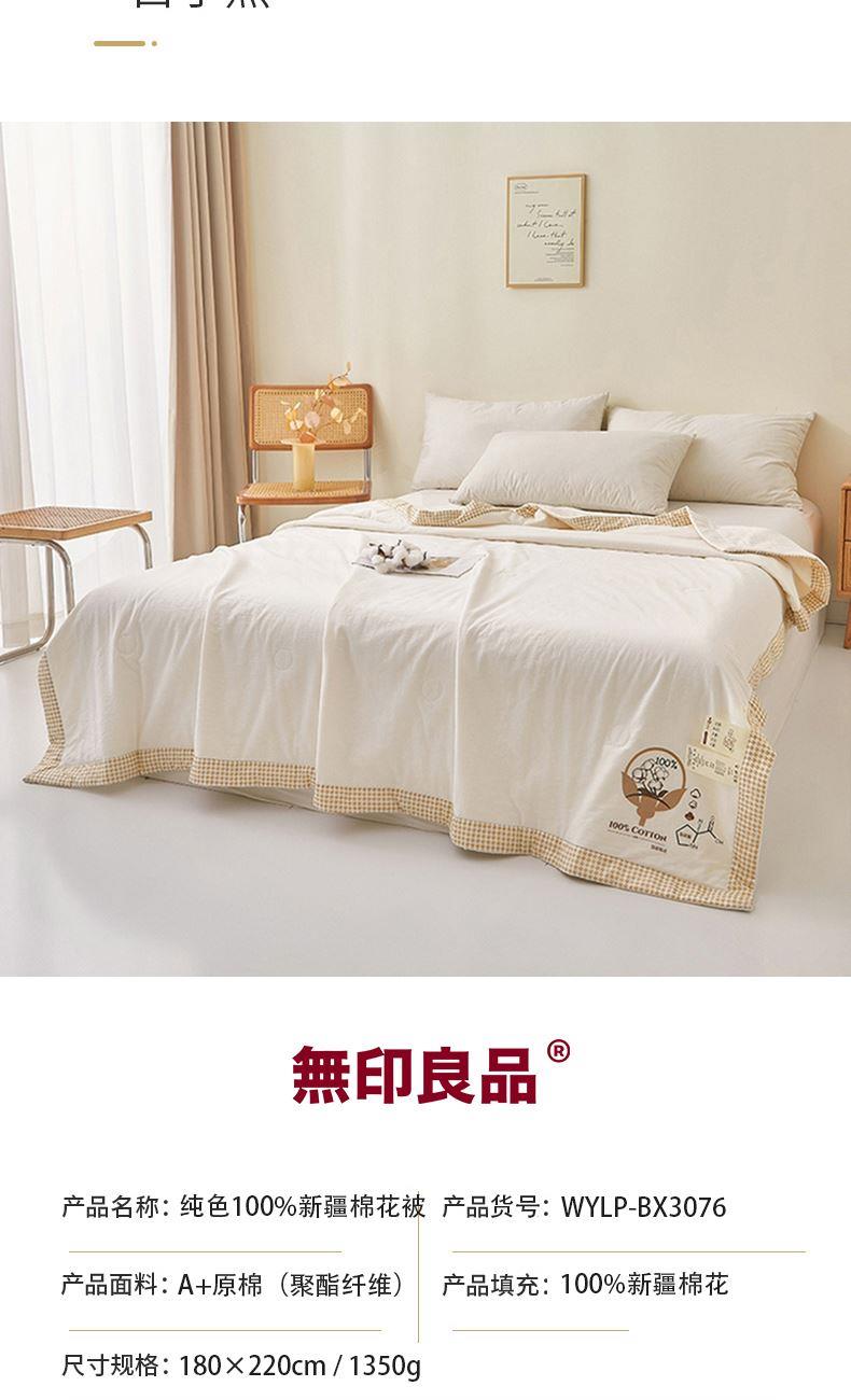 规 格:180×220cm 克重:1350g 面 料:A+原棉(聚酯纤维) 填 充:新疆棉花 “無印良品”大染无印,优良品质的产品是年轻人喜欢的,“無印”设计, 优雅 , 质朴 , 自然 , 是無印良品的初心与追求。让体验更舒适。享受简约健康生活,走进無印,上善若水,大爱无疆,创新让生活更精彩。