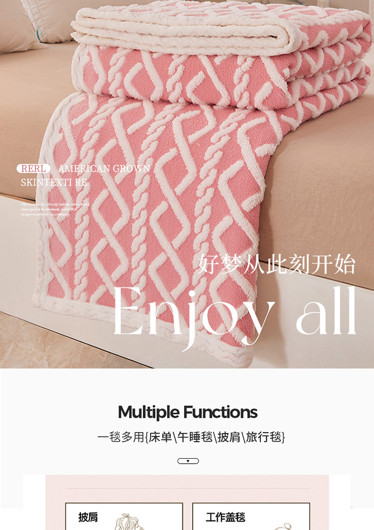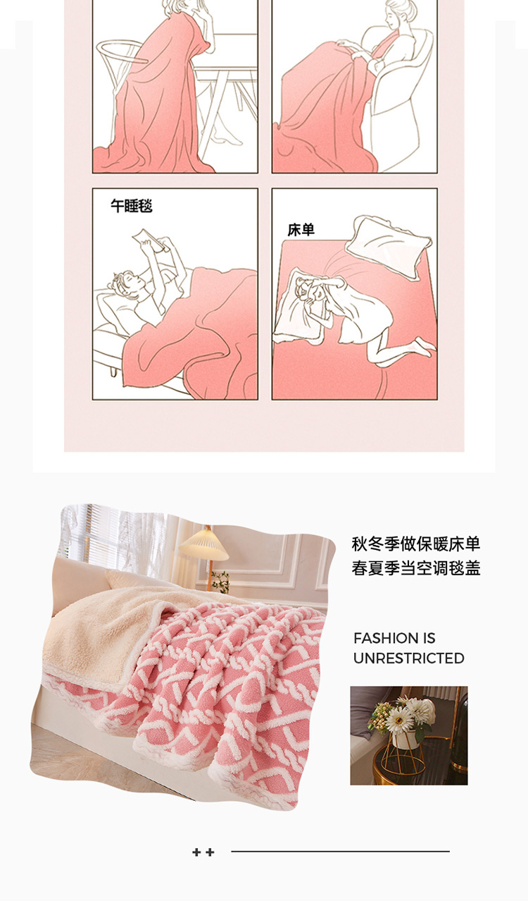 一款多用:午睡毯、车用毯、沙发毯、披肩、床用被单等等,时刻感知你的温度,给你加倍温暖。面料中植入导电丝,告别静电烦恼。面料采用活性印染技术,安全不褪色,有颜值更舒适. 面料:塔芙绒 规格:150*200cm