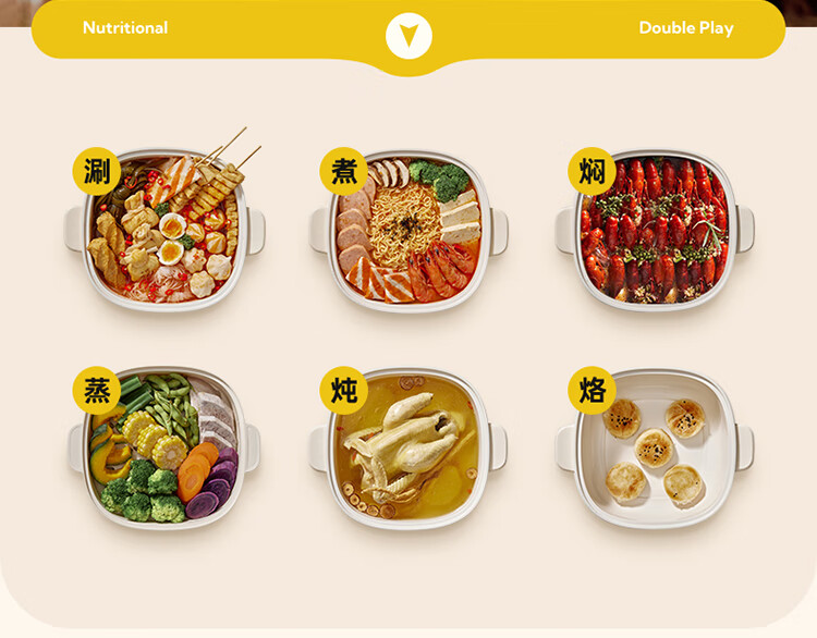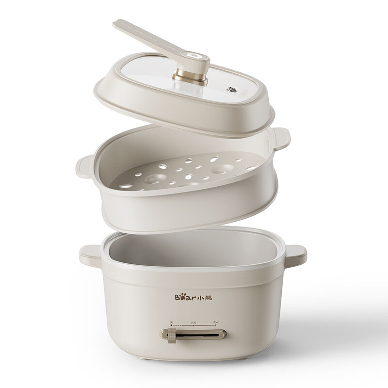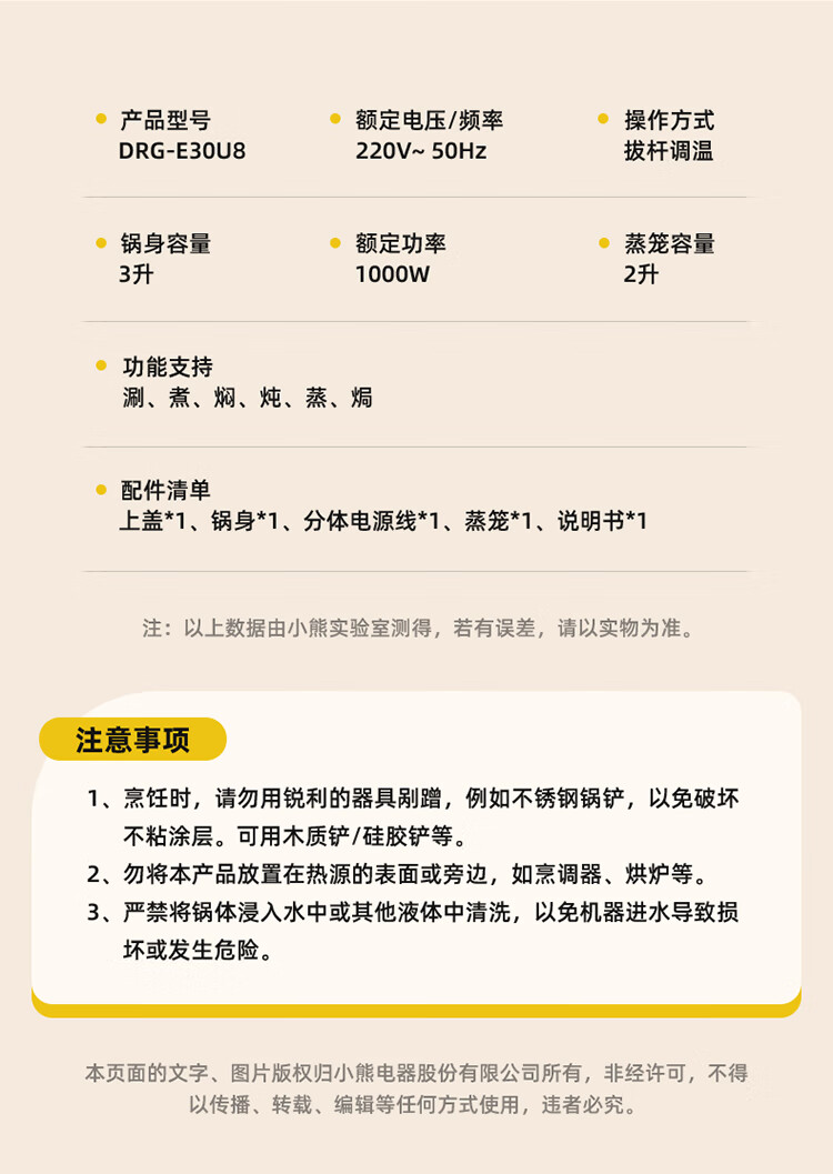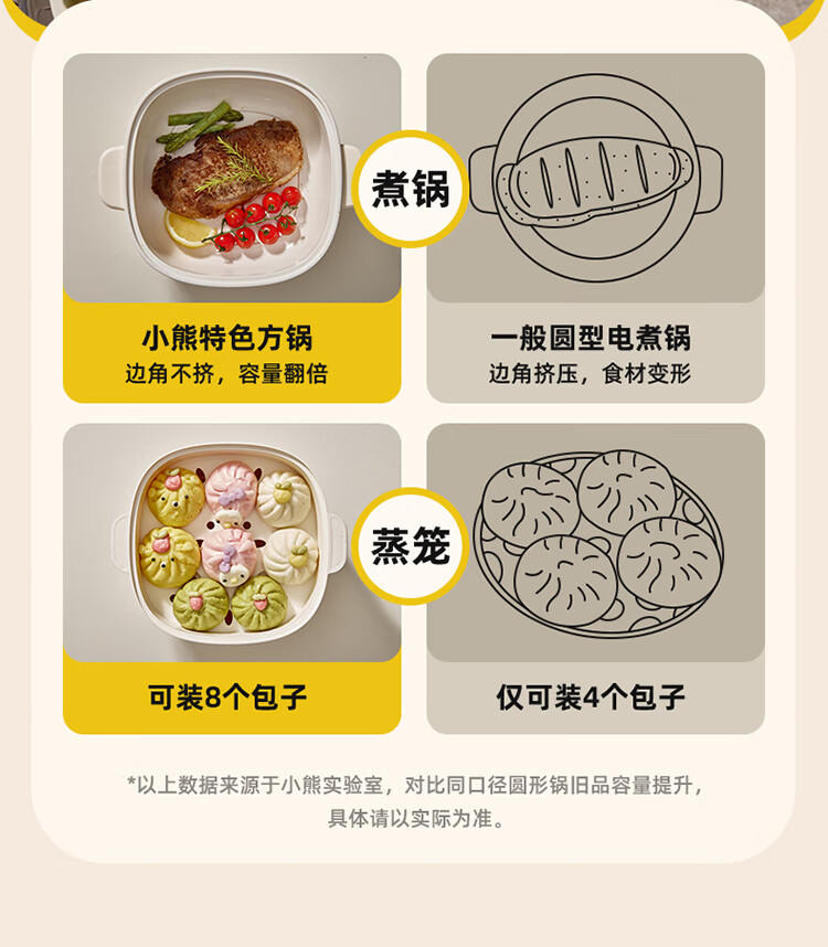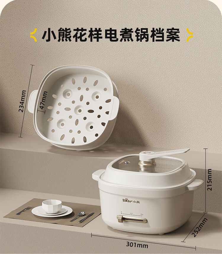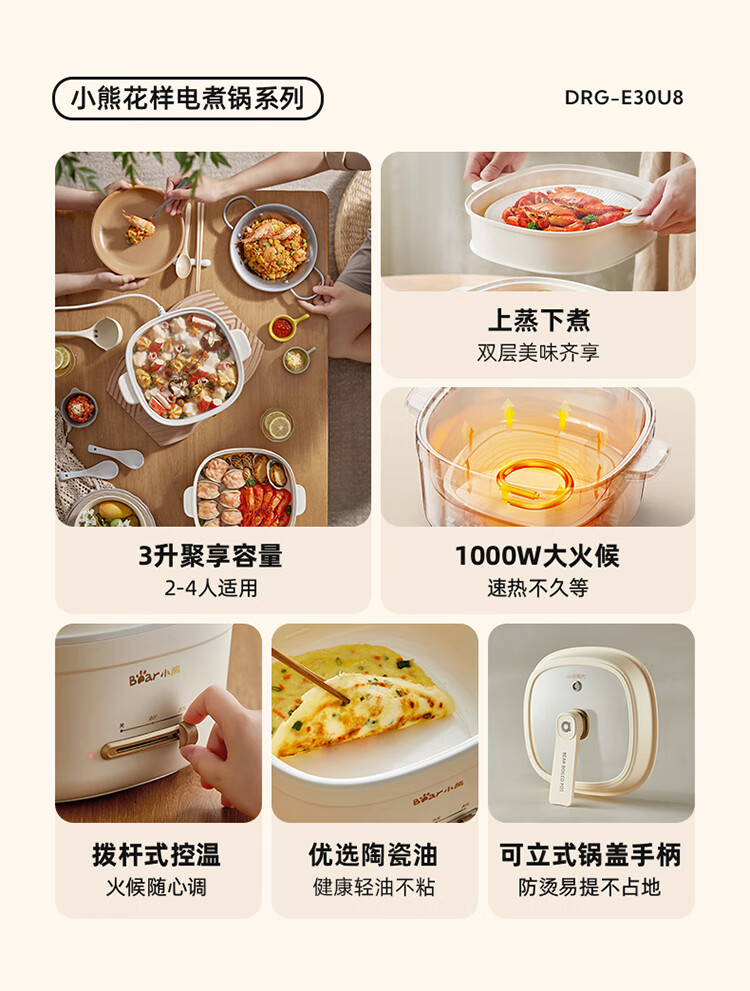 容量 3L 额定功率 1000W 产品重量 2.09kg 包装尺寸 306*306*264mm 3L容量,方盒大空间 拓展边角 广纳多滋味 机械式操控,省时上蒸下煮 1000W猛火速沸,快速均匀导热,速煮不久等