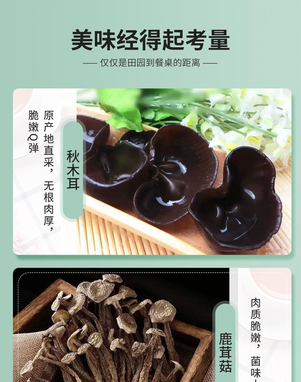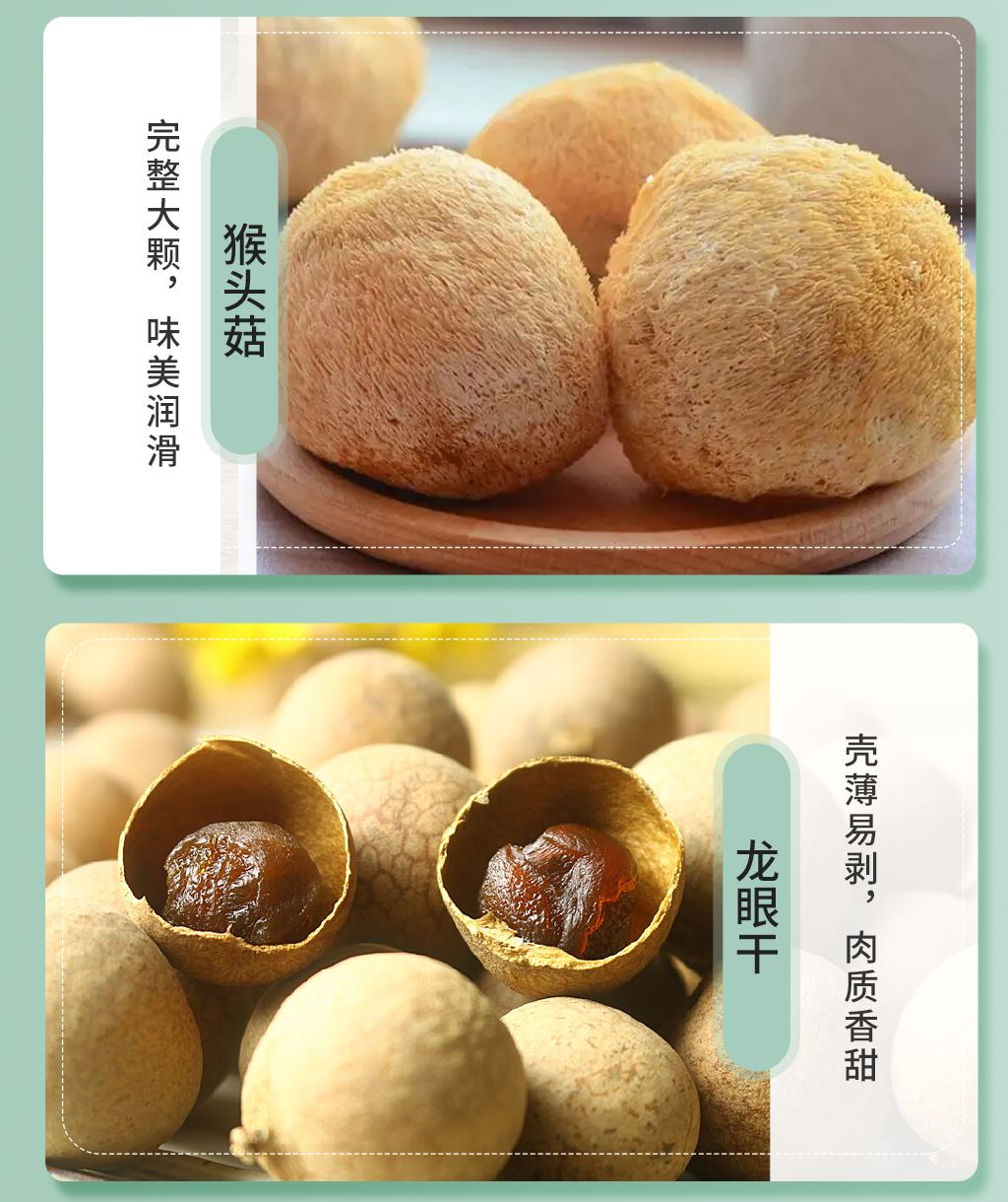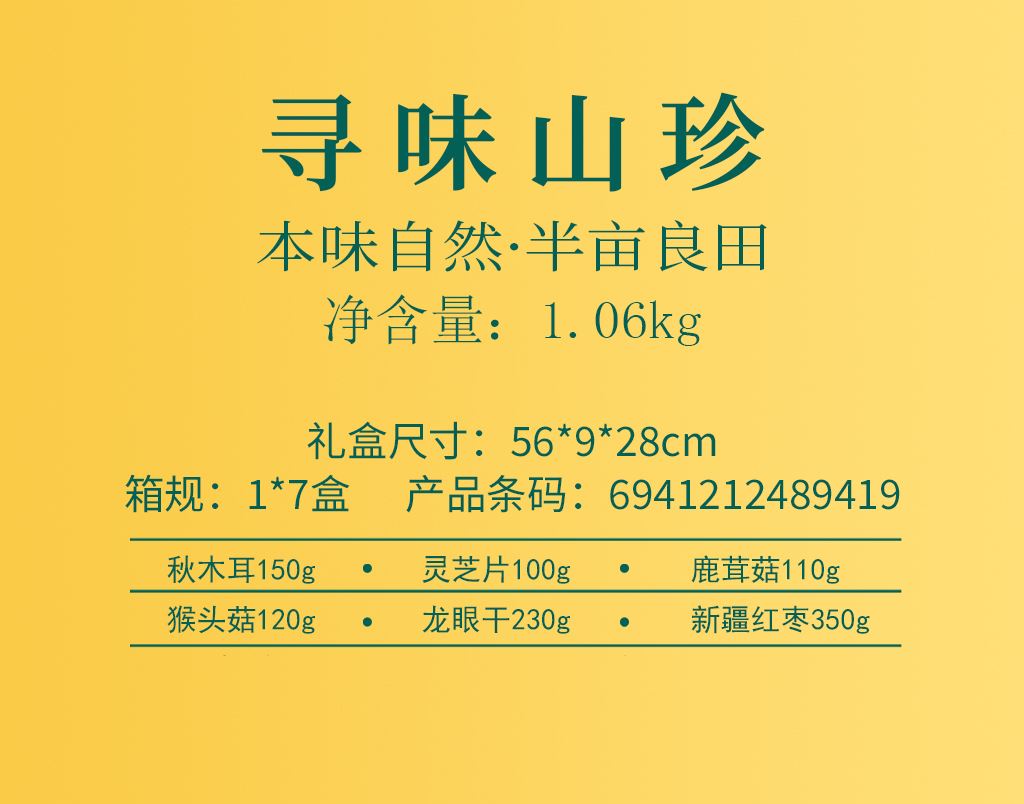 产品配置: 野生秋木耳150g、精选灵芝片100g 精选鹿茸菇110g、精选猴头菇120g 泰国龙眼干230g、新疆红枣350g 净含量:1.06kg 礼盒尺寸:56*9*28cm 精选野生秋木耳、珍有菌菇、滋补灵芝,搭配香甜果干。 精美罐装礼盒,把自然好味与健康一同打包。