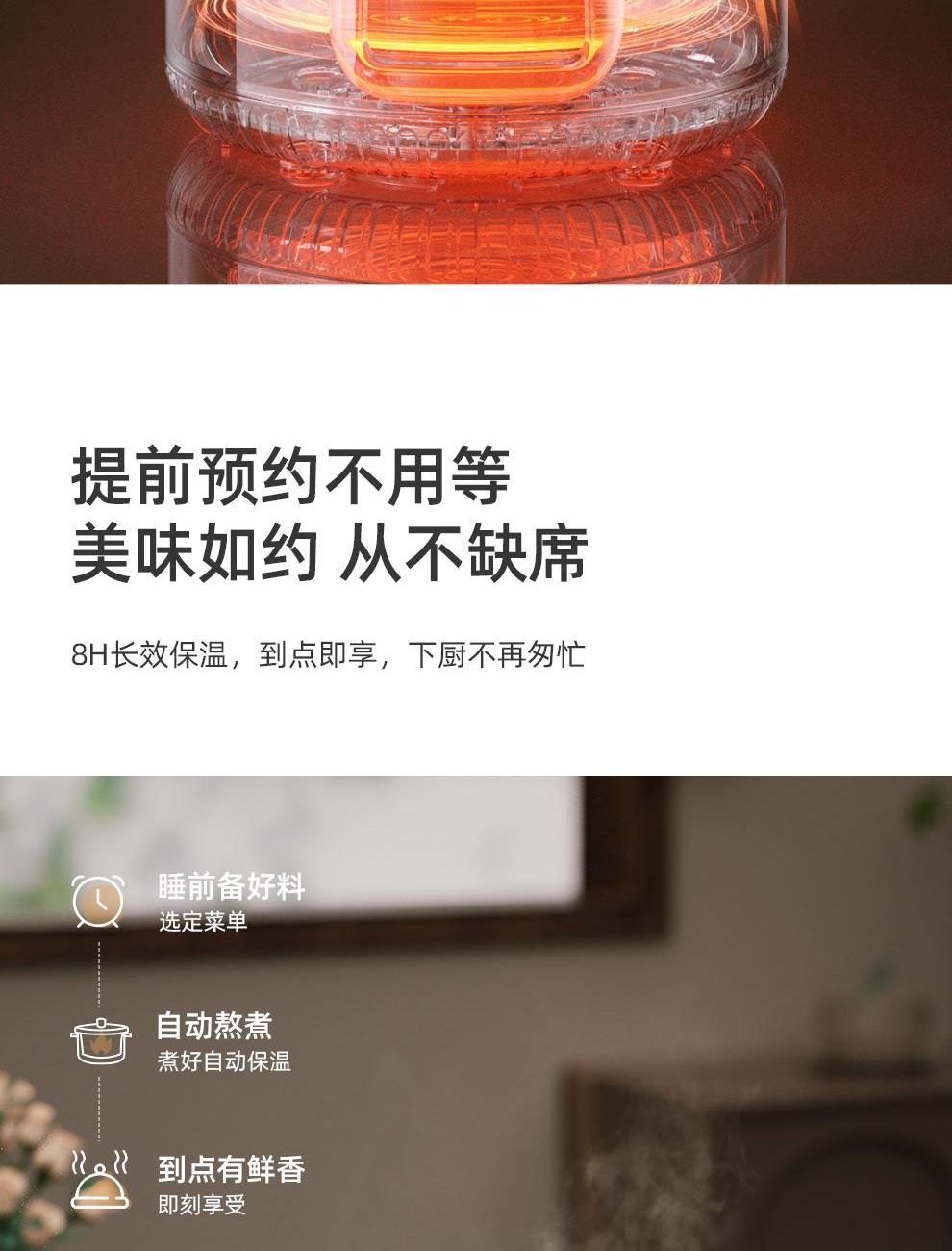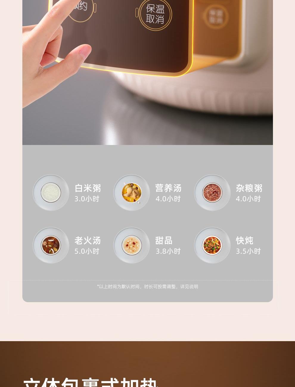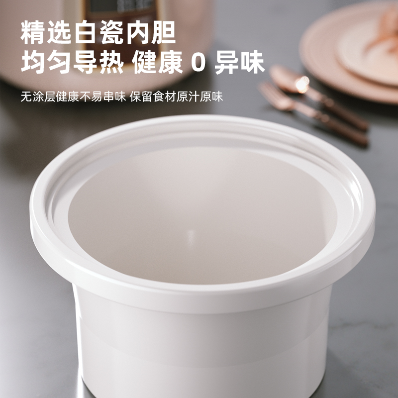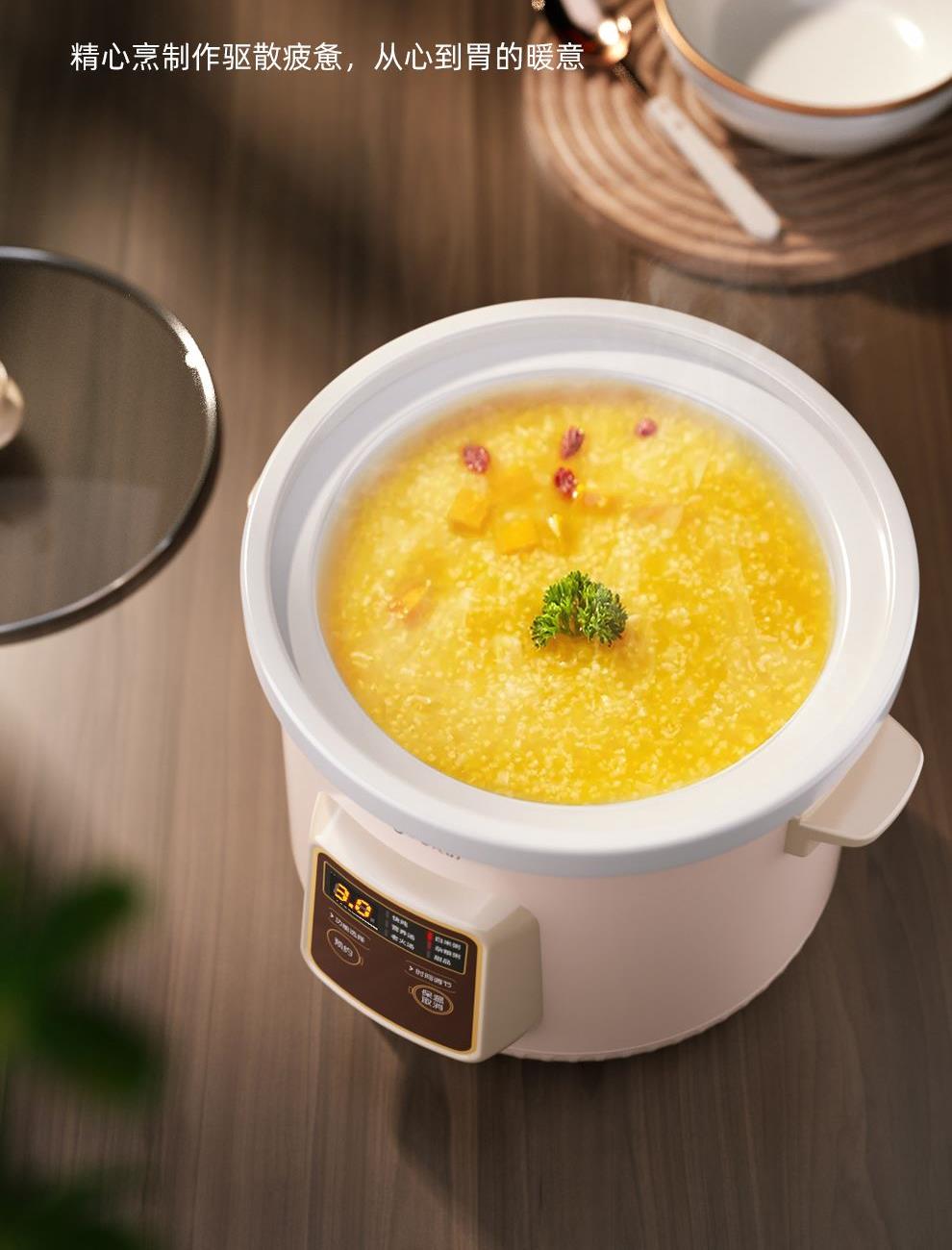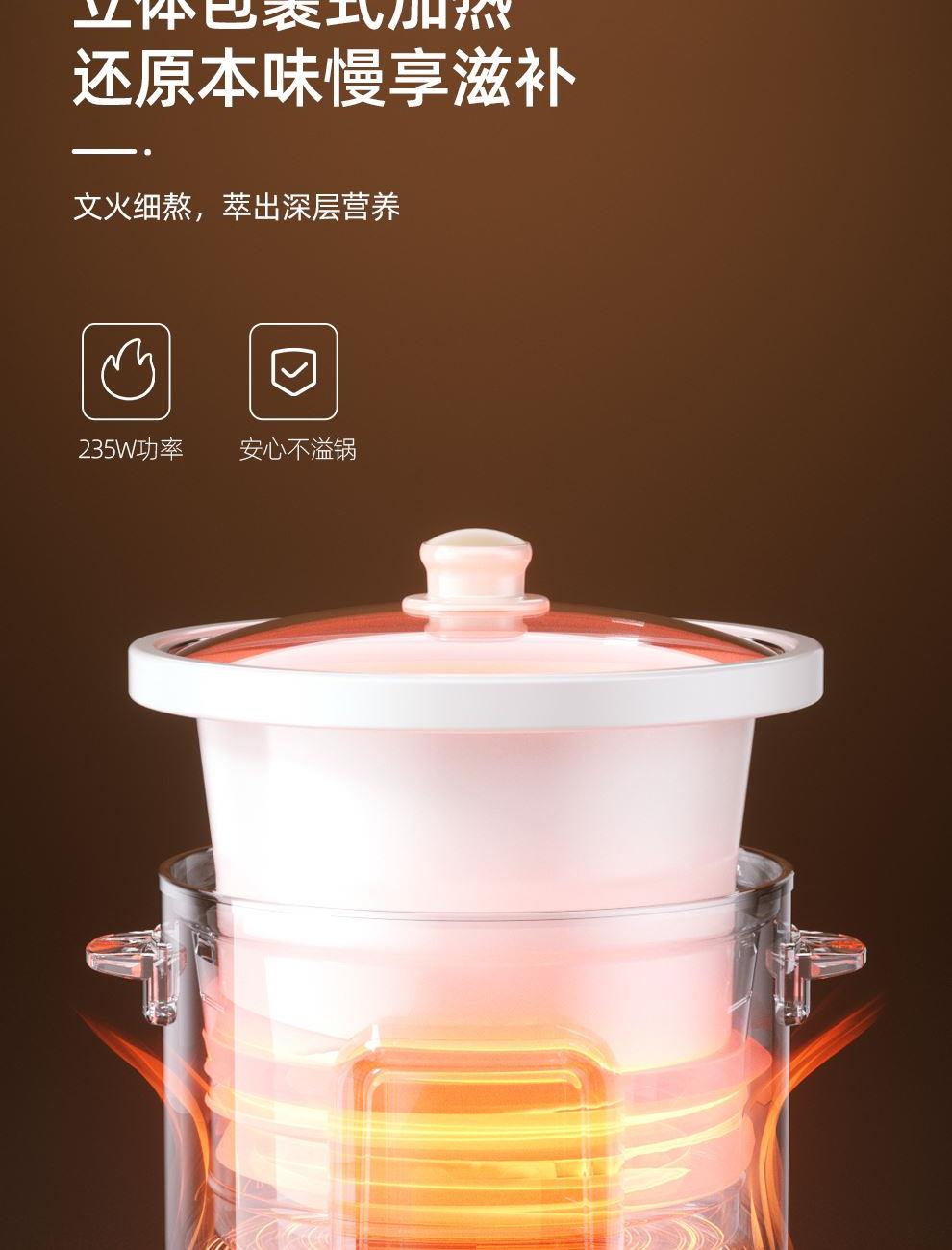 额定功率:235W 产品容量:3.0L 额定电压:220V~ 产品频率:50Hz 产品净重:2.3kg 产品毛重:2.6kg 整箱重量:16.7kg 白瓷内胆古法工艺白瓷内胆,慢炖美味 钢化玻璃盖不锈钢包边玻璃盖,可视烹饪 环绕立体加热立体环绕包裹加热,受热均匀 智能预约、保温9.5小时智能预约,8小时长效保温