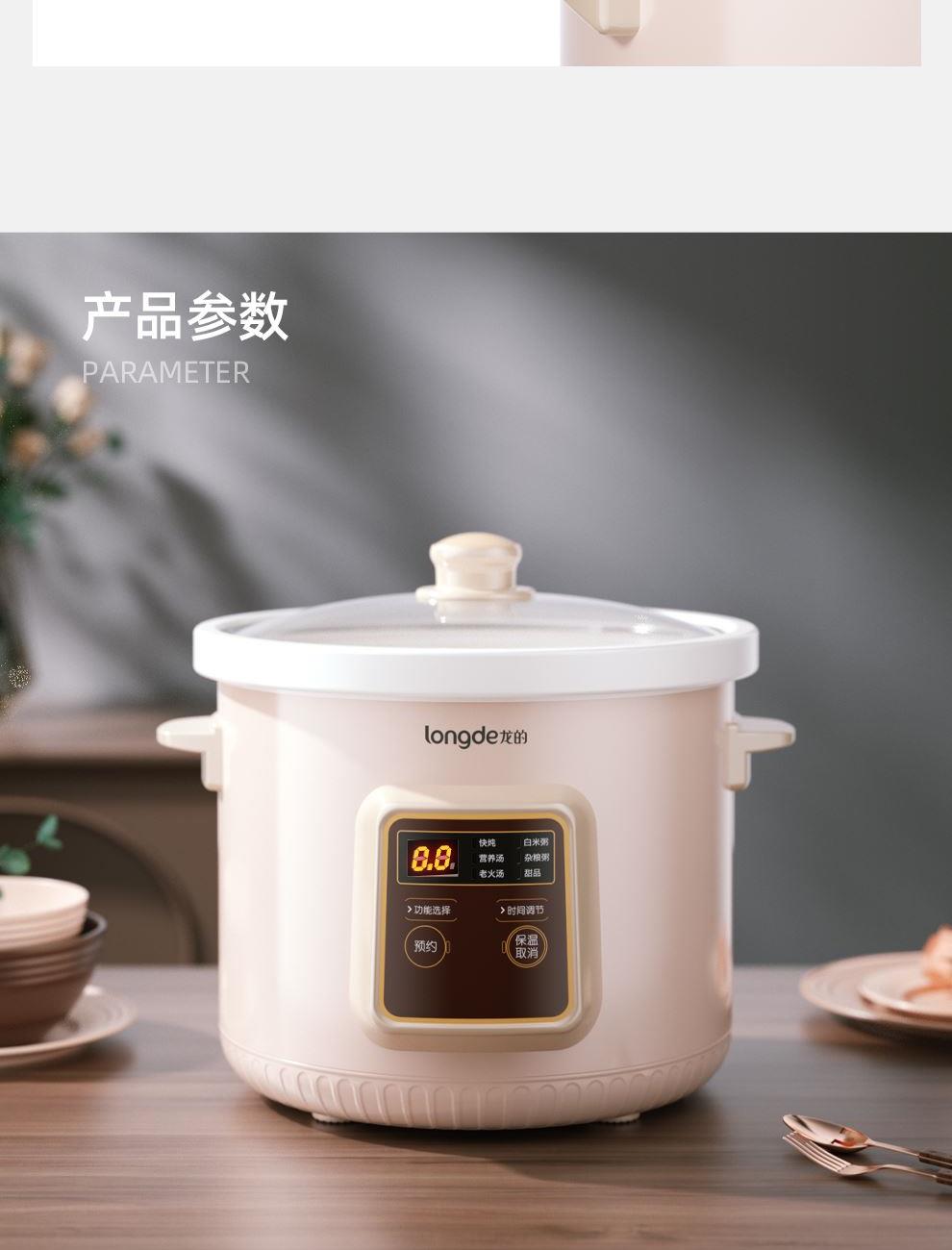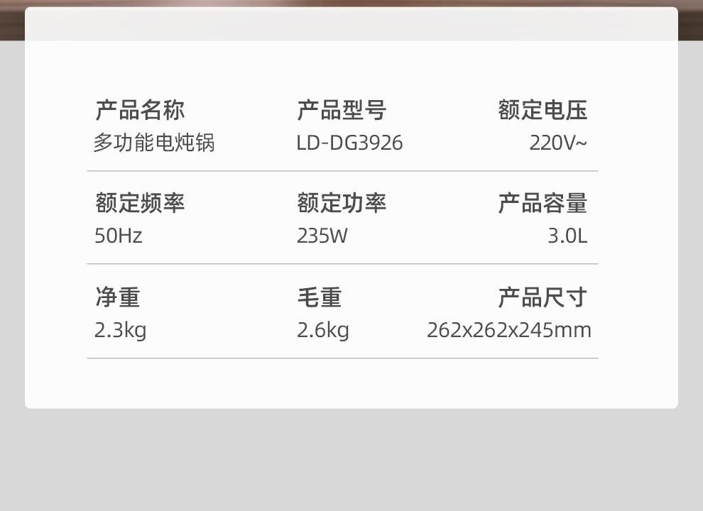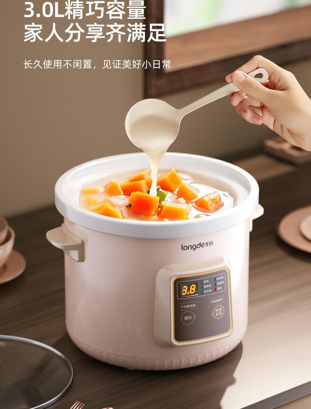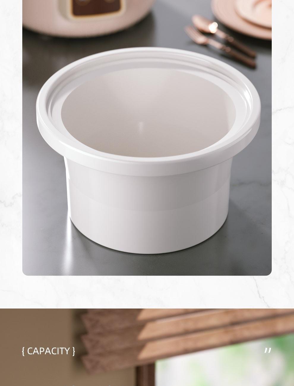 额定功率:235W 产品容量:3.0L 额定电压:220V~ 产品频率:50Hz 产品净重:2.3kg 产品毛重:2.6kg 整箱重量:16.7kg 白瓷内胆古法工艺白瓷内胆,慢炖美味 钢化玻璃盖不锈钢包边玻璃盖,可视烹饪 环绕立体加热立体环绕包裹加热,受热均匀 智能预约、保温9.5小时智能预约,8小时长效保温