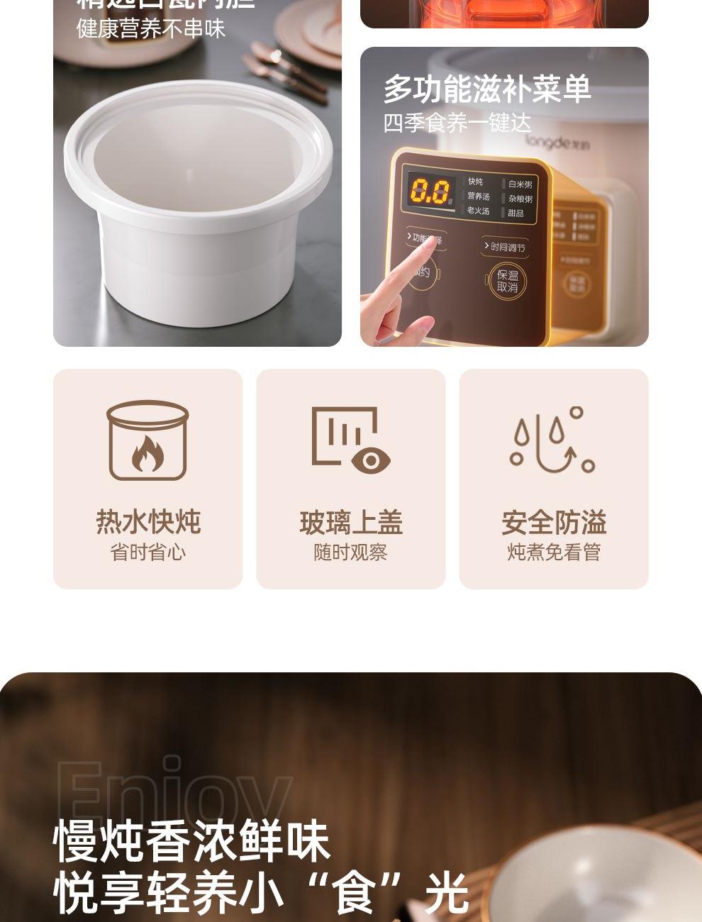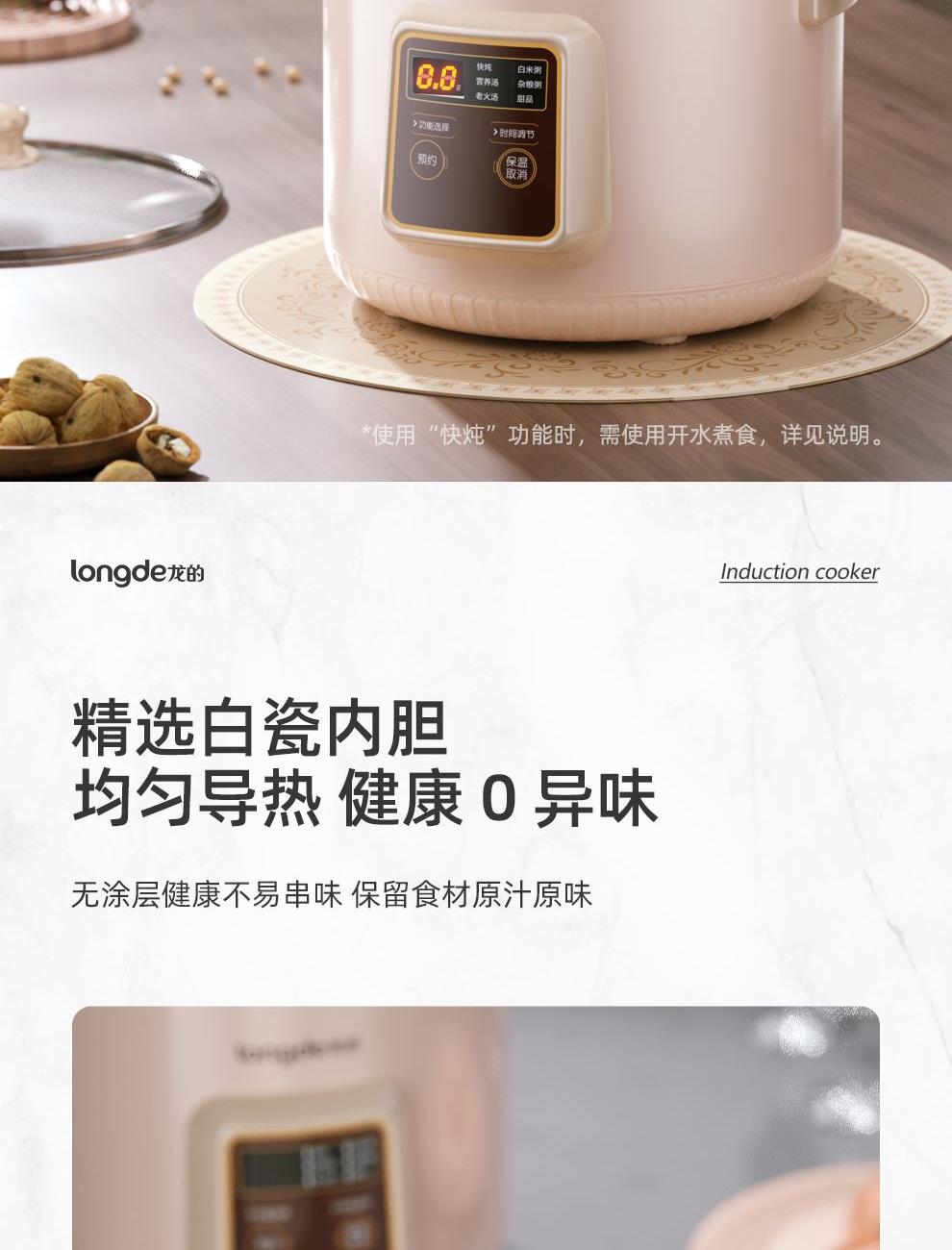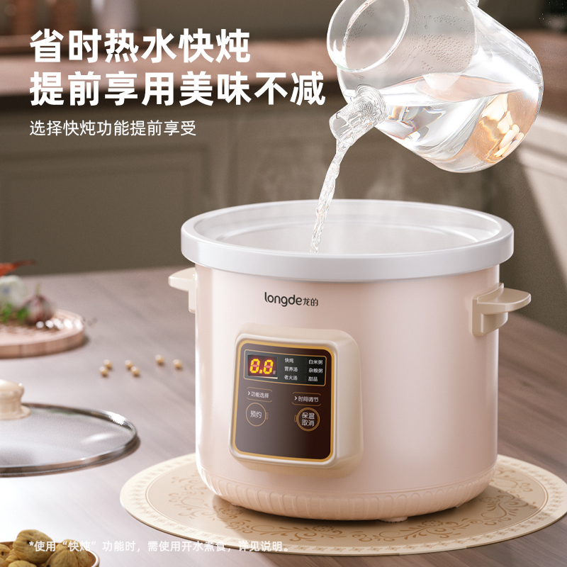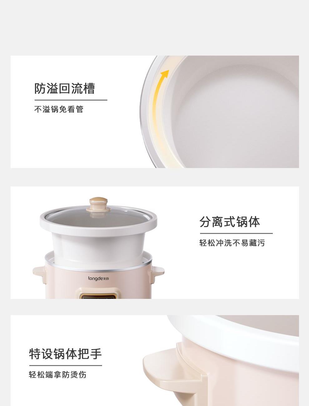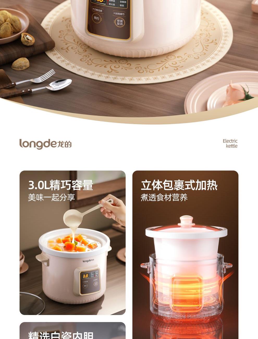 额定功率:235W 产品容量:3.0L 额定电压:220V~ 产品频率:50Hz 产品净重:2.3kg 产品毛重:2.6kg 整箱重量:16.7kg 白瓷内胆古法工艺白瓷内胆,慢炖美味 钢化玻璃盖不锈钢包边玻璃盖,可视烹饪 环绕立体加热立体环绕包裹加热,受热均匀 智能预约、保温9.5小时智能预约,8小时长效保温
