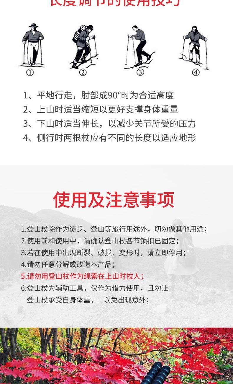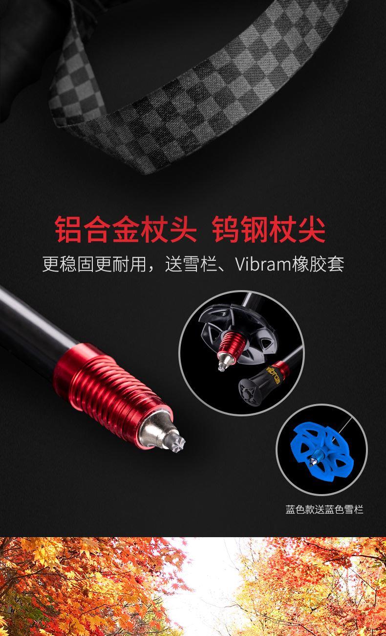 型号:NH19S010-T 产品:初雪EXT2-超轻碳纤维外锁登山杖--礼盒装 尺寸:110cm,120cm,130cm 重量:约135g,140g,145g 颜色:炽焰红、海洋蓝 材质:碳纤维 卖点: 挪客手杖系列中超轻的徒步杖,仅重约135g 高强度碳纤维,轻量便捷,牢固强韧 EVA防滑直柄,EVA竹节式直柄设计,防滑效果更佳 铝合金杖头 钨钢杖尖,更稳固更耐用,送雪栏、Vibram橡胶套