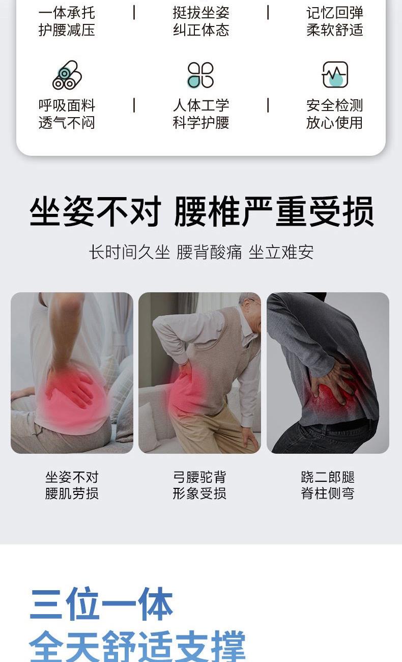 1、矫姿坐靠一体 坐出健康好体态 2、三位一体 腰部支撑 背部固定 臀部固定 3、加厚记忆棉,坐感Q弹,高阶守护 4、改善坐姿,远离驼背、近视 5、一体成型工艺,帮助稳固坐姿