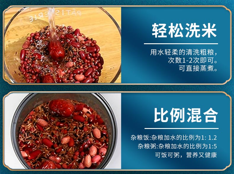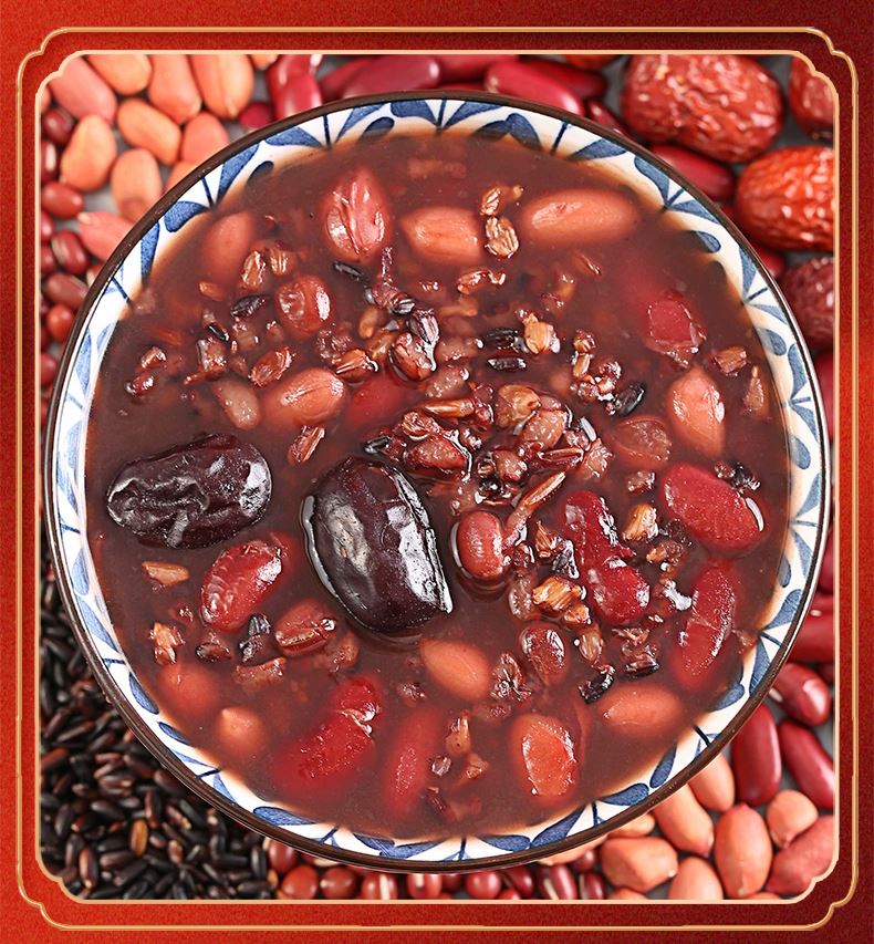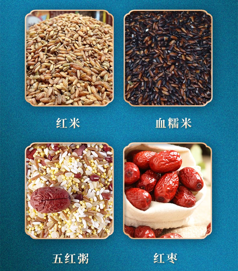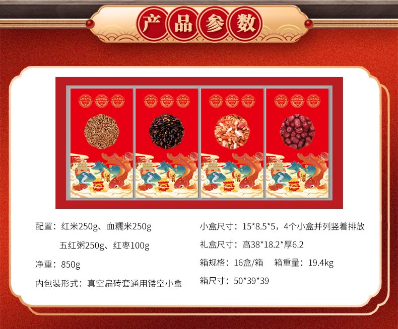条码:6972761600833 配置:红米、血糯米、五红粥各250g 红枣100g 净重:850g 内包装:真空扁砖套镂空小盒 盒尺寸:高39*18*厚5.4 16盒/箱 箱重量:19.4kg 箱尺寸:50*39*39(0.076方)