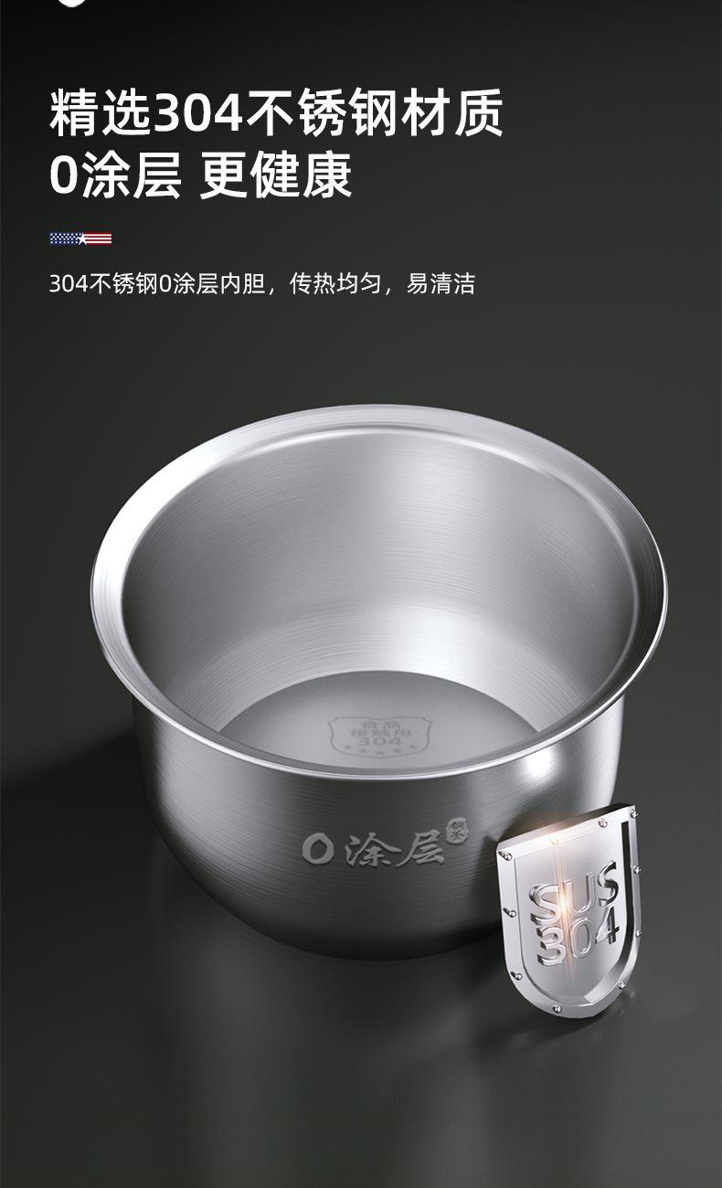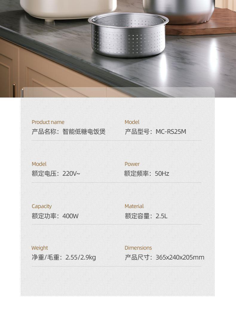 额定功率:400W 额定容量:2.5L 额定电压:220V~ 额定频率:50Hz 产品净重:2.55kg 产品毛重:2.9kg 整箱重量:12.9kg 0涂层内胆304不锈钢0涂层内胆更健康,2.5L精巧容量满足私享/小聚; 健康低糖饭304不锈钢蒸胆,米汤分离,低糖饭香而不甜; 多功能&24h预约8大智能触控菜单,24h智能预约,烹饪时间随心掌控; 配置304不锈钢内胆+304不锈钢降糖内胆。