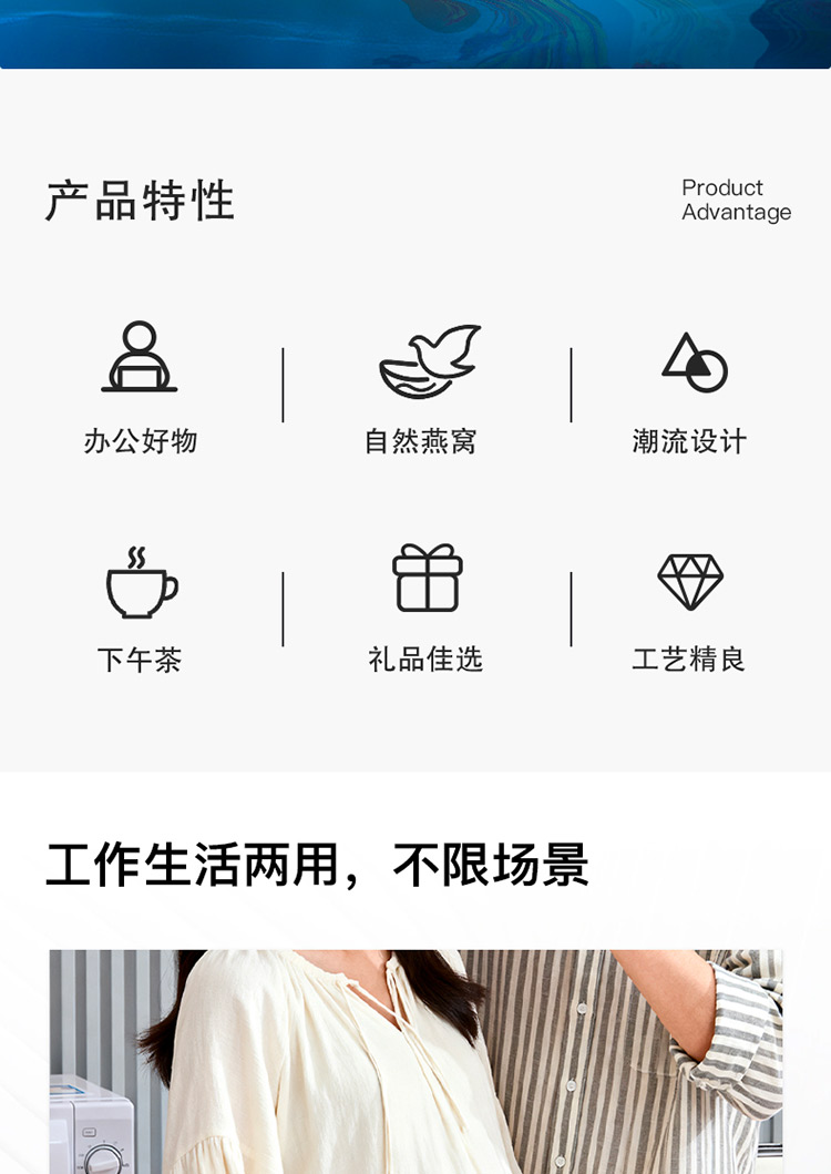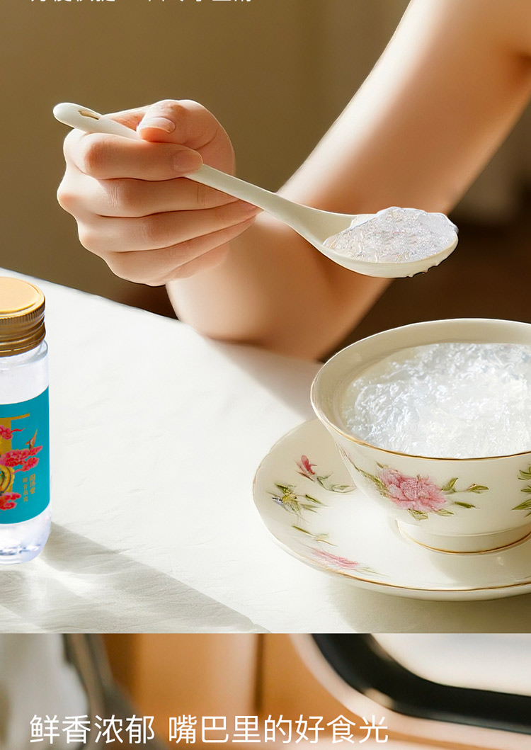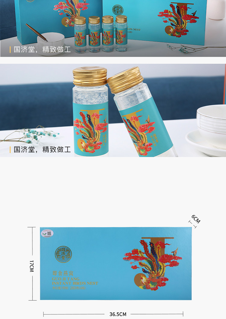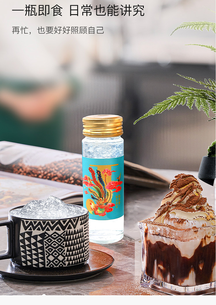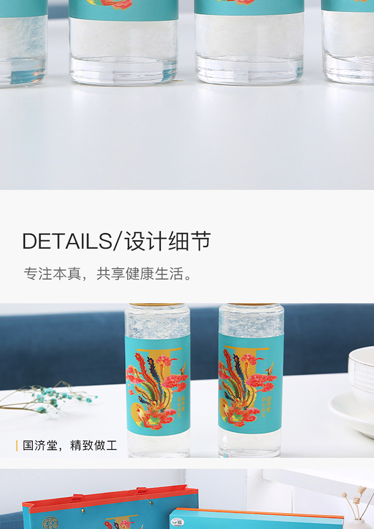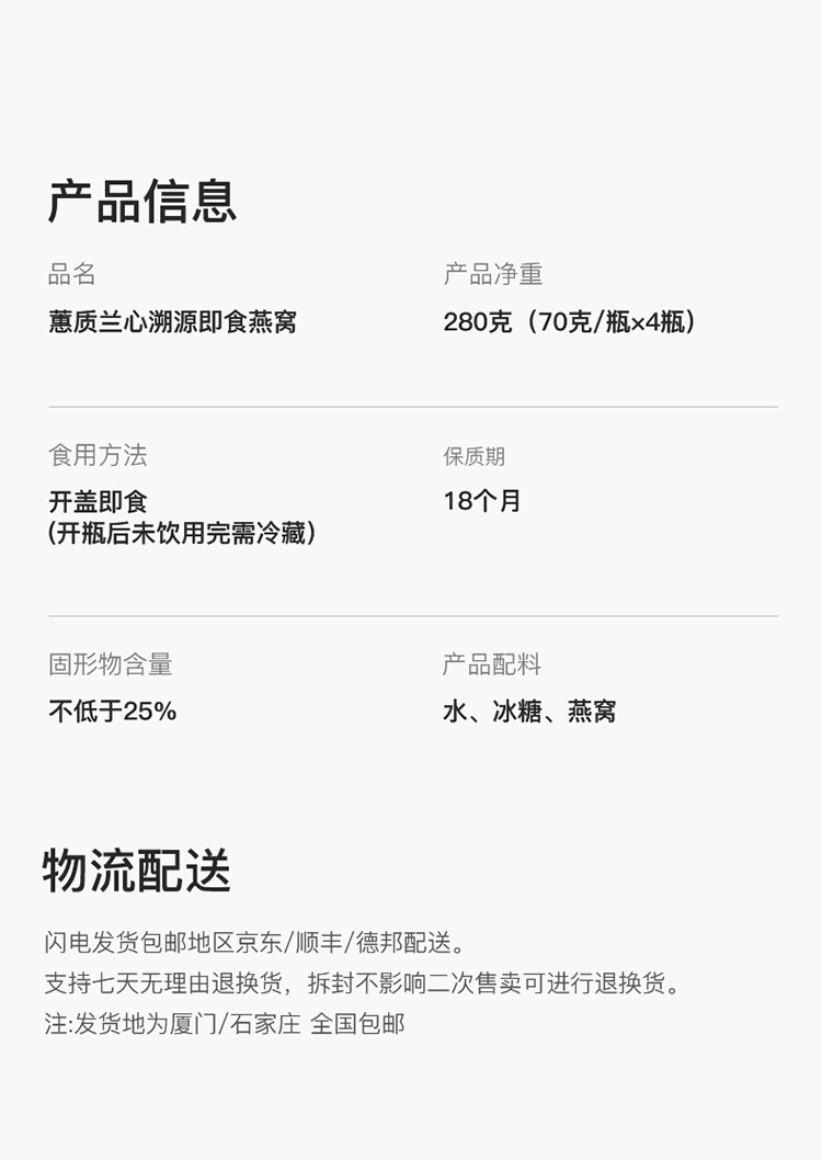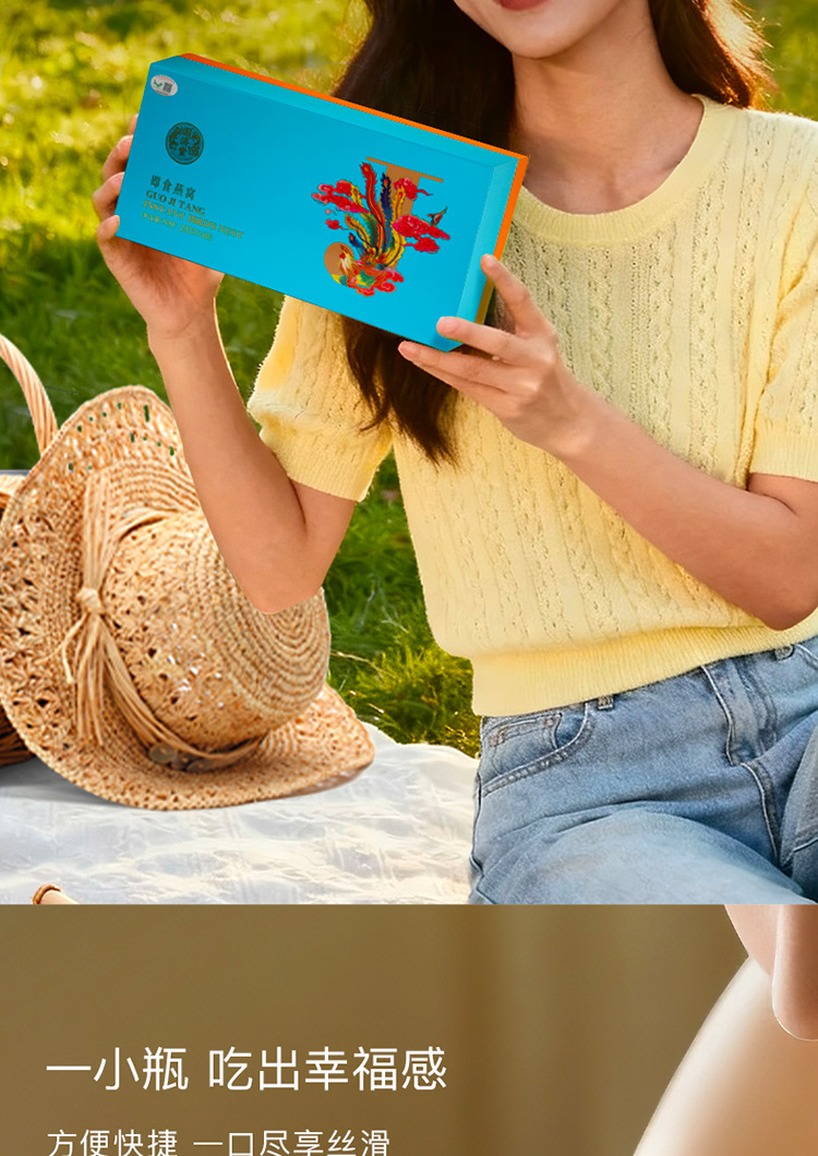 配置:4瓶/盒固形物含量≥25% 干燕窝投料:1.1克 净含量:70克*4瓶(280克) 配料:水、冰糖、燕窝 食用方法:开盖即食,阴凉干燥处储存。 产品特点: 全新包装设计,延续清新的靛蓝色风格; 4瓶便携装即食燕窝,低脂低糖,补充胶原蛋白; 适用于女性轻滋补,公司福利、银行保险行业中低价礼品系列。