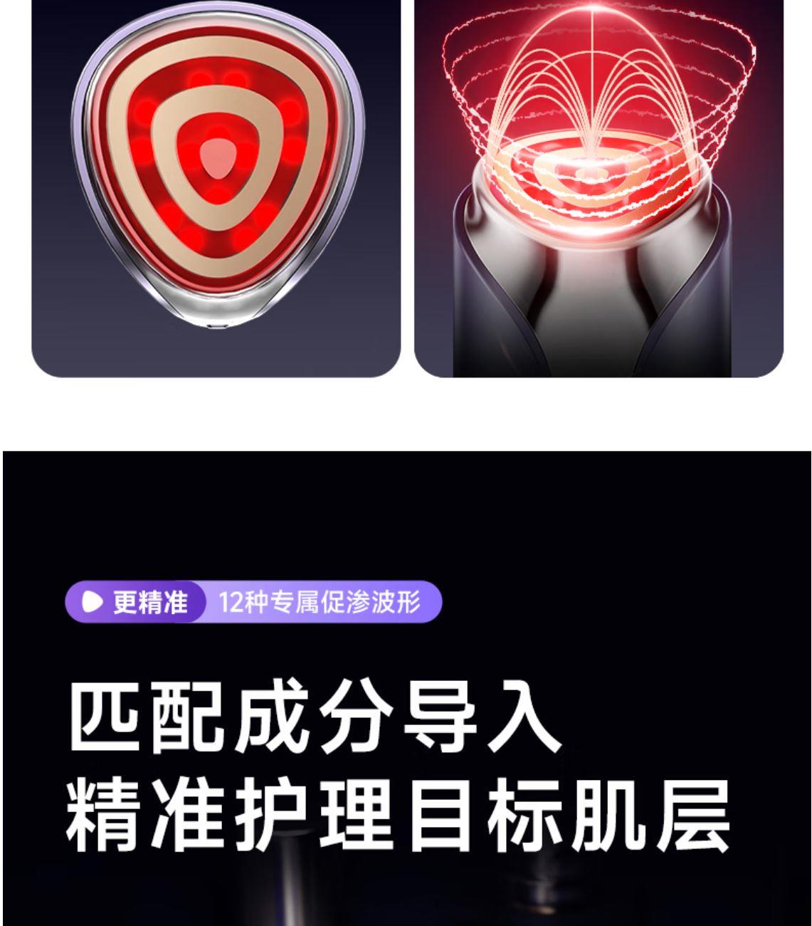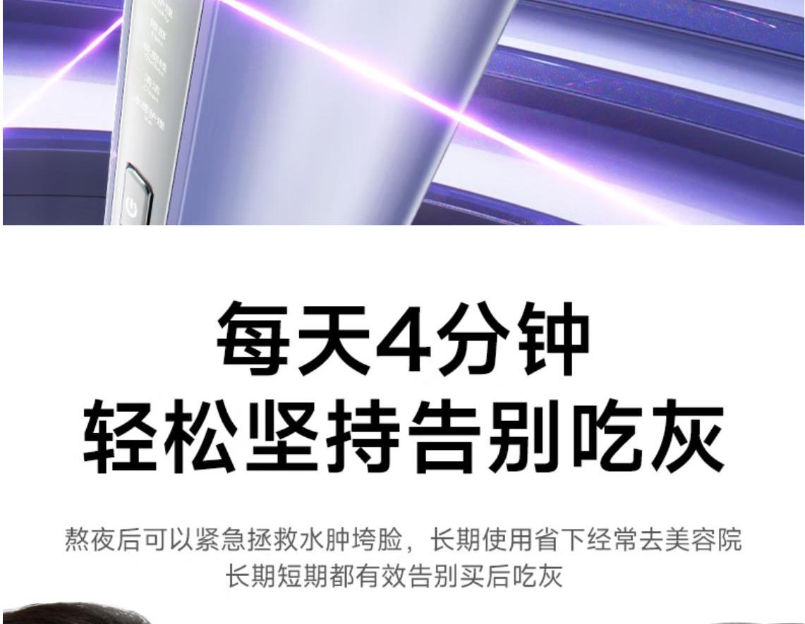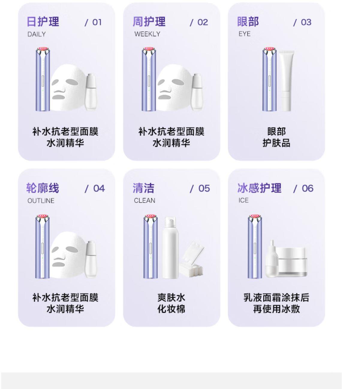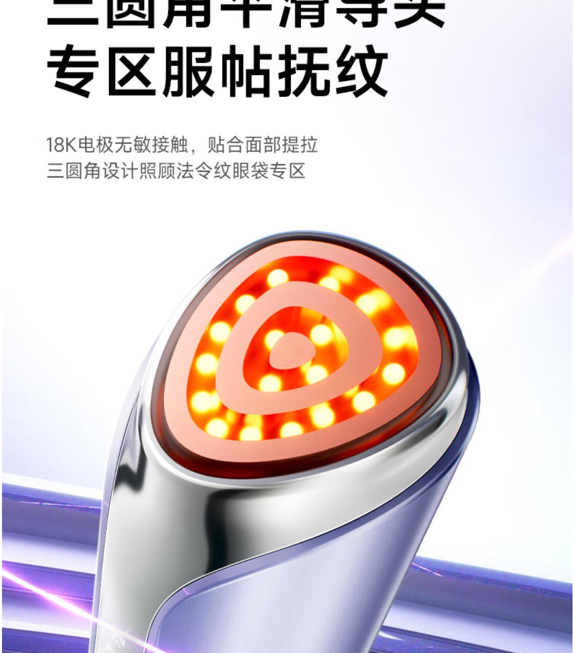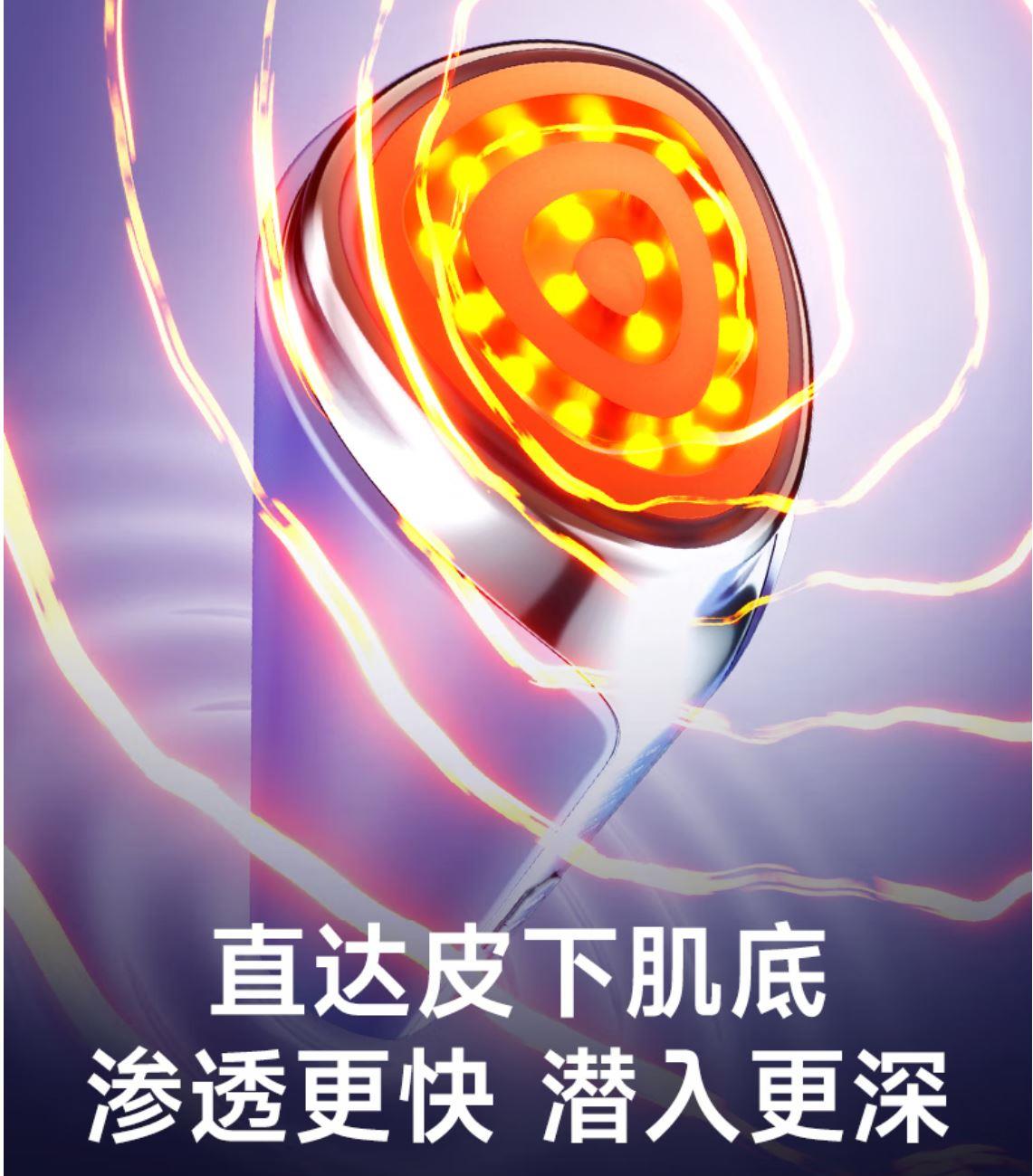 特色功能:透皮导入,热敷模式,震动按摩,冰敷模式 适用部位:颈部,眼部,面部 功效:导入促渗,提拉瘦脸 适用场景:家用,宿舍,户外便携 额定电压:3.7V 额定功率:5W 产品尺寸:长153mm;宽38mm;高36mm 核心技术:温度控制;EMS脉冲;微电流 加热温度:37℃ LED美容光:蓝光;红光;琥珀光;黄光 包装清单:主机*1、说明书*1、Type-C充电线*1