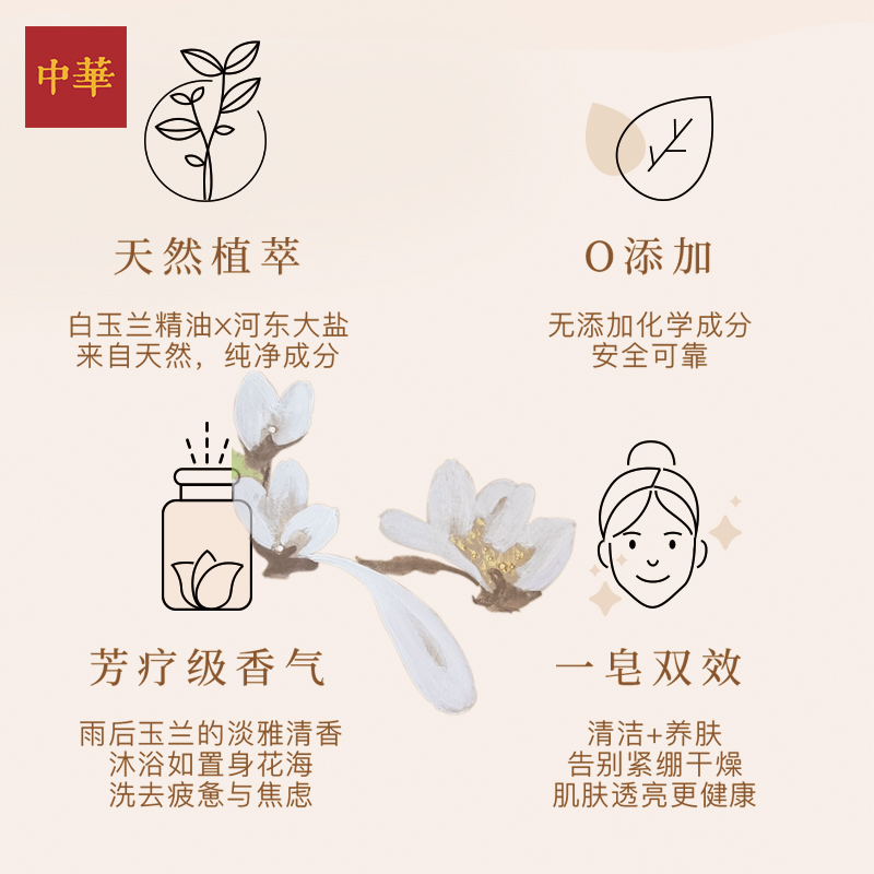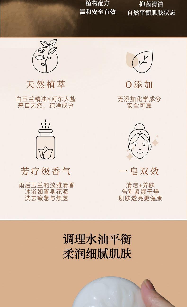 白兰花造型,白兰花精油手工皂。 【功效】:玉兰清韵花香愉悦舒心,抚平压力与焦虑。大盐玉兰精油成分,温和清洁,为肌肤补充多重矿值物养分,维持洁净健康的肤质。 【成分】:白玉兰精油,河东大盐,植物手工皂基