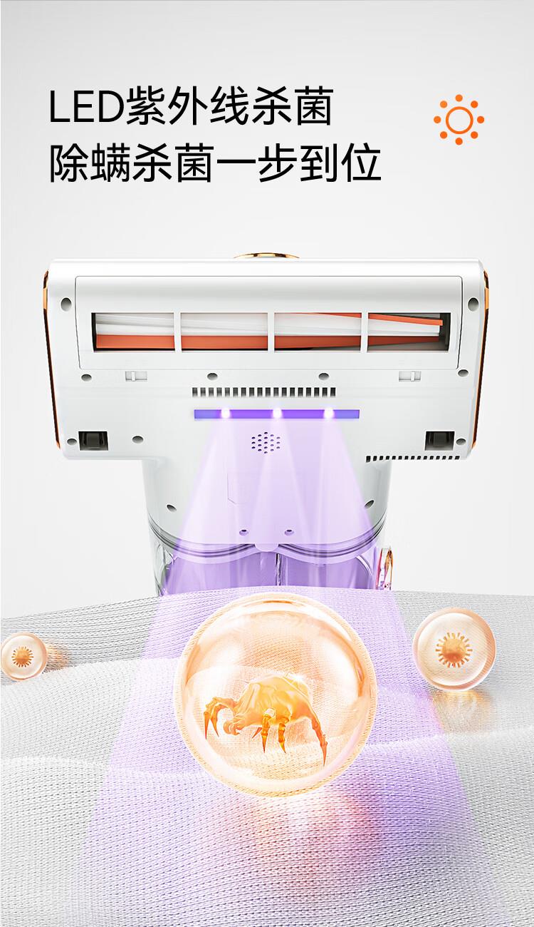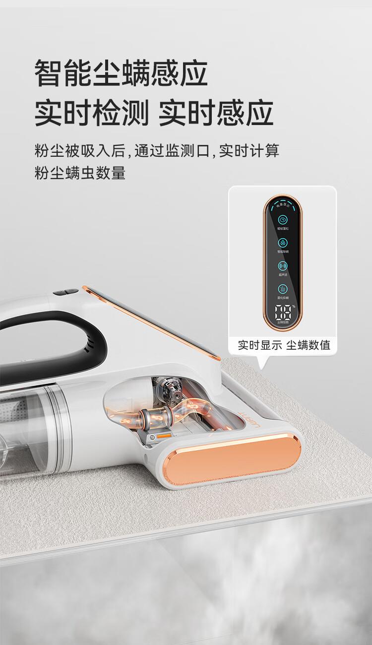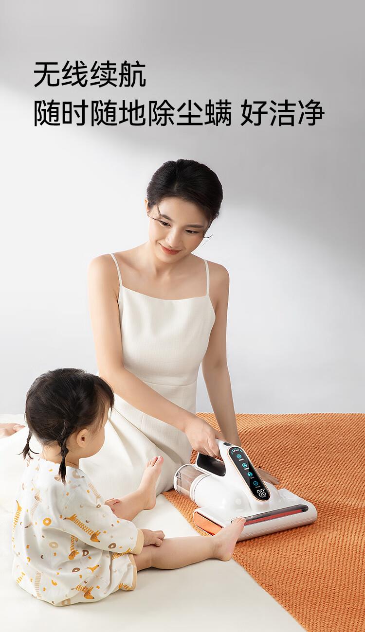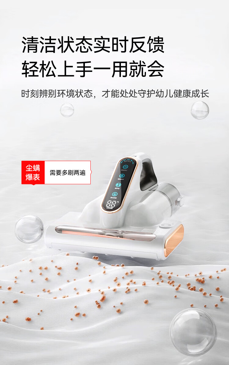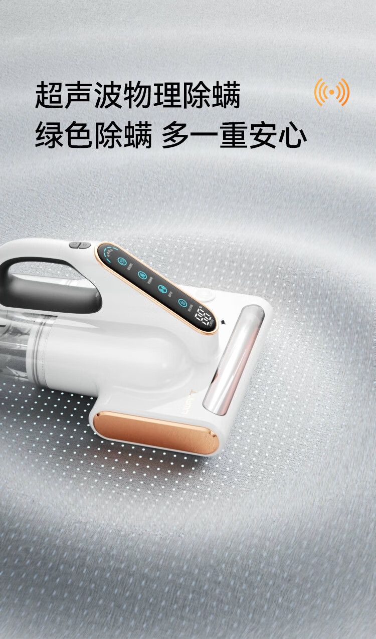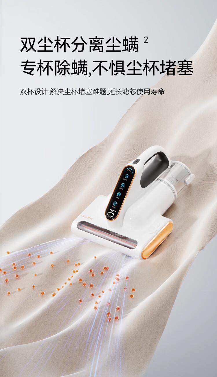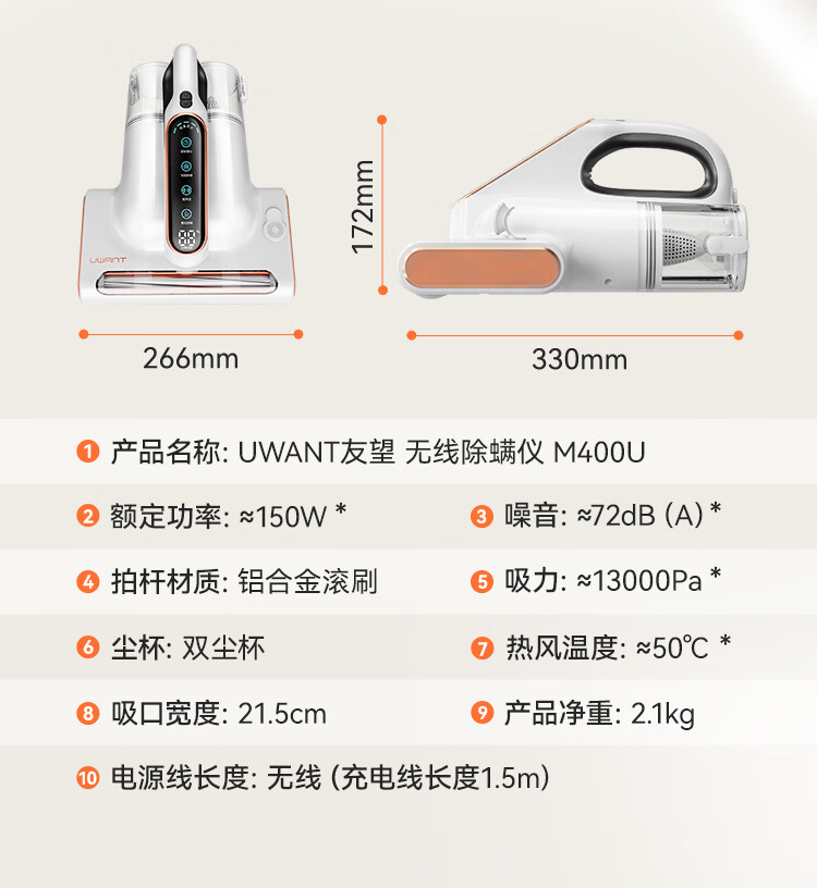 产品参数: 功率 150W 吸力 13000Pa 拍打宽度:215mm 电源线长度:无线 拍打频率:36000次/min 电池容量:26000mAh 产品描述: 1.无线除螨仪 ,随吸随走更轻松 2.特调高效除螨液 ,安全认证放心使用 双尘杯尘气分离 ,一倒即净 3.大屏显示尘螨指数 ,告别盲目除螨 4.两档除螨模式自由切换