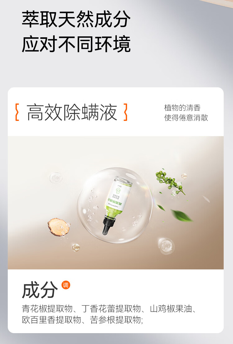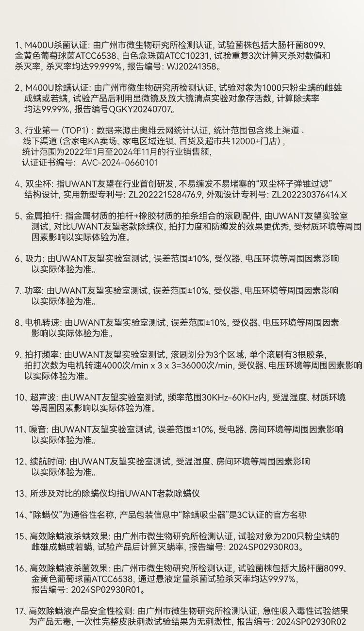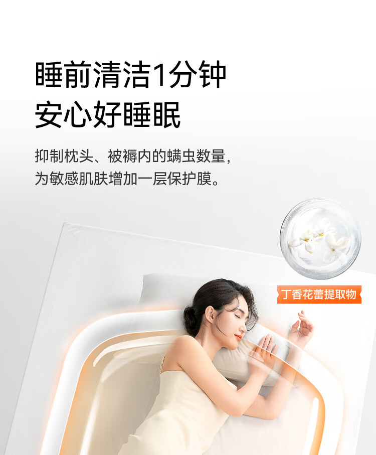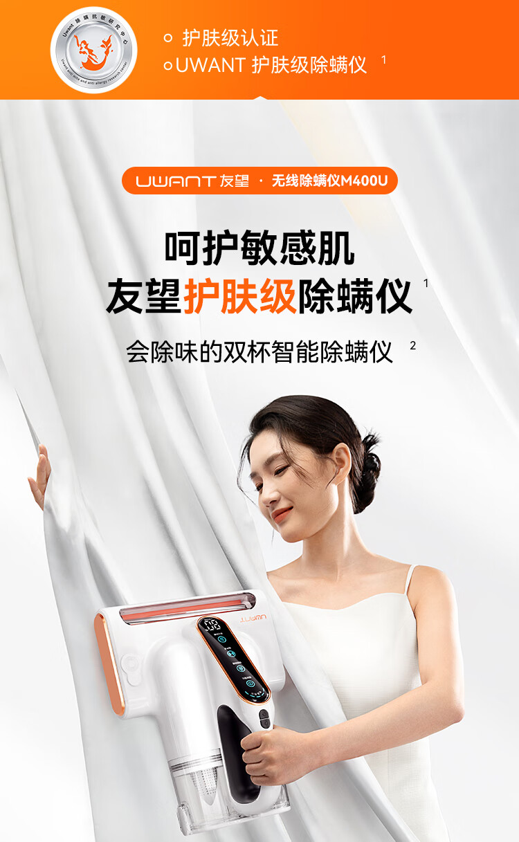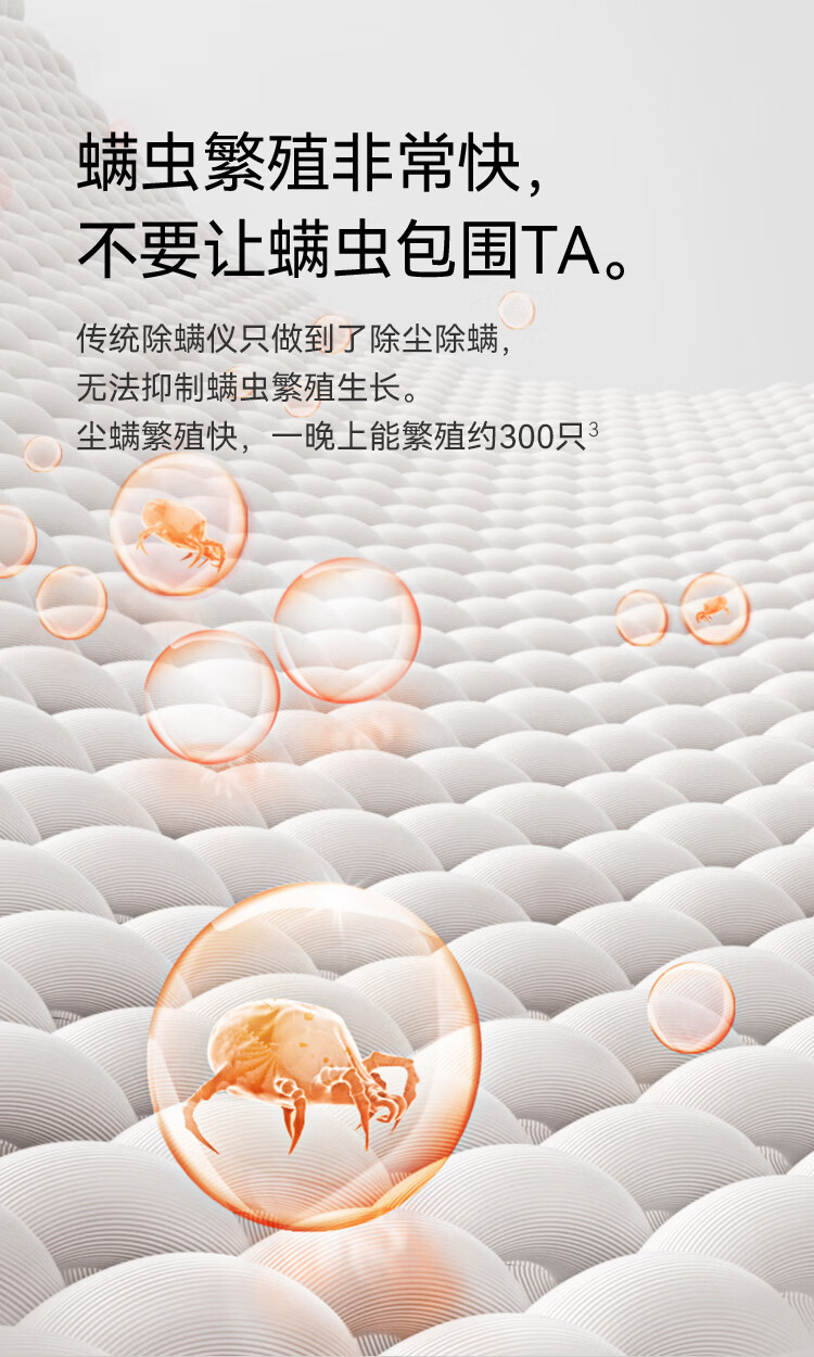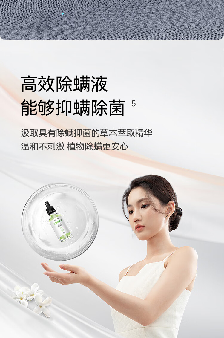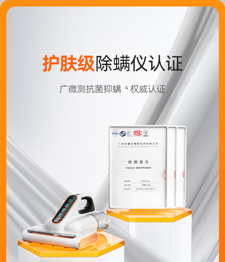 产品参数: 功率 150W 吸力 13000Pa 拍打宽度:215mm 电源线长度:无线 拍打频率:36000次/min 电池容量:26000mAh 产品描述: 1.无线除螨仪 ,随吸随走更轻松 2.特调高效除螨液 ,安全认证放心使用 双尘杯尘气分离 ,一倒即净 3.大屏显示尘螨指数 ,告别盲目除螨 4.两档除螨模式自由切换