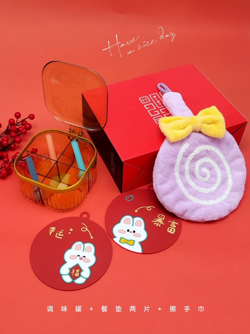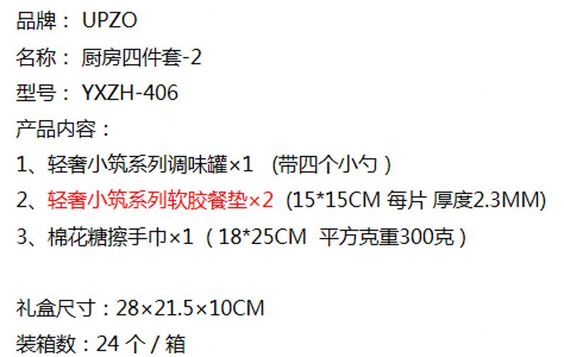 型号: YXZH-406 产品内容: 1、轻奢小筑系列调味罐×1 (带四个小勺) 2、轻奢小筑系列软胶餐垫×2 (15*15CM 每片 厚度2.3MM) 3、棉花糖擦手巾×1 ( 18*25CM 平方克重300克 ) 礼盒尺寸:28×21.5×10CM