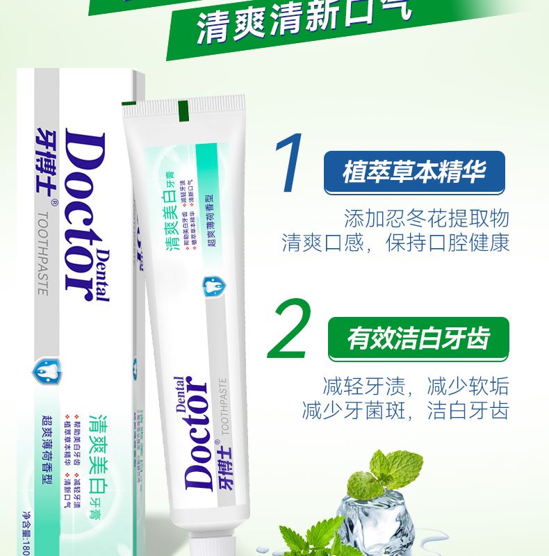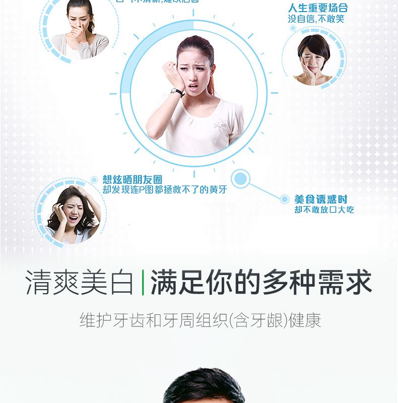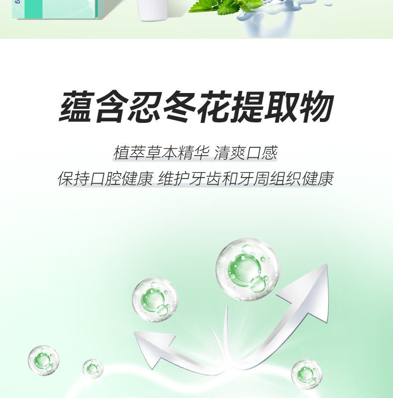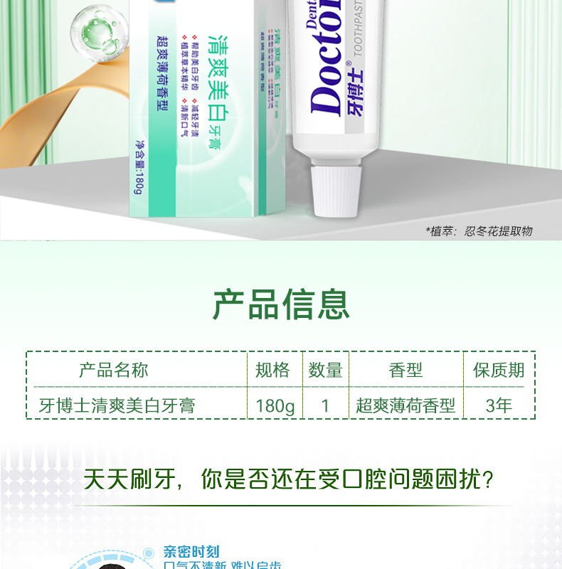 容量:180g 保质期:3年 1.植萃草本精华添加忍冬花提取物清爽口感,保持口腔健康 2.有效洁白牙齿减轻牙渍,减少软垢减少牙菌斑,洁白牙齿 3.保持口腔健康维护牙齿和牙周组织健康