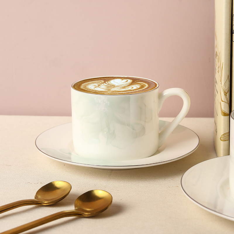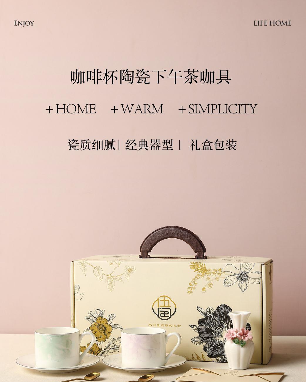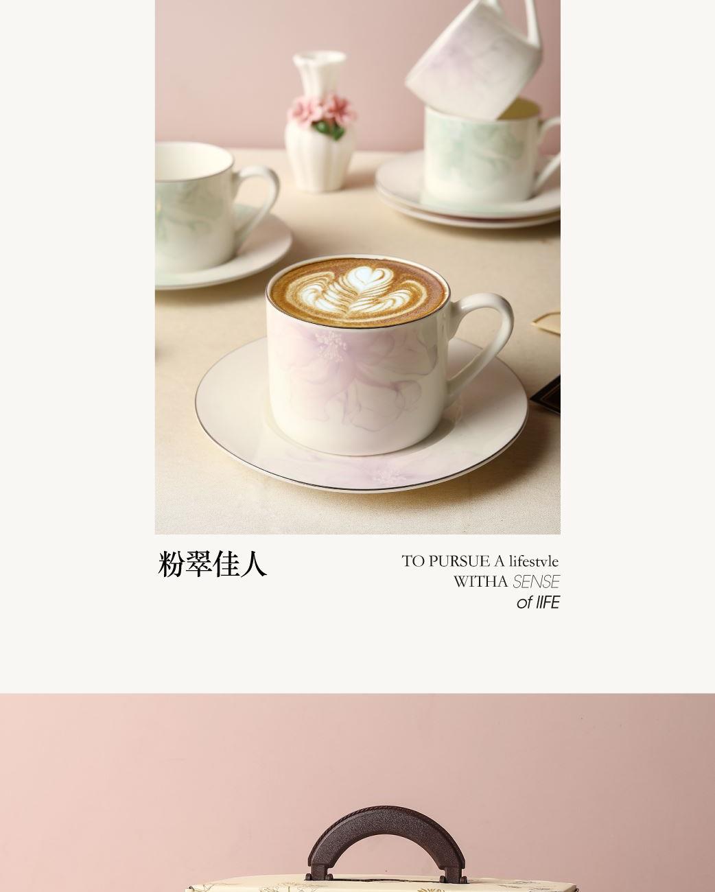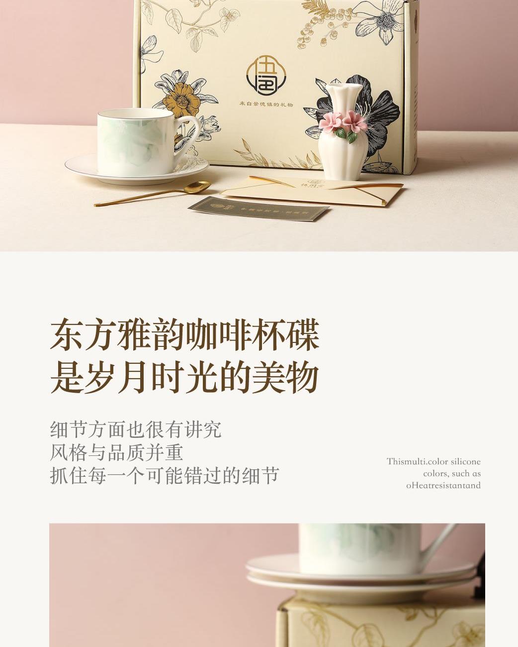 产品组成:茶咖杯1、碟子1、花瓶1、勺子1 产品材质:高骨瓷 产品工艺:贴花+描金 包装尺寸:30.5*18.5*11.5cm 外箱尺寸:48*32*40.5CM