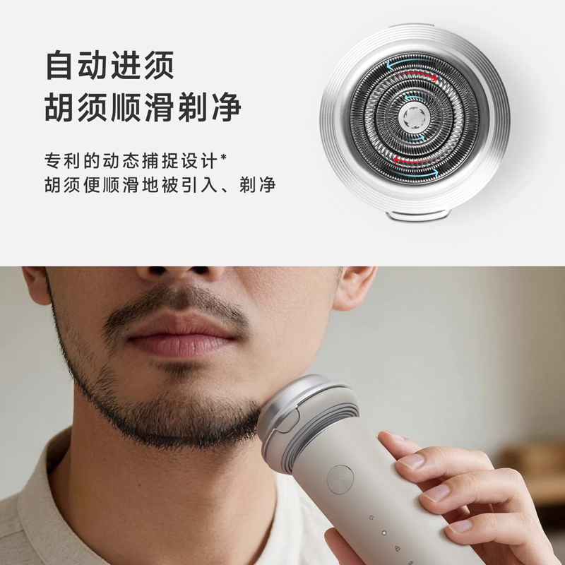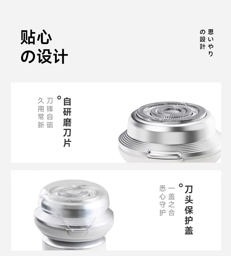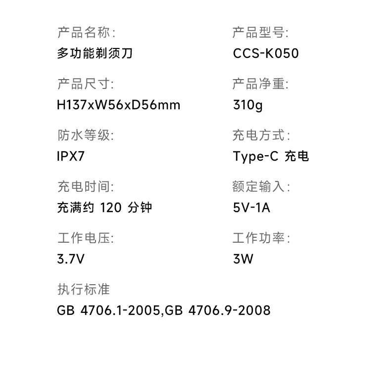 产品型号;CCS-K050 额定电压:5V⎓ 额定功率:3W 防水等级:IPX7 使用方式:干湿双剃 充电方式:type-c充电线 刀头材质;精钢 配备四种刀头,满足多种使用需求 创新旋转外刀网,自动寻须,剃须不遗漏 4D 维度,双层九叶刀片,贴面剃须更顺滑 Type - C 接口,充电便捷 不锈钢三层网罩,耐用亲肤 全身水洗,清洁无压力