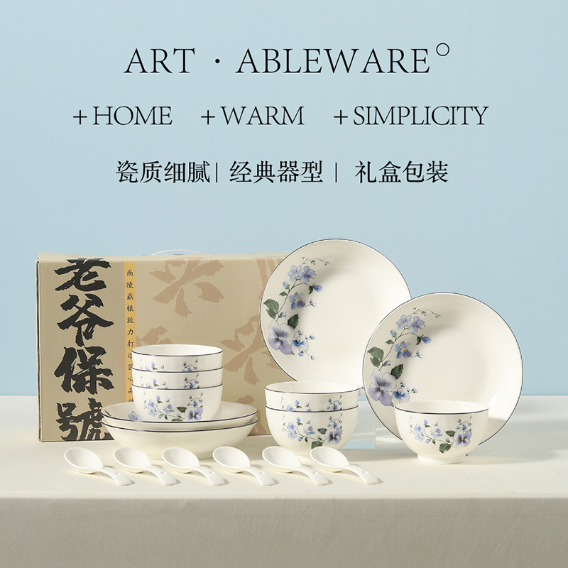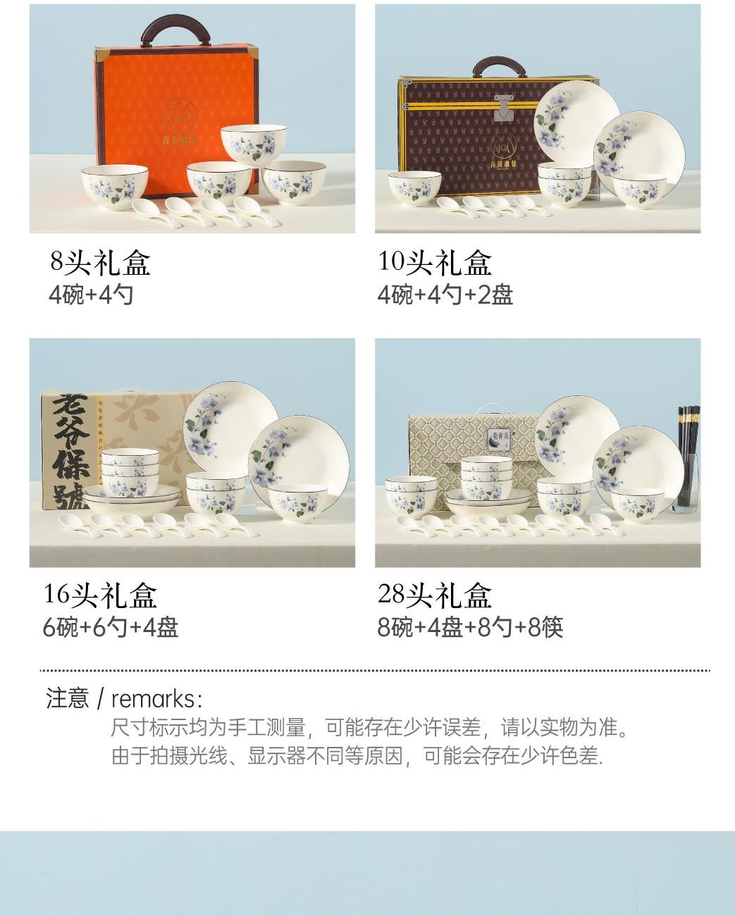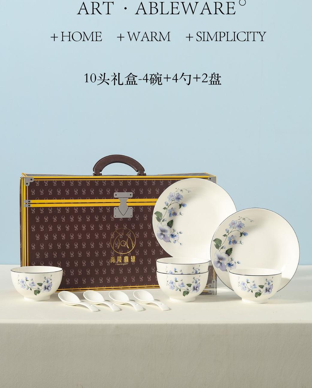 产品组成:6碗+6勺+4盘+礼盒 产品材质:高温瓷 产品工艺:烤花+素烧 产品规格:4.5寸碗,三弯小勺,8寸盘 包装尺寸:40*12.5*25cm 外箱尺寸:41*38.5*50.5cm