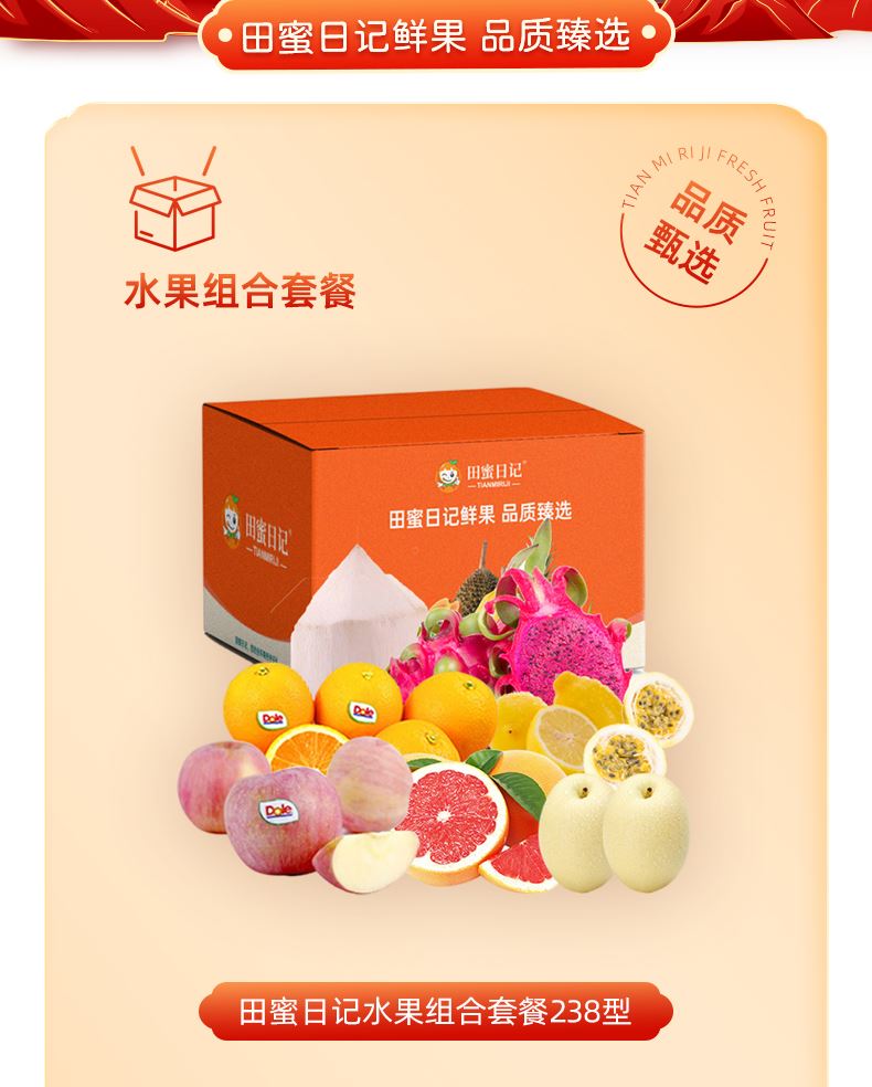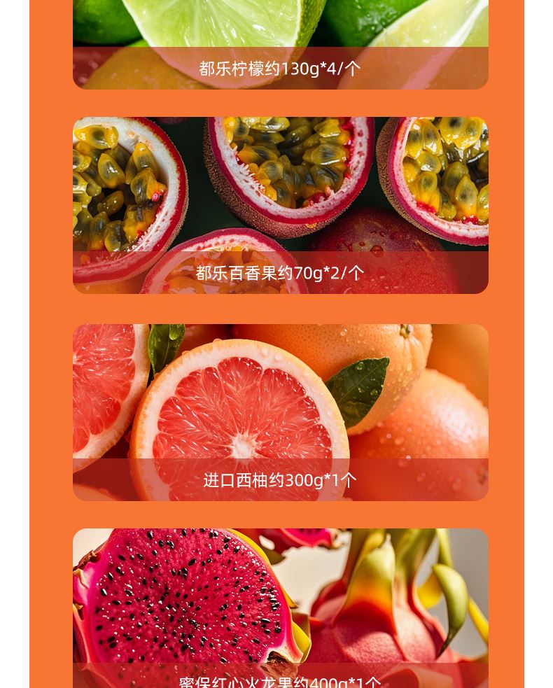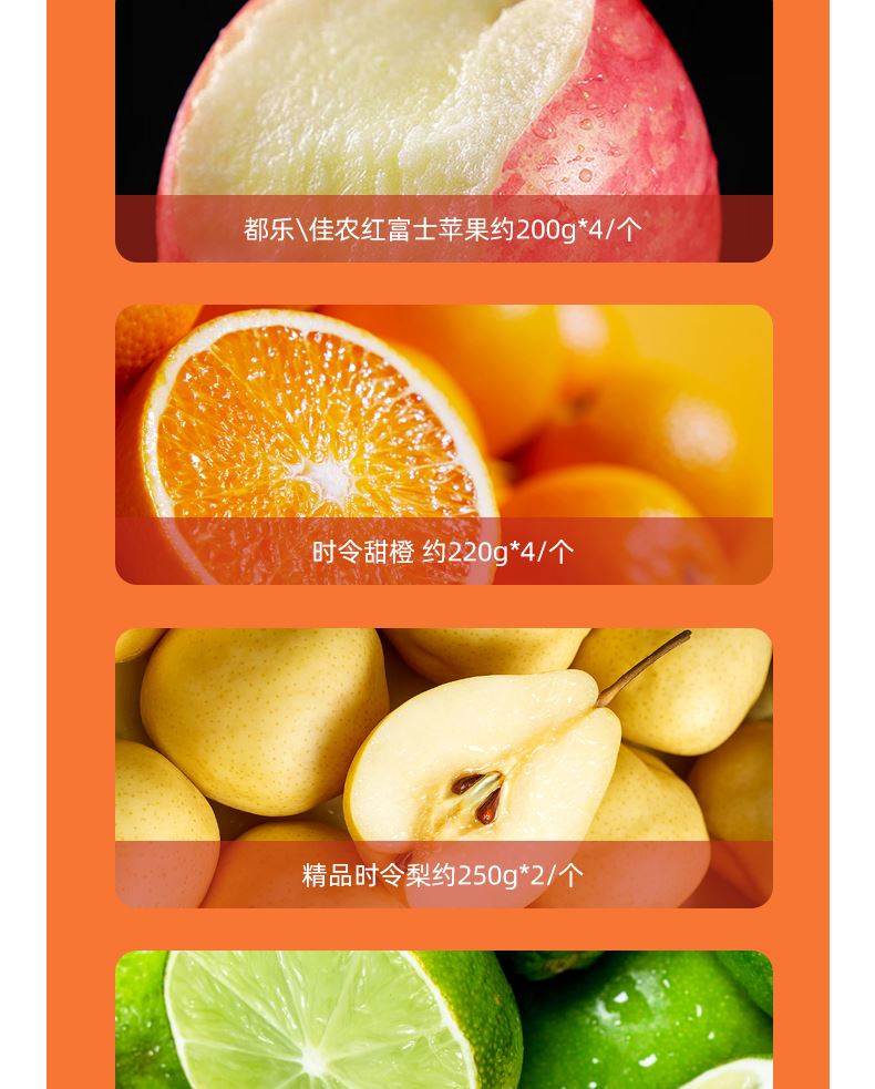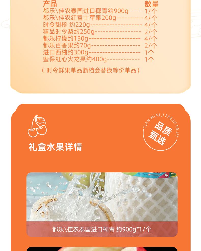 都乐\佳农泰国进口椰青约900g*1/个 都乐\佳农红富士苹果200g*4/个 时令甜橙 约220g*4/个 精品时令梨约250g*2/个 都乐柠檬约130g*4/个 都乐百香果约70g*2/个 进口西柚约300g*1个 蜜保红心火龙果约400g*1个 ( 时令鲜果单品断档会替换等价单品)